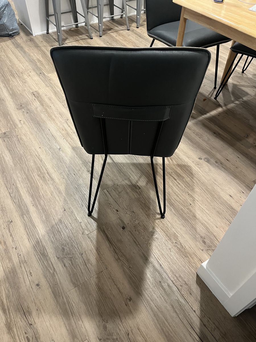 VenmoSet of modern dark gray faux leather dining chairs with metal hairpin legs. 4 chairs in total all in pristine condition Clean, sturdy, and comfortable. These have a sleek, minimalist look that works great in a dining room, apartment, or kitchen space.
