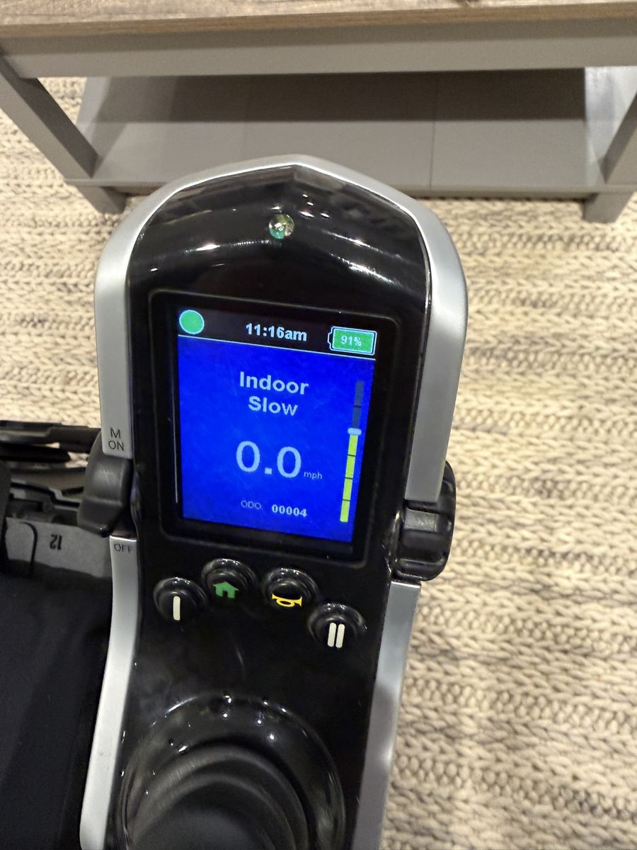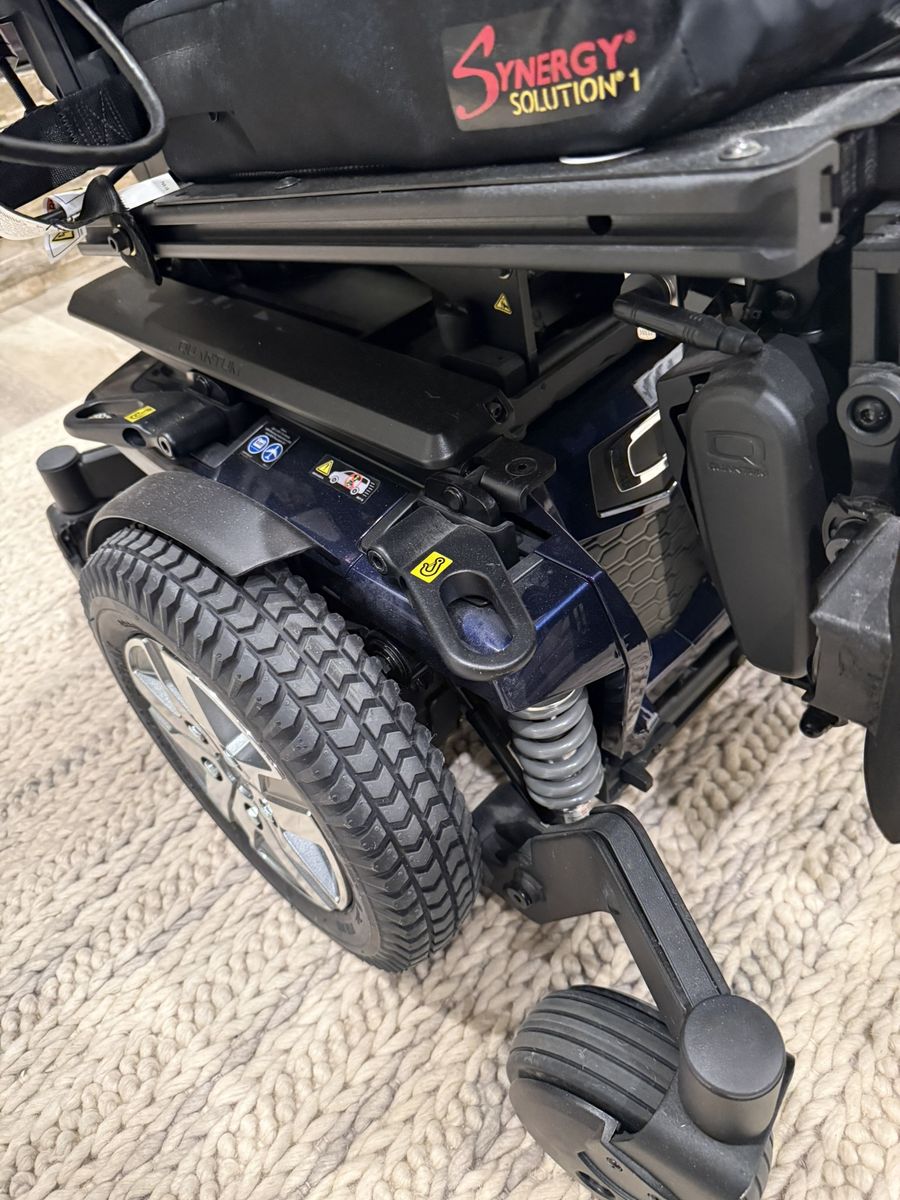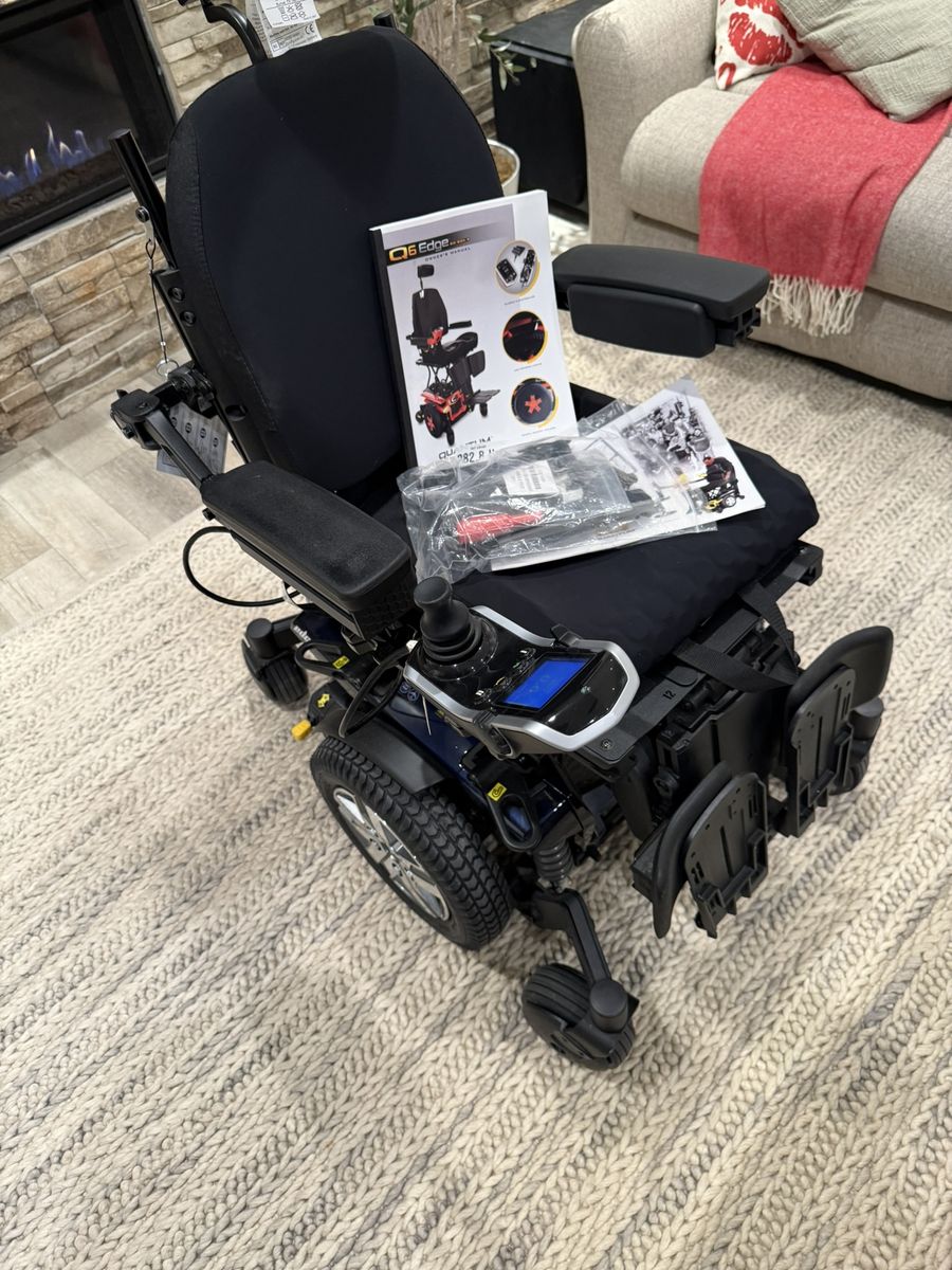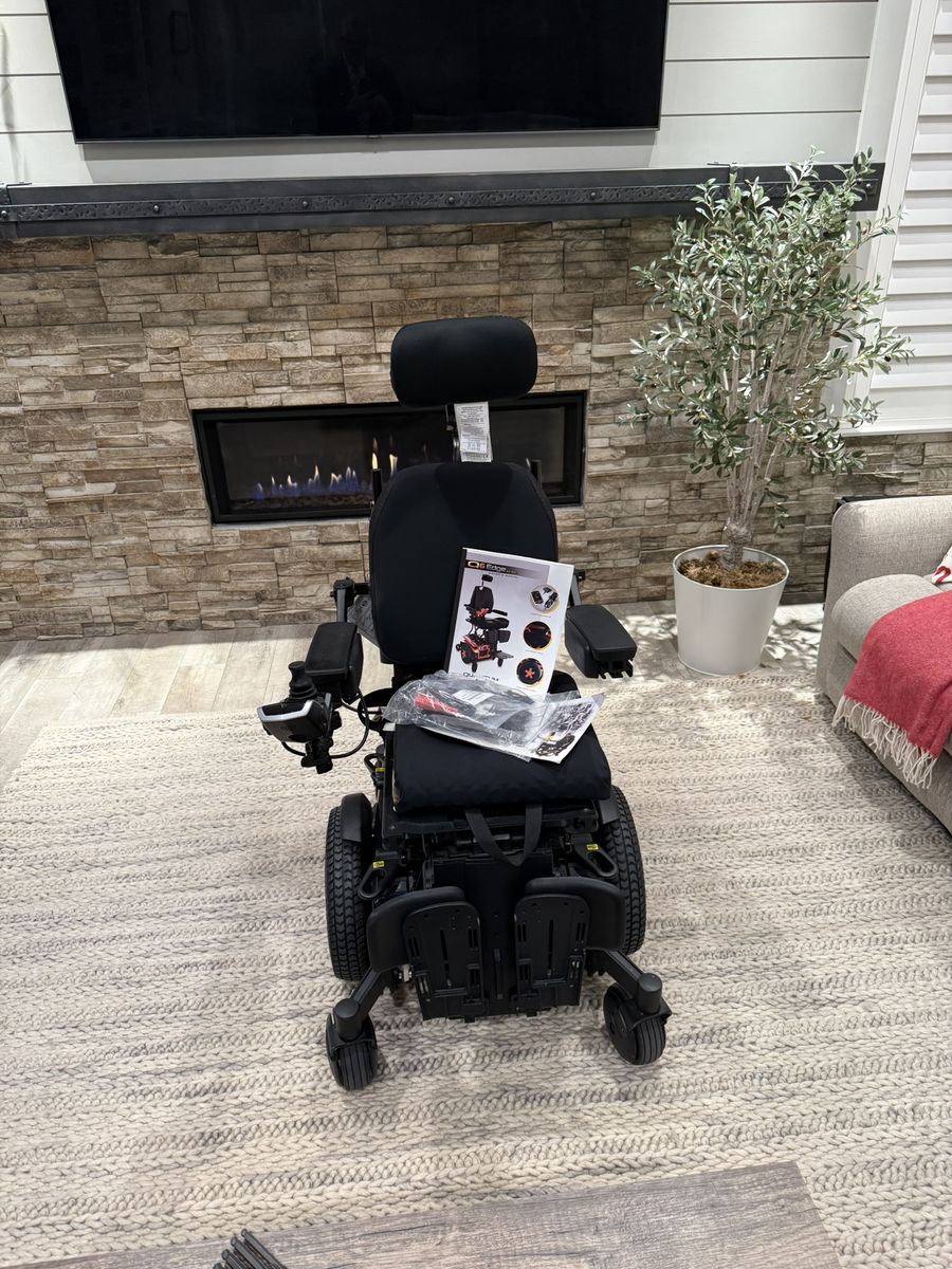 Like new. Used only for a few miles. Has upgraded Synergy Seat Cushions, Automatic Seat Recline, Q-logic 3 Controller Joystick with Advanced Drive Control System with Bluetooth Programming, LED Fender lights, I Level for stability, 2 Long-lasting 12 volt deep-cycle batteries, Spring Shock, with manual freewheel mode or driver mode possible, weight capacity up to 300 pounds, maximum speed 6 mph, turning radius 20.5 inches, ground clearance – 2.7 inches, 24 inch drive wheels, Two motor mid-wheel 6 drive train, Range up to 17.71 miles, ATX Suspension with extra stability, Length 35.5 inches, Width 28.9 inches, adjustable armrests, Adjustable Fold up foot platforms