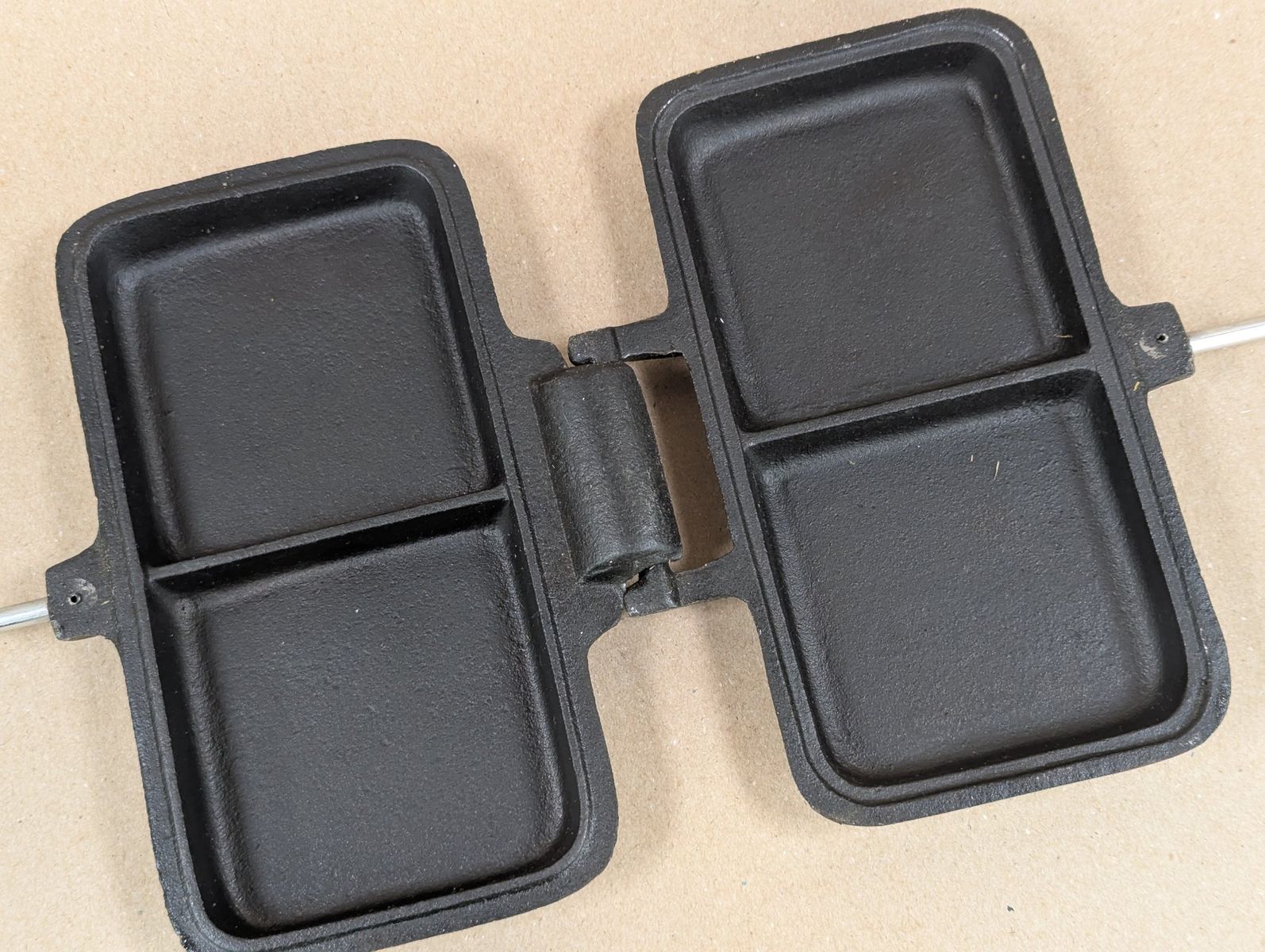 In good condition, showing limited signs of use. There may be a small amount of charcoal present on the handles. The cast iron may have some signs of being put into a flame. The interior of the s'more making cavities are extra clean.