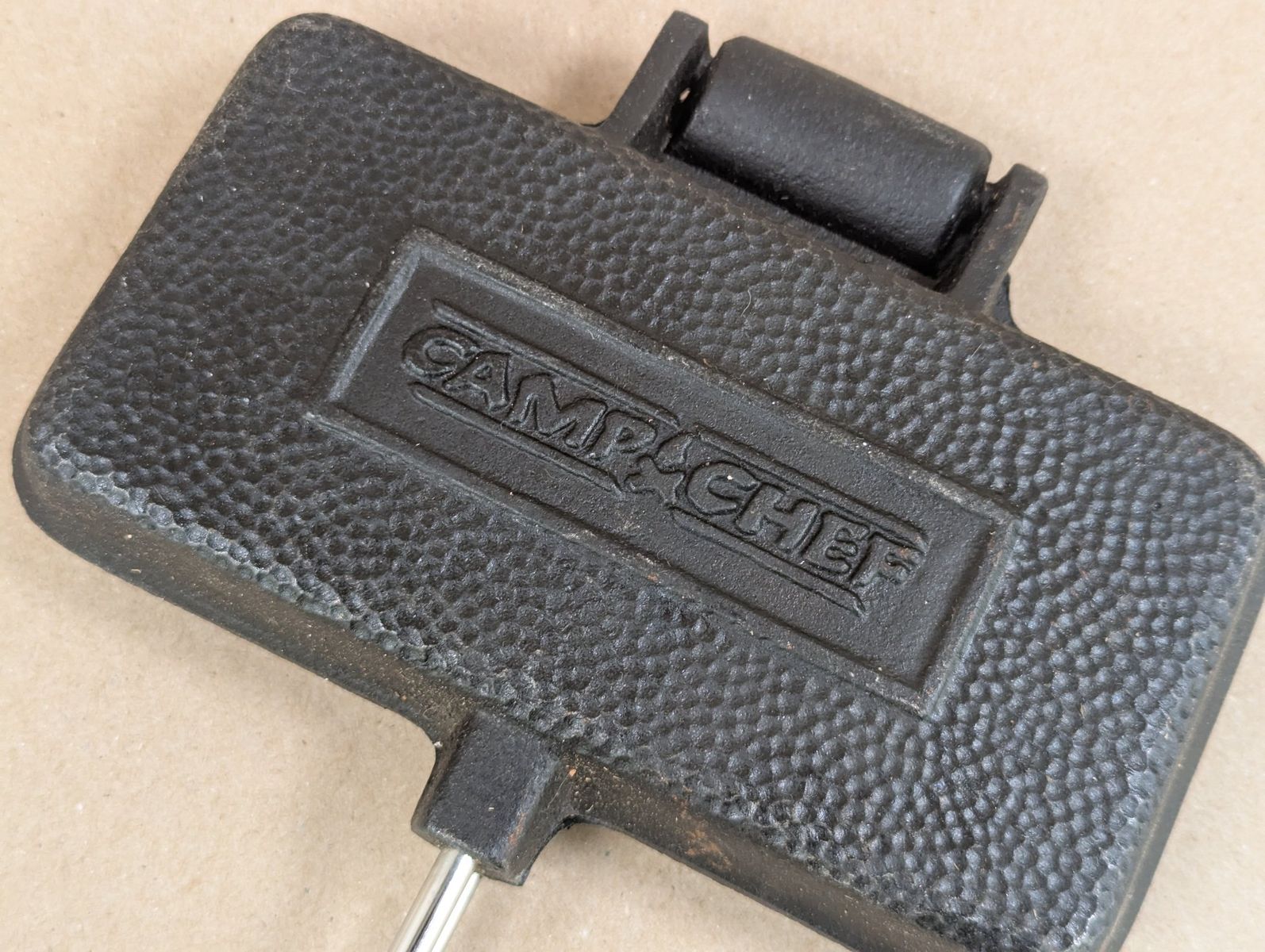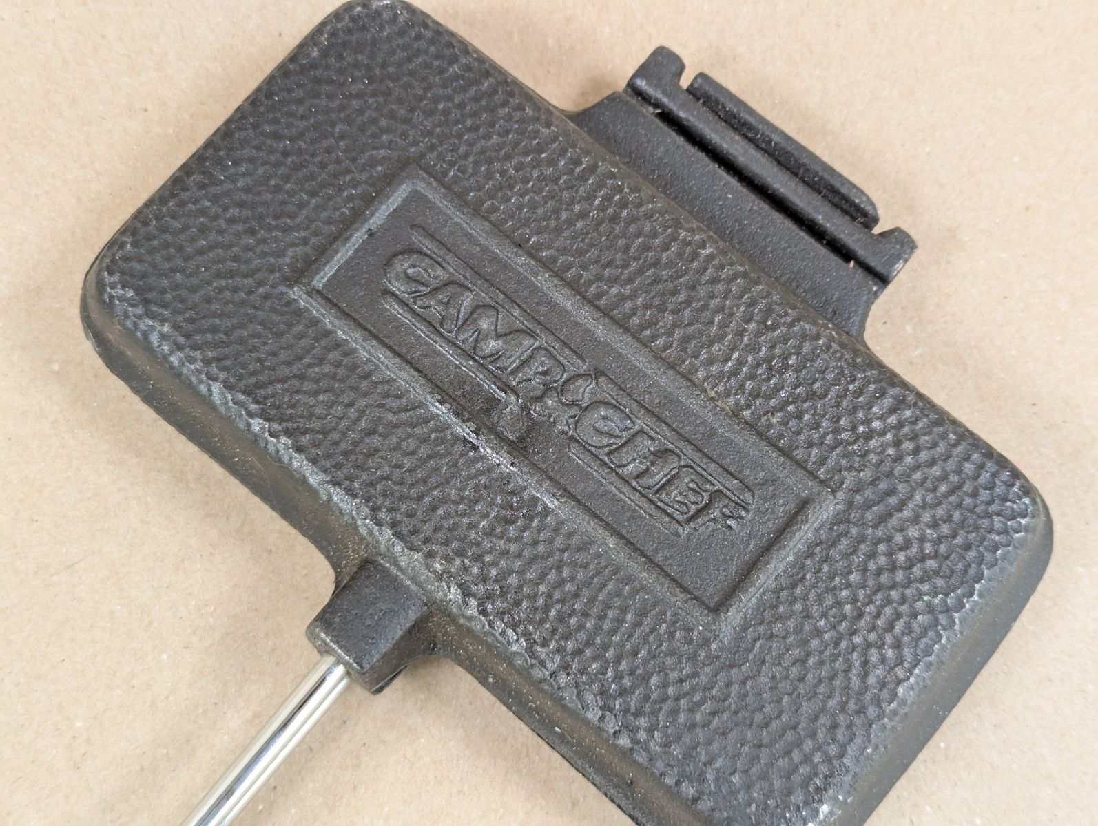GooglePayThis is a Camp Chef sandwich iron, designed for campfire use. It features cast iron construction and is intended for making sandwiches or s'mores over an open flame. The iron has two cavities for cooking. It appears to be well-suited for outdoor cooking activities.