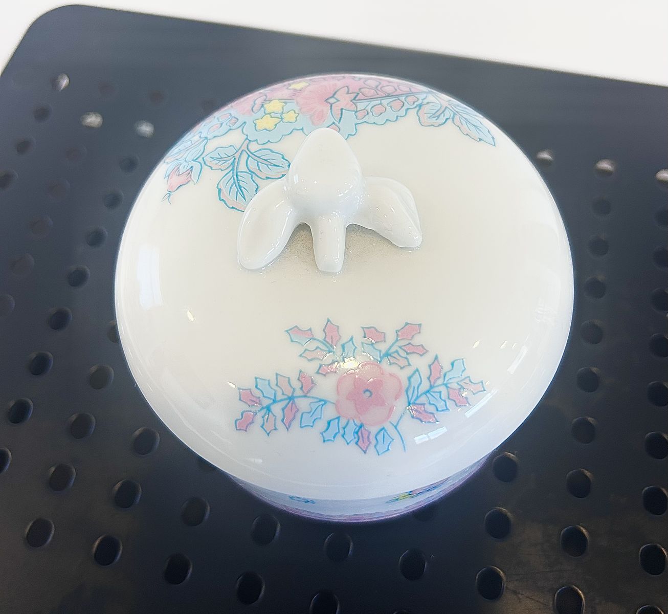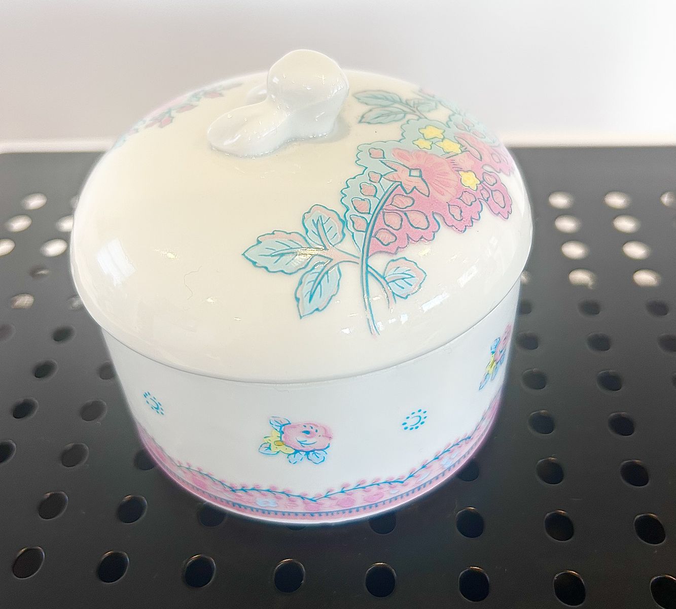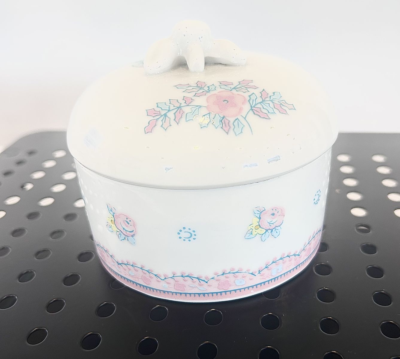 Venmovintage Elizabeth Arden lidded trinket dish or vanity jar, featuring a delicate floral design and manufactured in Japan.