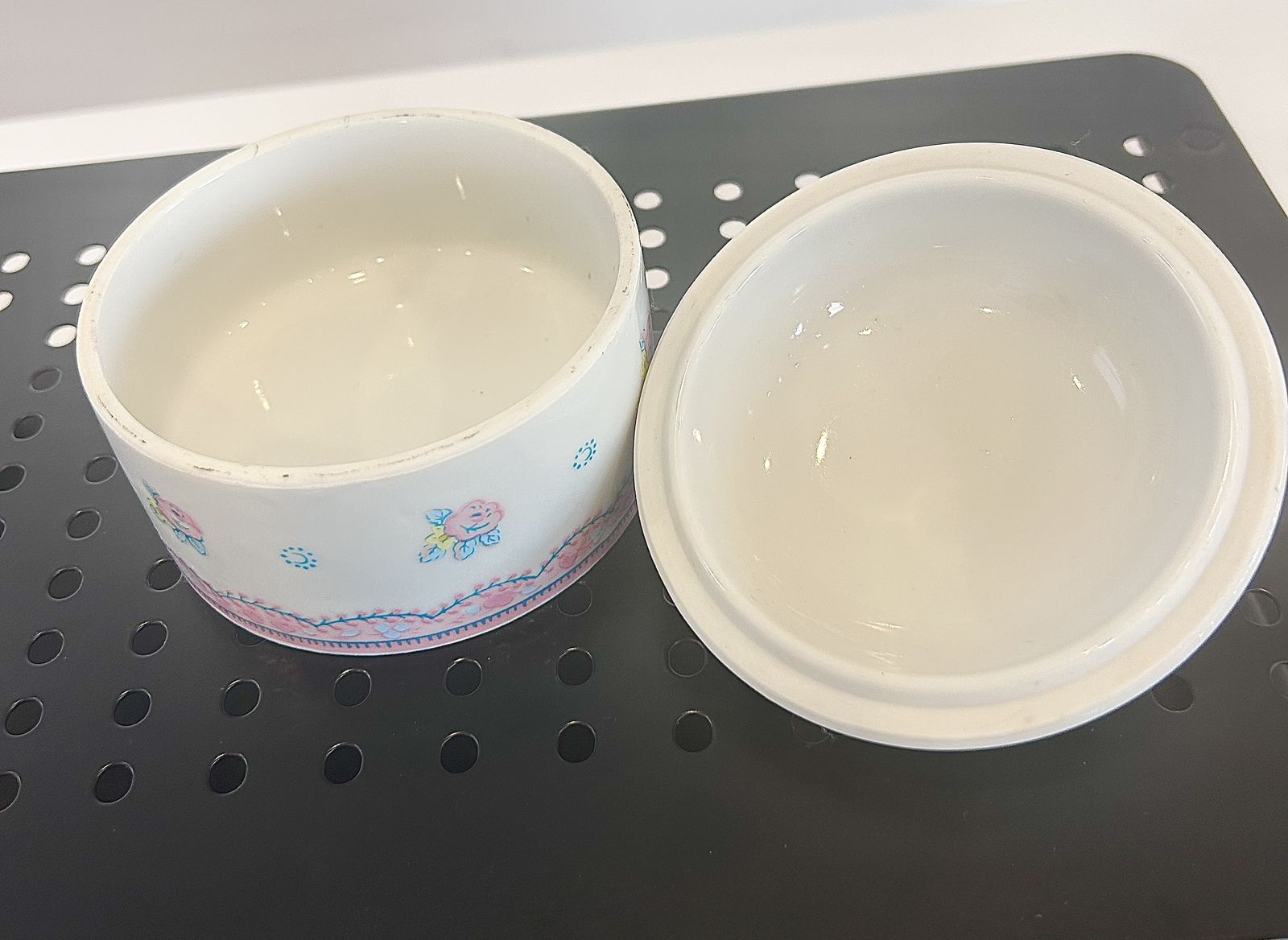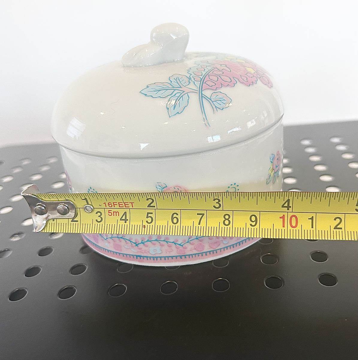 Purpose: Designed as a vanity or dresser accessory for holding rings, pins, or small keepsakes.