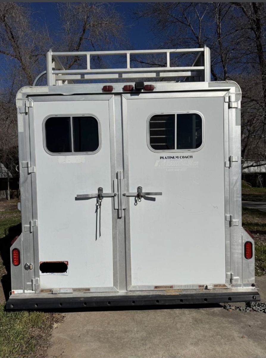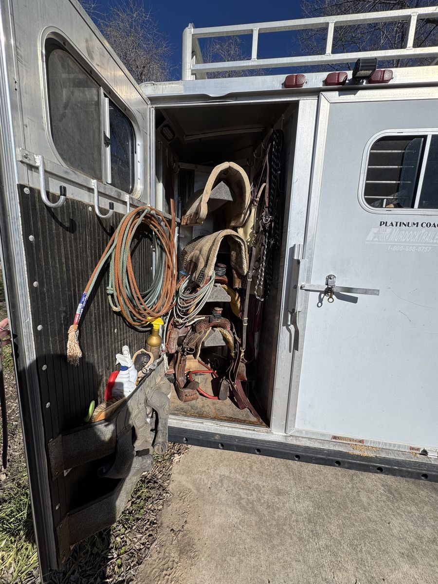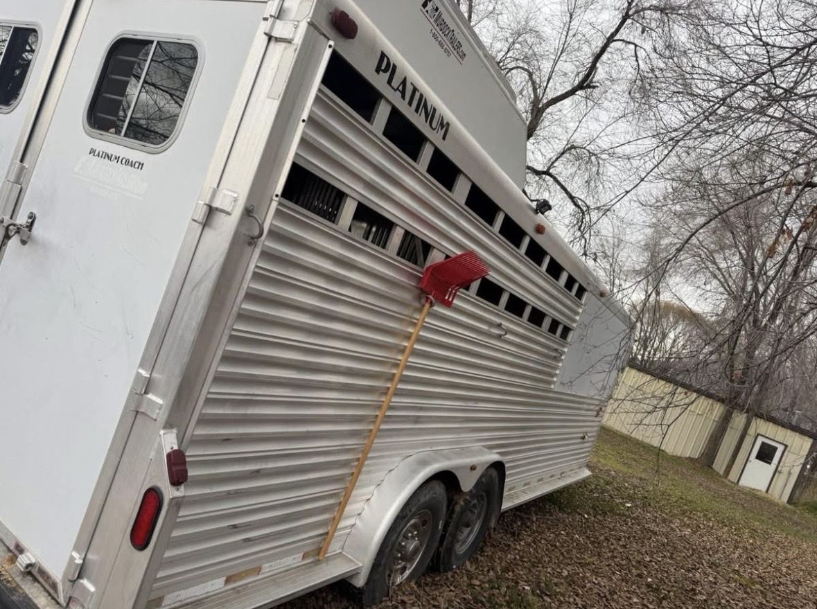 2001 4 horse Platinum weekender. TV, DVD player, big closet and lots of cabinet space for for the size. Couch pulls out to a bed. Shower but no toilet. I’ve loved this trailer and is so convenient to stay a couple nights and also pull around town. Floor is solid and everything on the trailer works. It does need a new battery due to being old. It has 50 gallon water tank in back tack for filling up water buckets, hay rack, mangers with stud stall and escape door. 14 ply tires put on just under 2 years old. Drop down doors at head side with the stock rails on the rear. 32k OBO