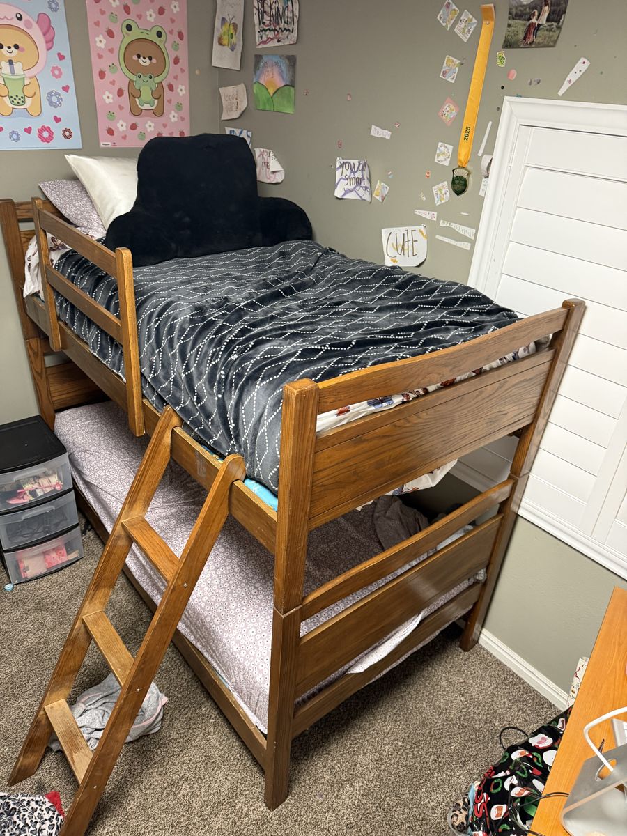Twin bunk bed. Easy to set up no tools needed. My girls wanted a room makeover so they got new beds. Bunkie boards and mattresses included