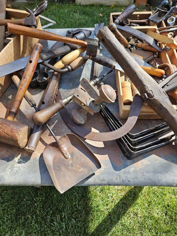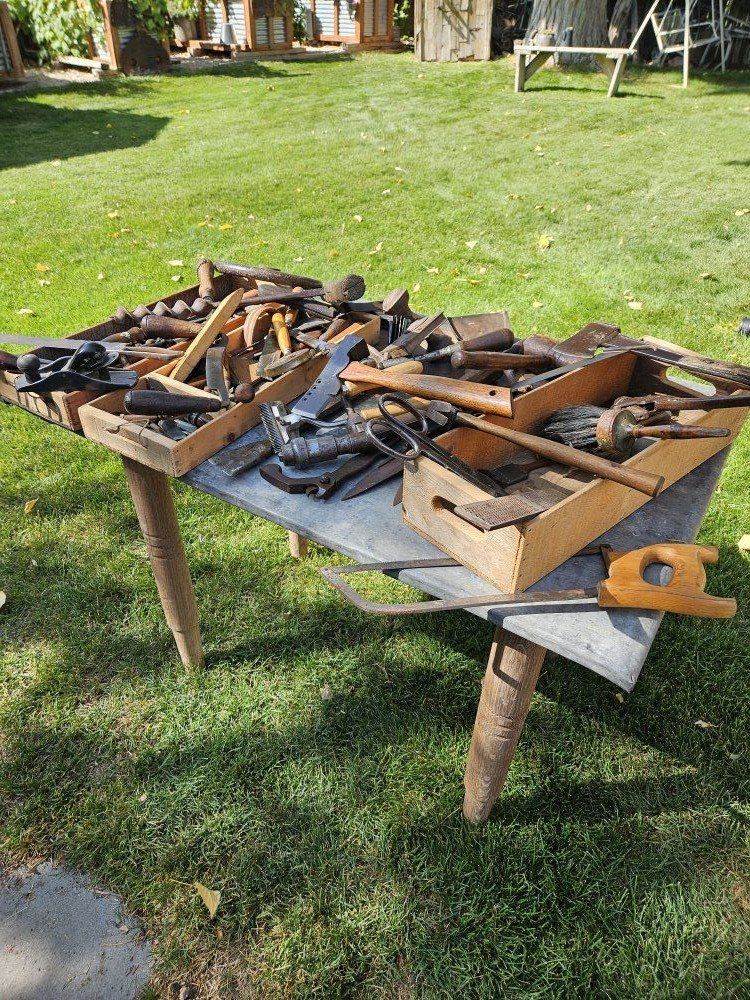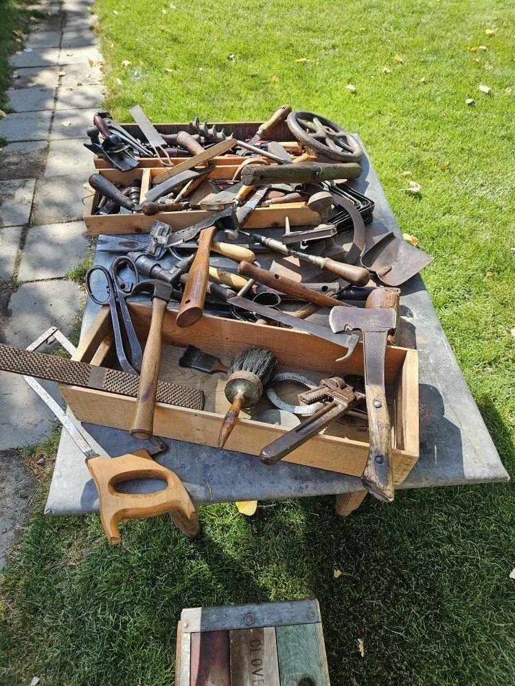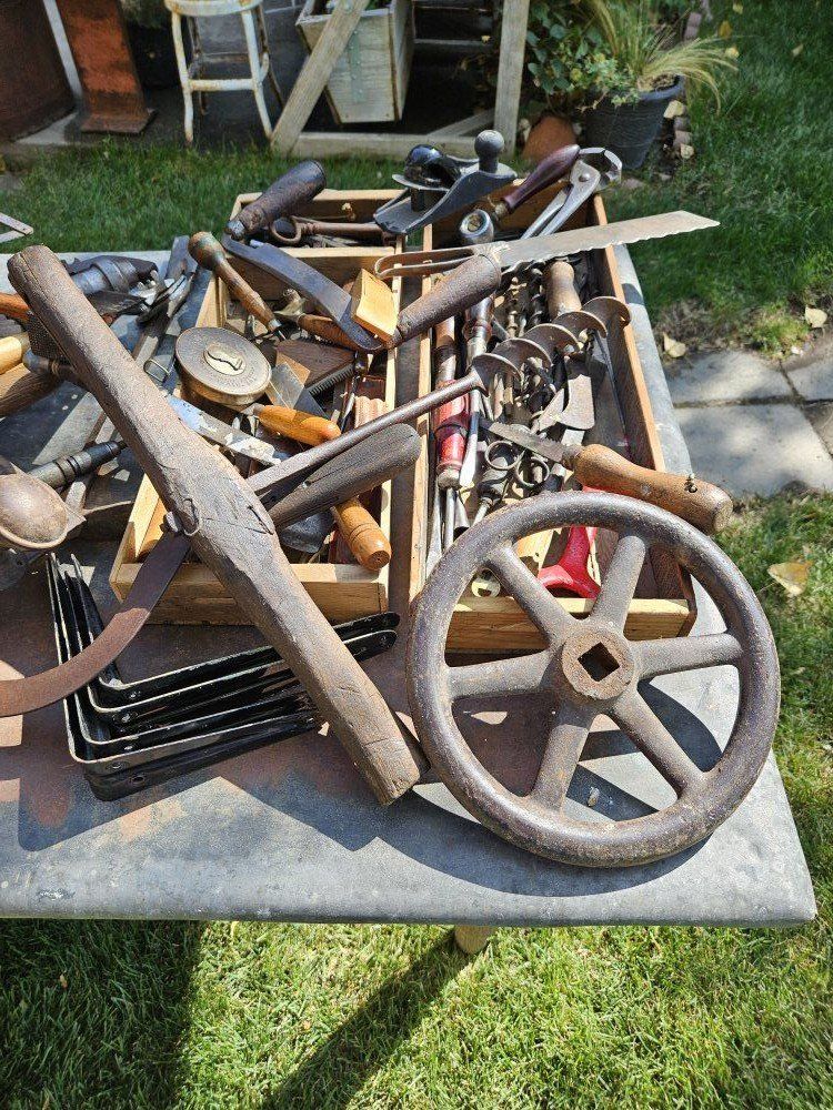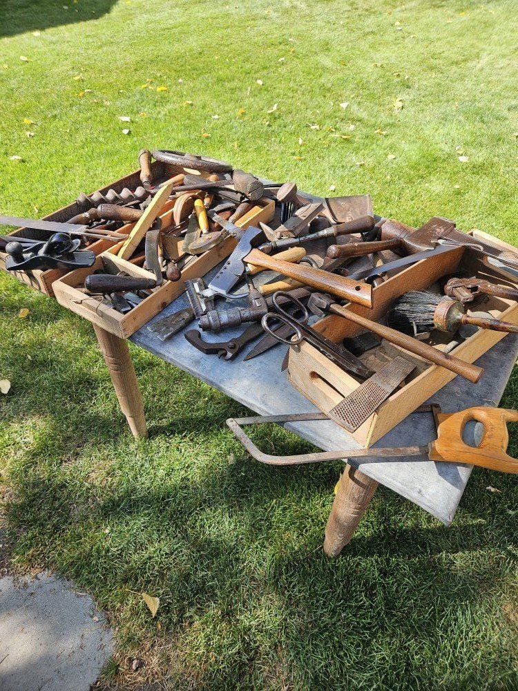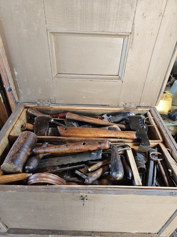 This antique wood toolbox comes filled with a variety of antique tools. Everything you see in the pictures is included. There are three drawers that fit inside the toolbox.