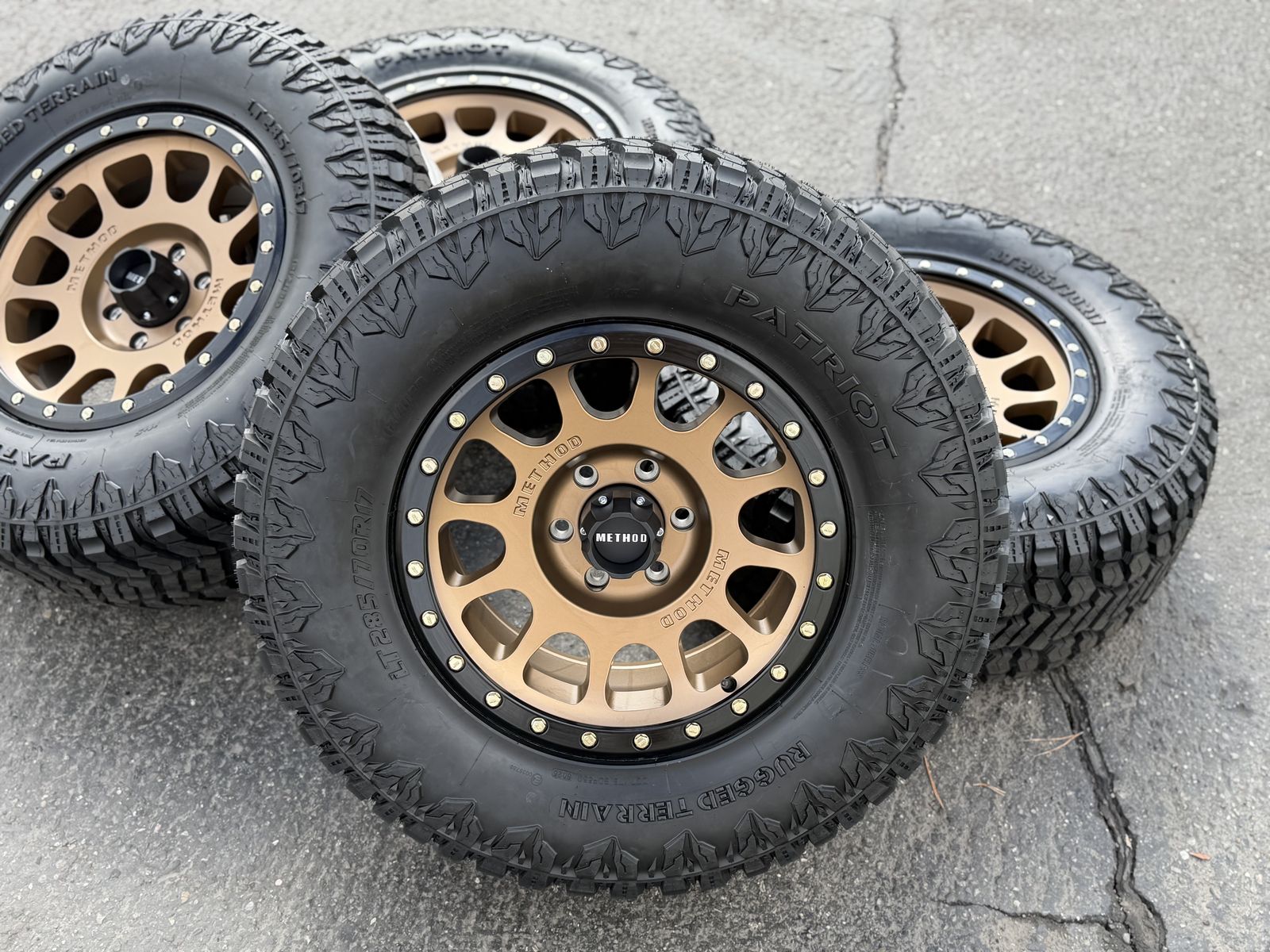 ApplePayBrand new package 17x9 00et offset Method MR305’s. Bronze finish with black bead. Mounted and balanced on LT285/70r17 Patriot RT. Load E 10 ply. 6x135 bolt pattern. These fit 2004 and newer Ford F-150 and expedition. Huge savings call or txt 435-760-1194