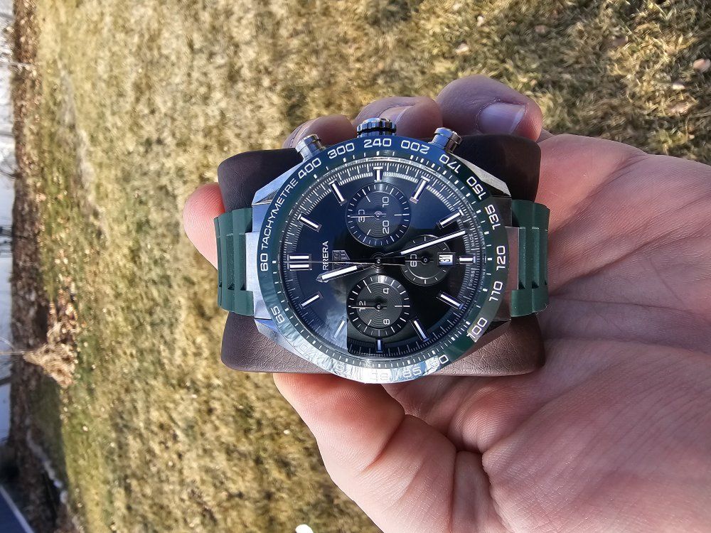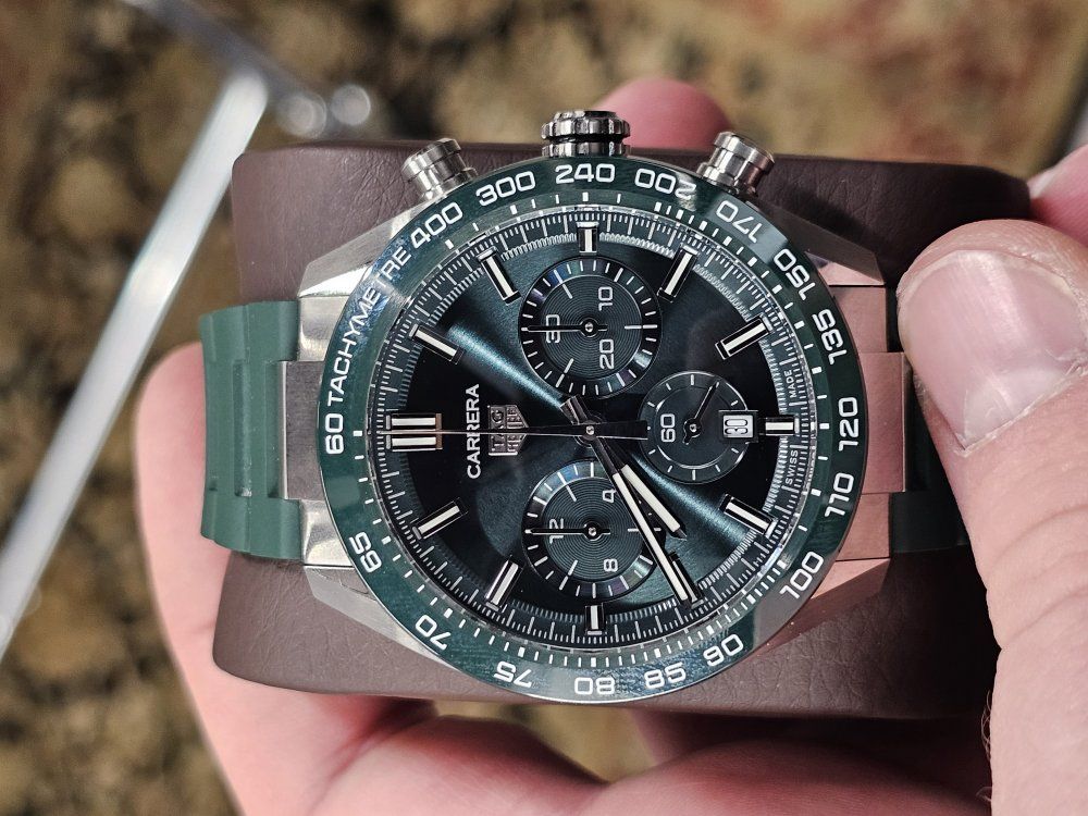 ZellePrice negotiable. Offered for sale is my TAG Heuer Carrera Chronograph, originally $7,000+. Featuring a green sunray dial paired with a matching green rubber strap, sized to 7.25", with a micro adjustable clasp. The watch is powered by the TAG Heuer Calibre Heuer 02, an in-house automatic chronograph movement with an 80-hour power reserve, visible through the sapphire caseback. The 44mm case wears comfortably thanks to its curved case and balanced proportions, while the ceramic bezel adds durability and a fun look. Happy to provide more pics/vids upon request. No box or papers. Purchased from Watches of Switzerland.