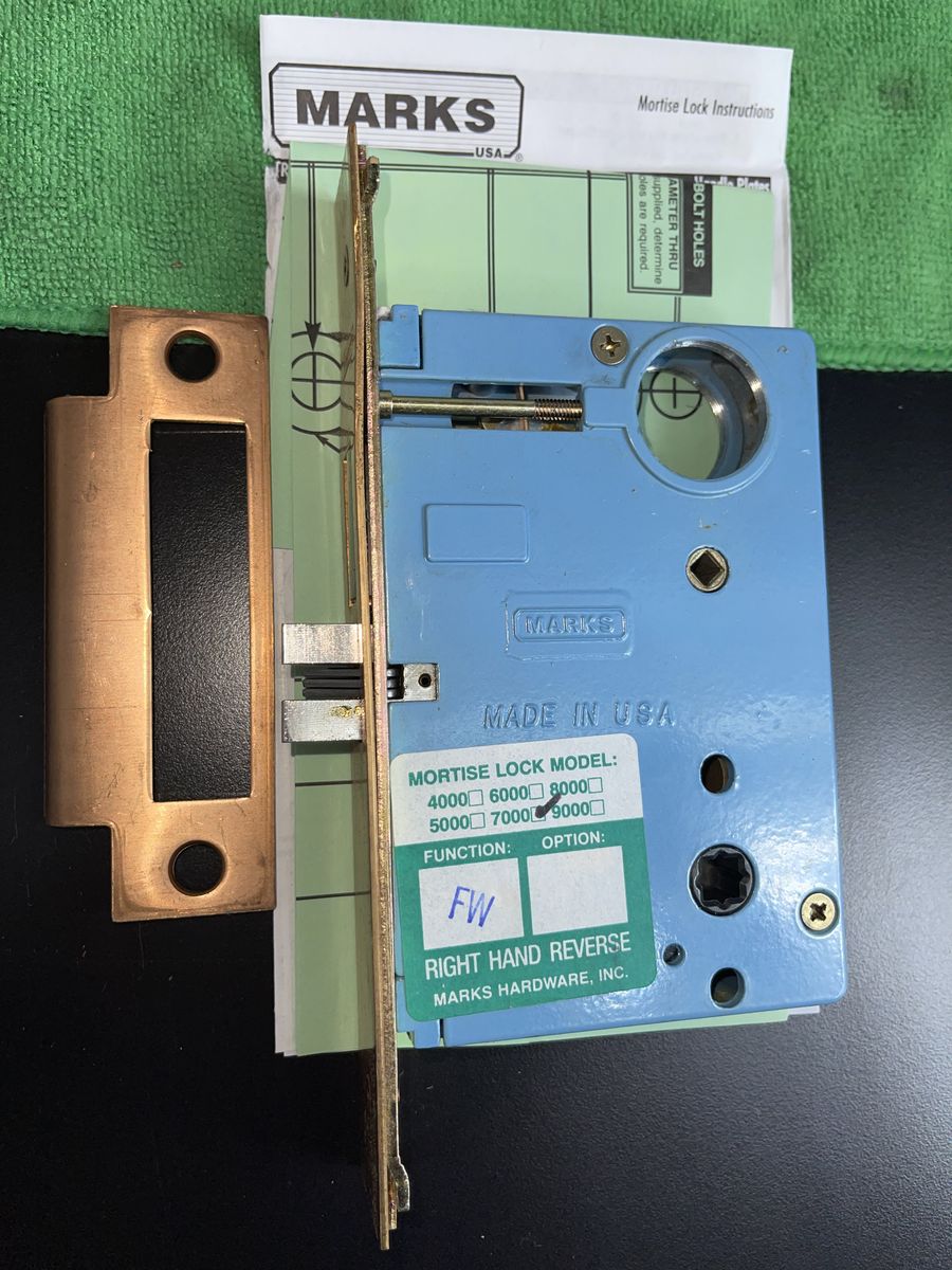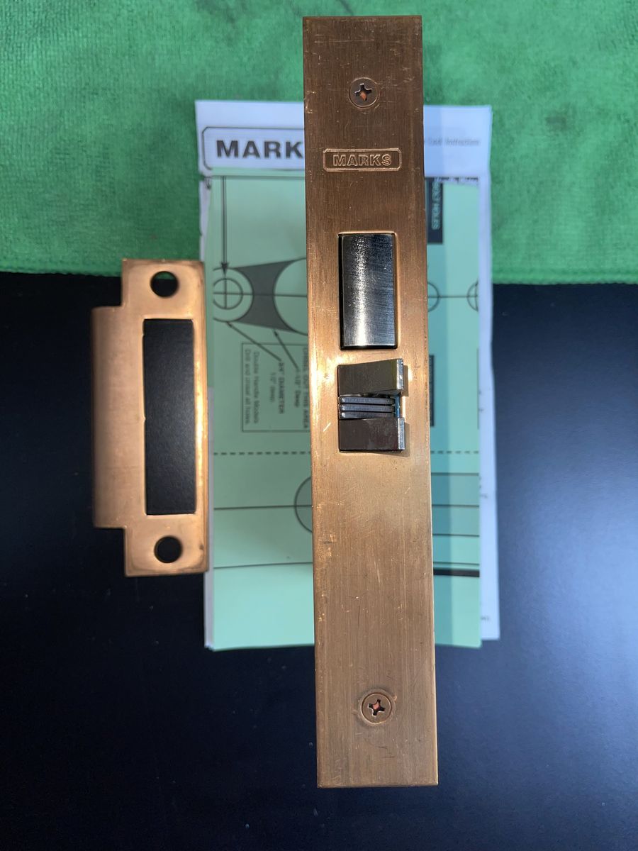 The MARKS Heavy Duty Mortise Lock Body 7FW/10A in the custom color of Satin Bronze is a high-quality, right-hand reverse lock body designed for use on Dormitory doors. New in box (new old stock), it includes a strike plate, screws, and instructions for easy installation. With a 2.75-inch backset, and 1-inch bolt throw length, this Grade 2 series 7 lock is reliable and durable. The satin bronze finish adds a touch of elegance to any door, making it a stylish and functional choice for home and commercial properties.