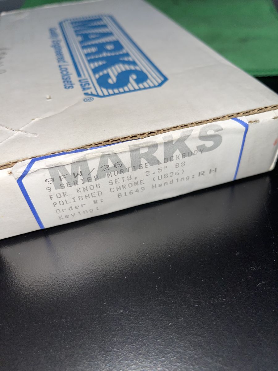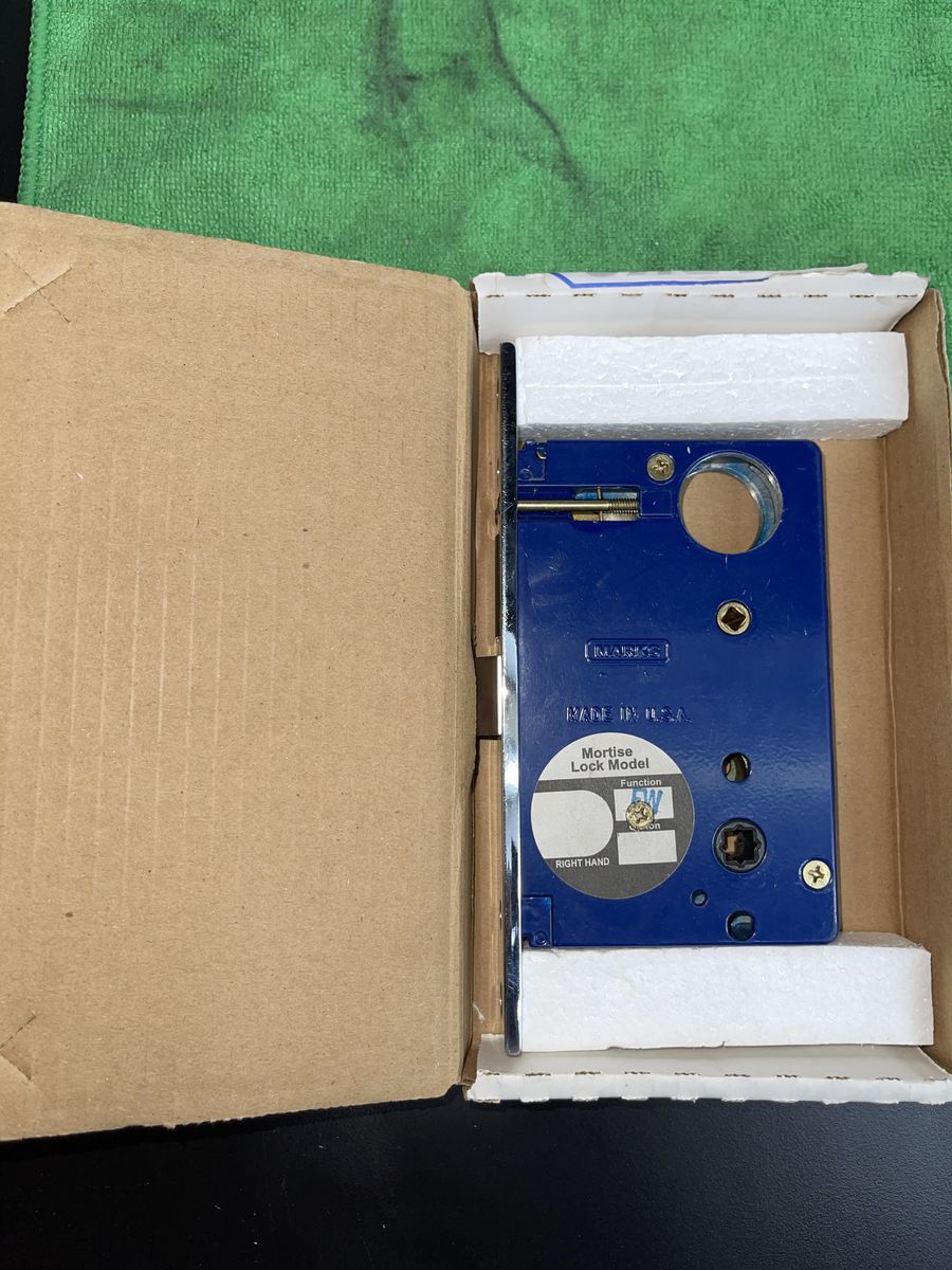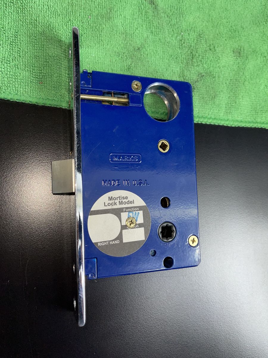 The MARKS Heavy Duty Mortise Lock Body 9FW/26 in the color of chrome is a high-quality, right-hand lock body designed for use on Dormitory doors. New in box (new old stock), it includes instructions for easy installation. With a 2.5-inch backset, and 1-inch bolt throw length, this Grade 2 series 9 lock is reliable and durable. The chrome finish adds a touch of elegance to any door, making it a stylish and functional choice for home and commercial properties. NO STRIKE PLATE INCLUDED.