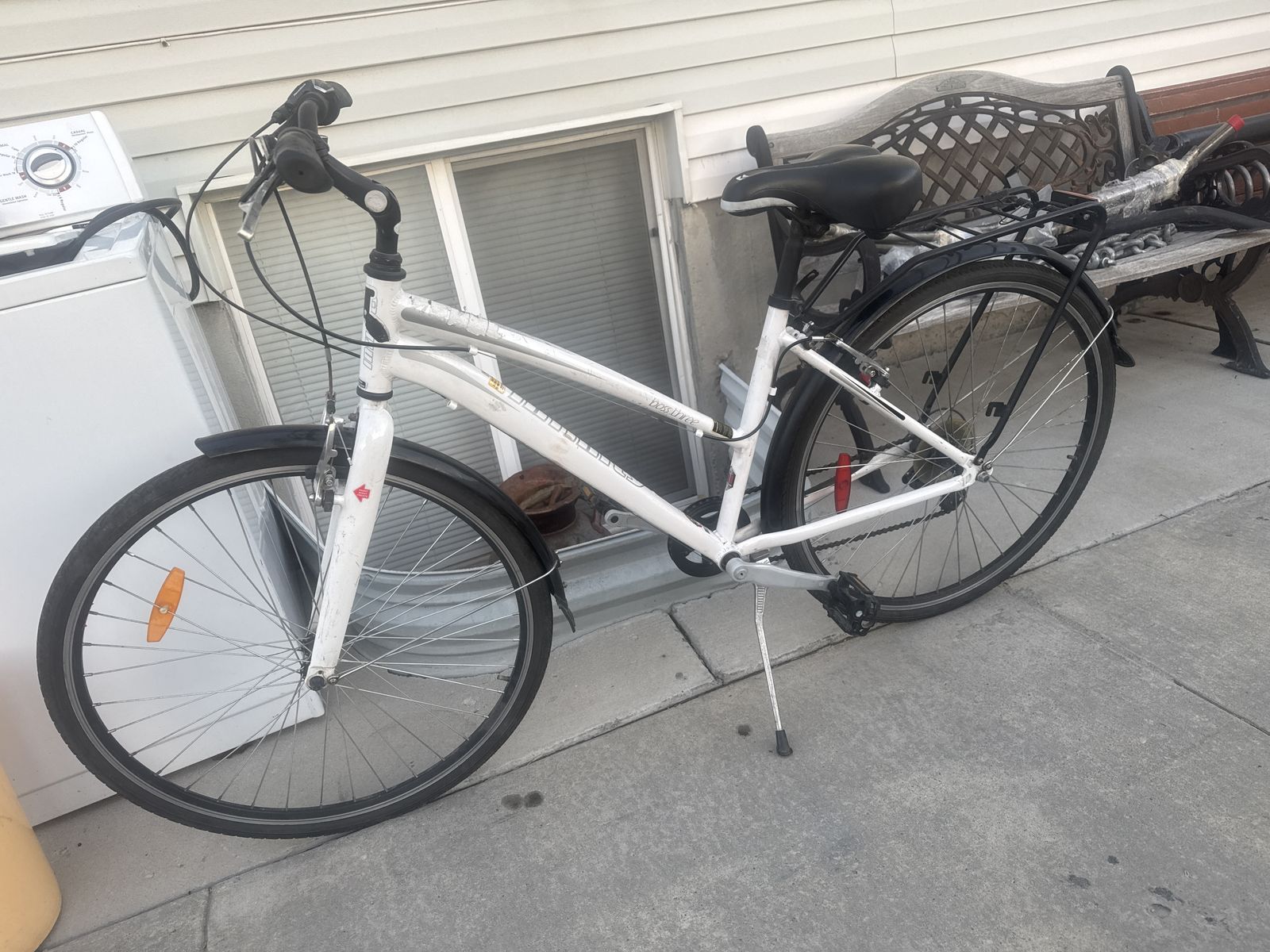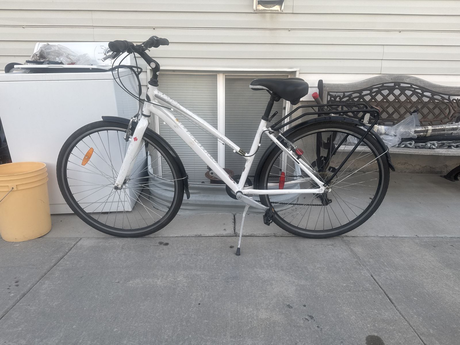 This bike is still in good condition still in good shape, both tires hold air , tire treads are still good. Tire size is 700 X 38C , pedals are good , seat is good, handle bars are good, aluminum frame is still solid & has no cracks , brakes, work great and shifters works great 7 speed , rides smooth