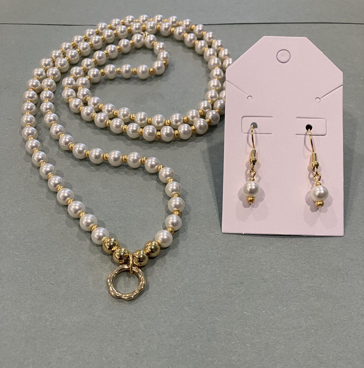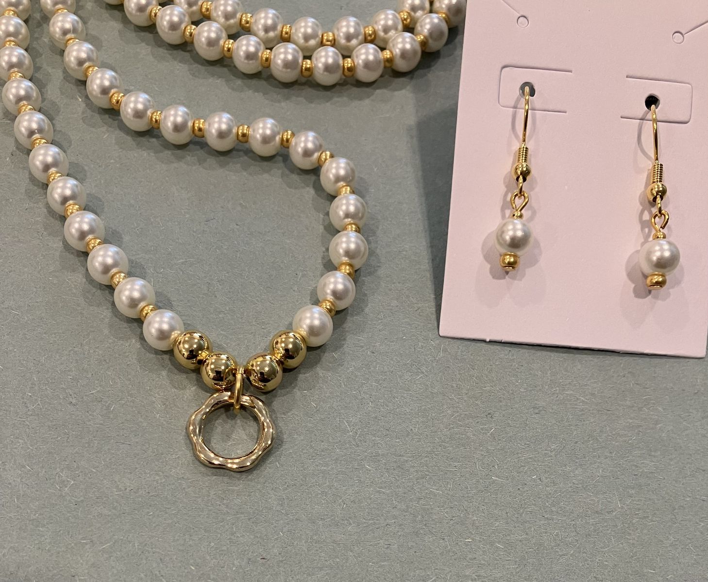 VenmoBeautiful, handmade 32 inch long, simulated beaded pearl necklace, with a gold colored round pendant and gold plated accent beads. Matching pearl earrings are dainty drop style with gold plated earwires. No need for a clasp due to length of this necklace for easy, comfortable wear. Gift box included. Local meetup or can mail with a ship fee.