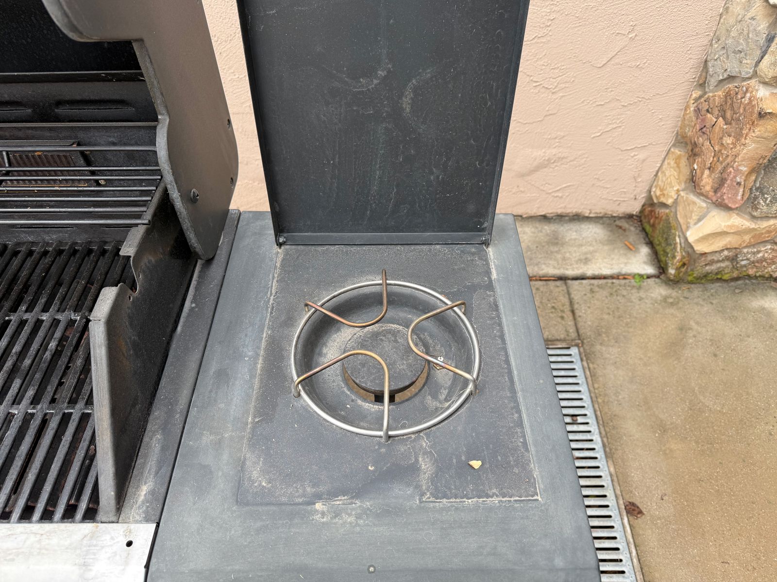 ApplePayPropane grill with 4 burners, electronic ignition, side burner, ceramic grate, accessory hooks, thermometer, and cover. Propane tank not included.