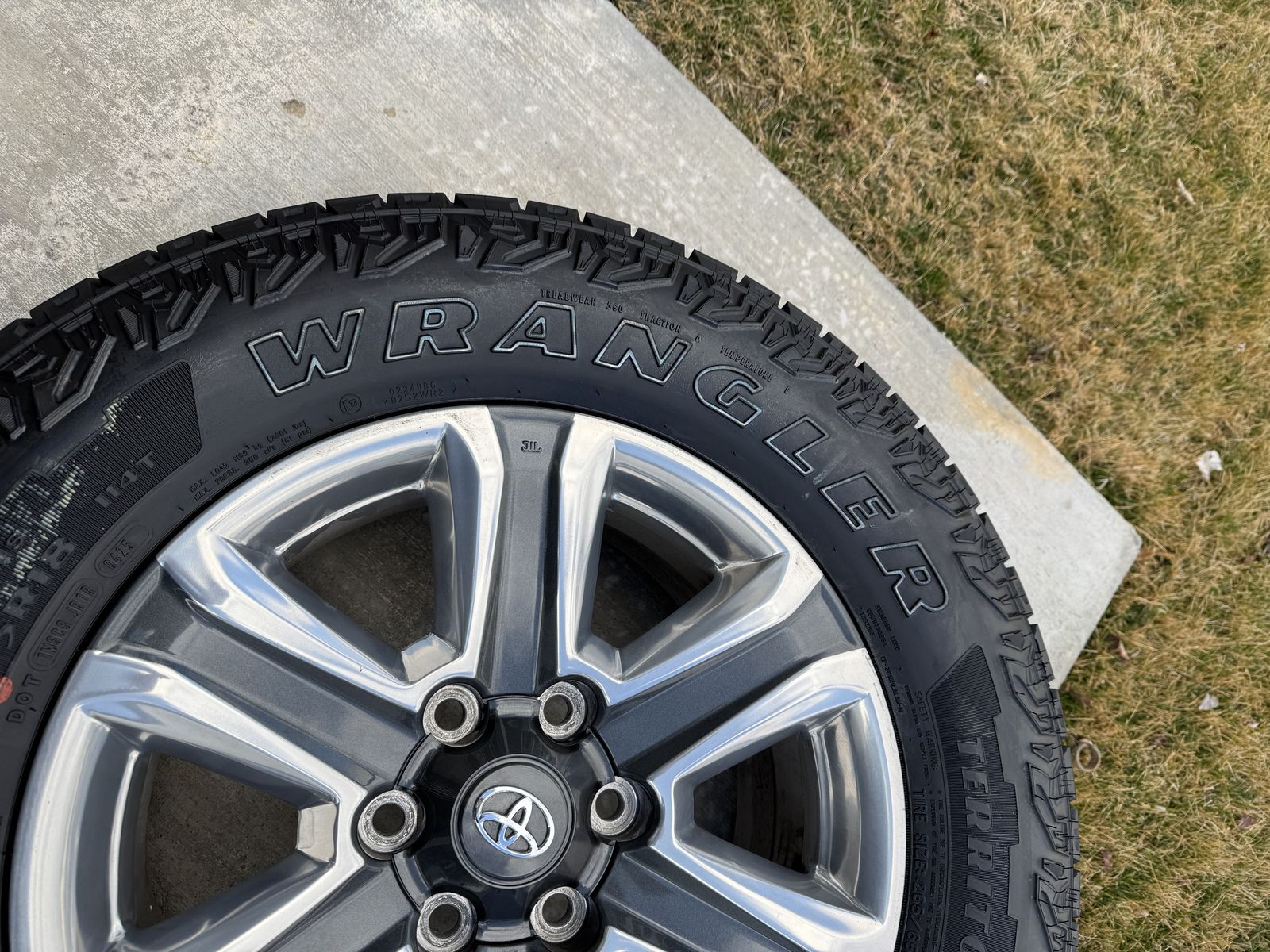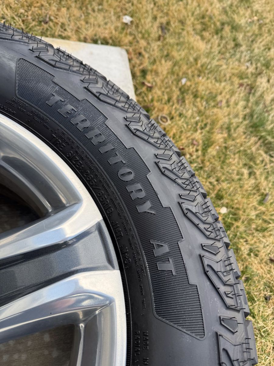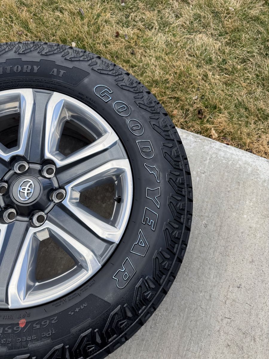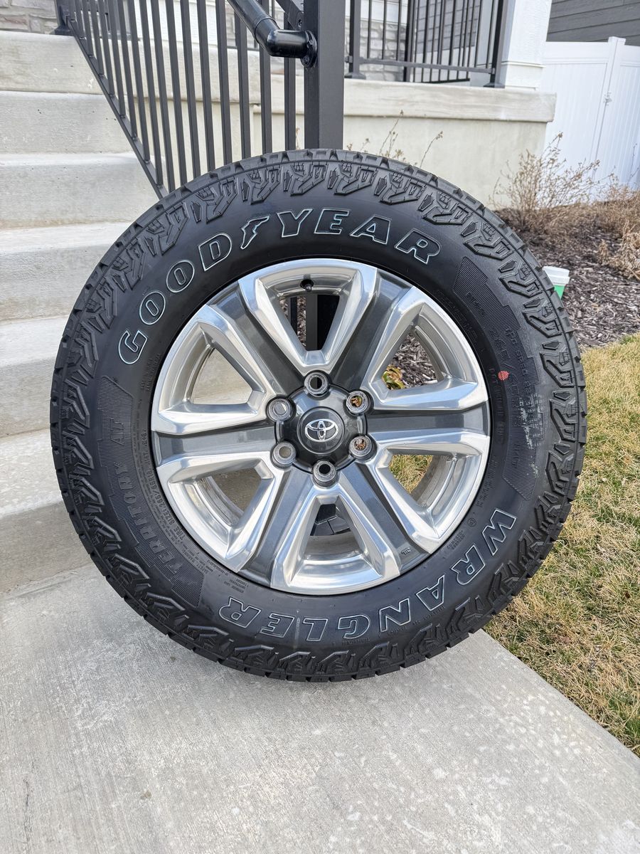 VenmoSet of 4-Toyota Tacoma 4Runner Rims and Tires 265/65R18 Goodyear Wrangler Territory AT Almost New in excellent condition asking $1250 obo Tires are new only 100 miles on them Rims are in great condition no curb rash I can sell the rims or tires separately Rims came off of 2021 Toyota Tacoma Bolt pattern 6-139.7 or 5-5.5 They will fit any Tacoma 4runner tundra sequoia fc cruiser Text anytime 385-402-2292