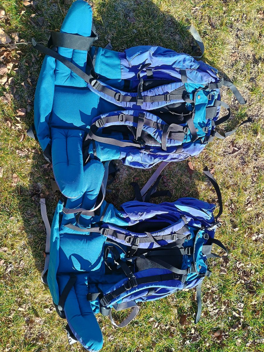 I've got two blue and teal Kelty Arapaho 105 liter (6,400 cubic inches) internal frame backpacks available. They each have two stays, are adjustable, feature a separate bottom sleeping bag compartment, a removable top lid/fanny pack, side pockets, mesh side water bottle pockets, compression straps, and plenty of loops as well as other external equipment attachment options. These were made in the mid 1990s and each one weighs approximately 6 lbs empty. All straps, buckles, zippers, and closures are intact and working.