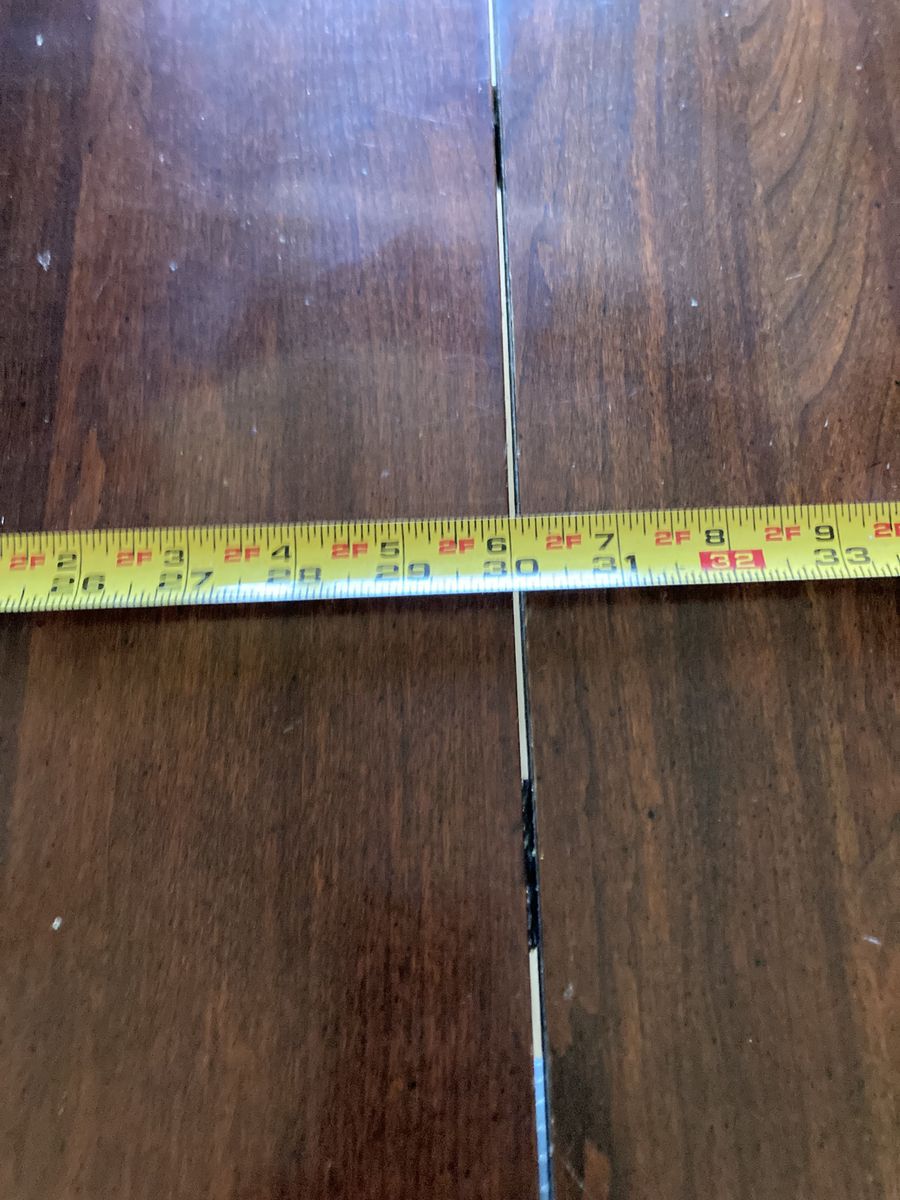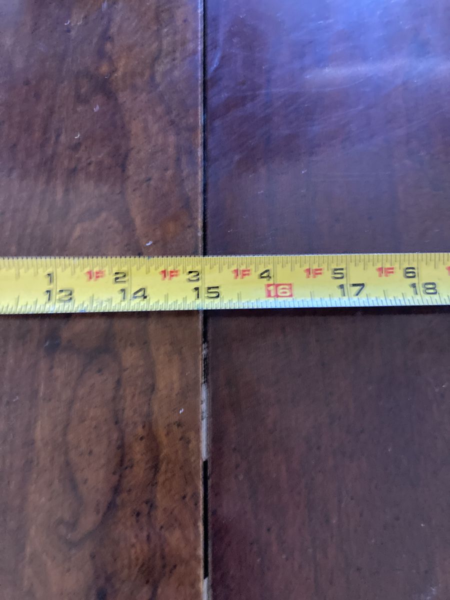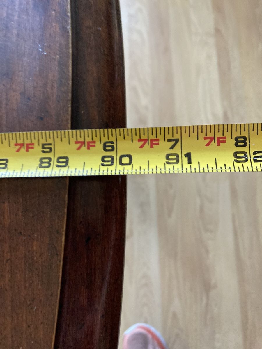 Fully extended with two leaves, the table measures about 90 inches or 7 1/2 feet long.