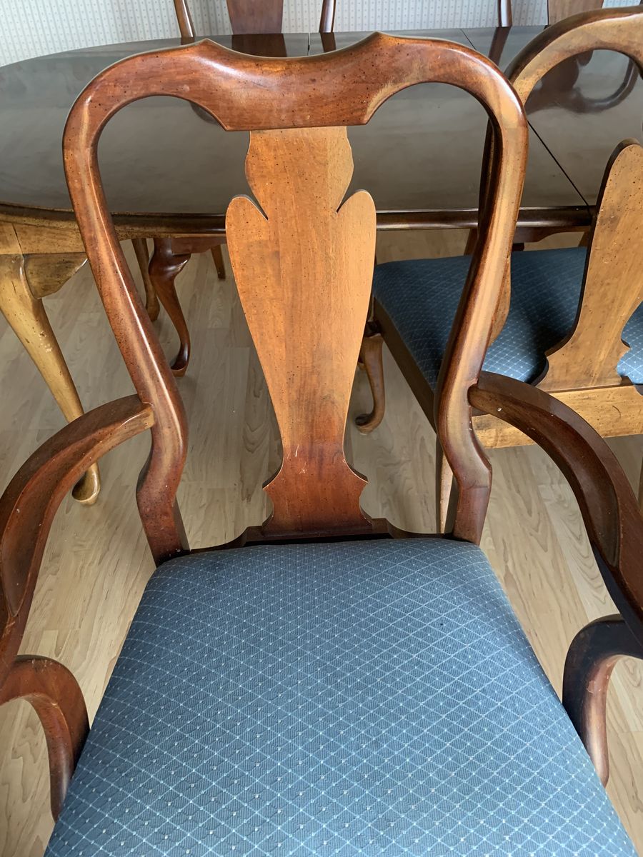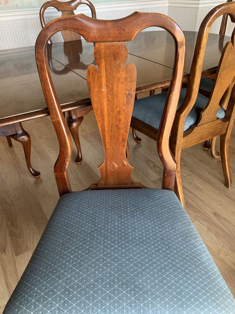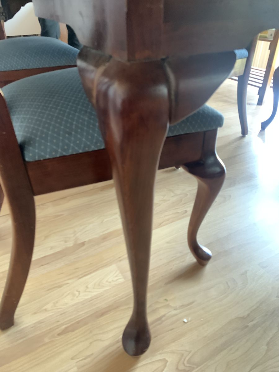 This is my parents' dining room table and chairs. It is solid wood (cherry, I think?).