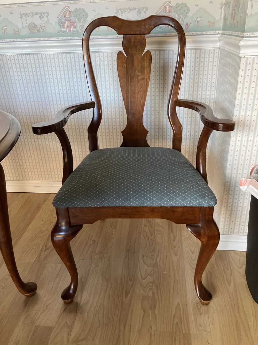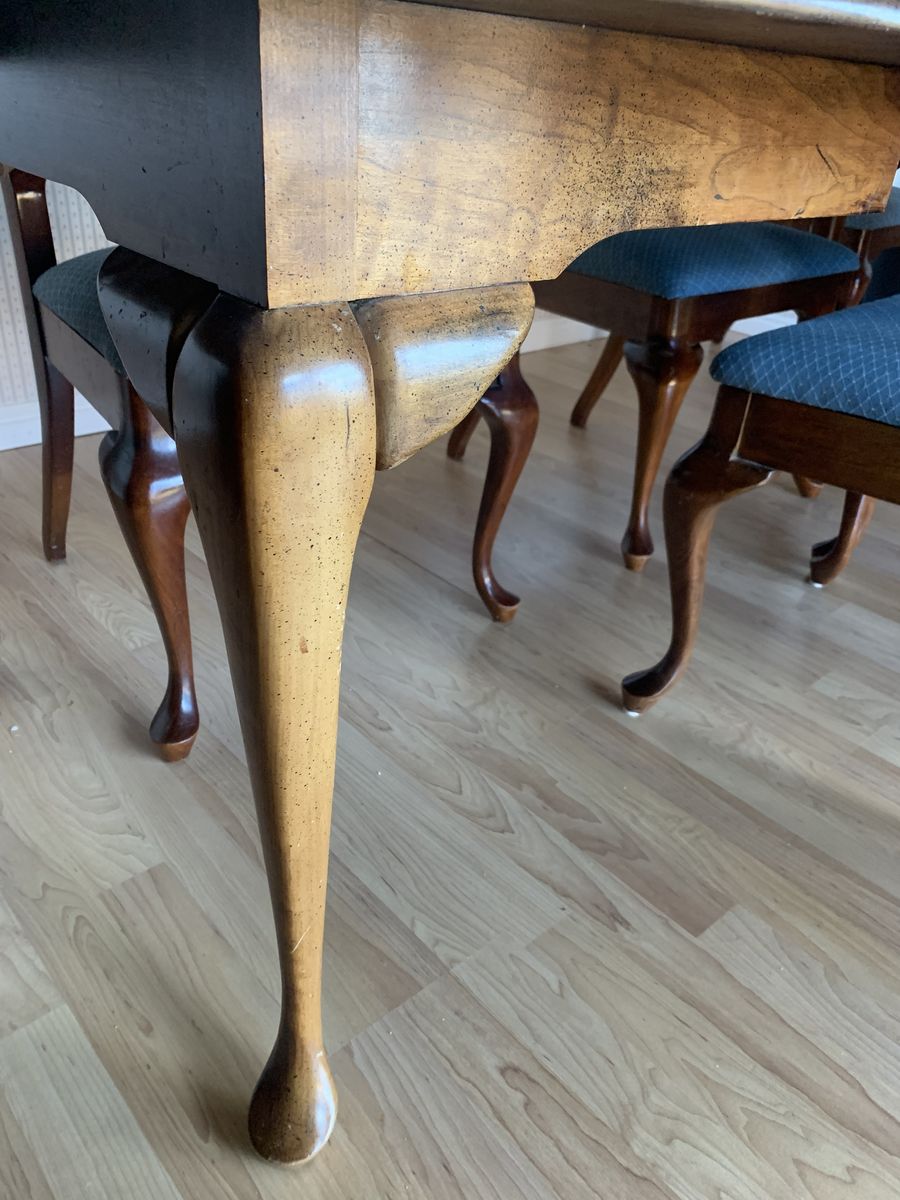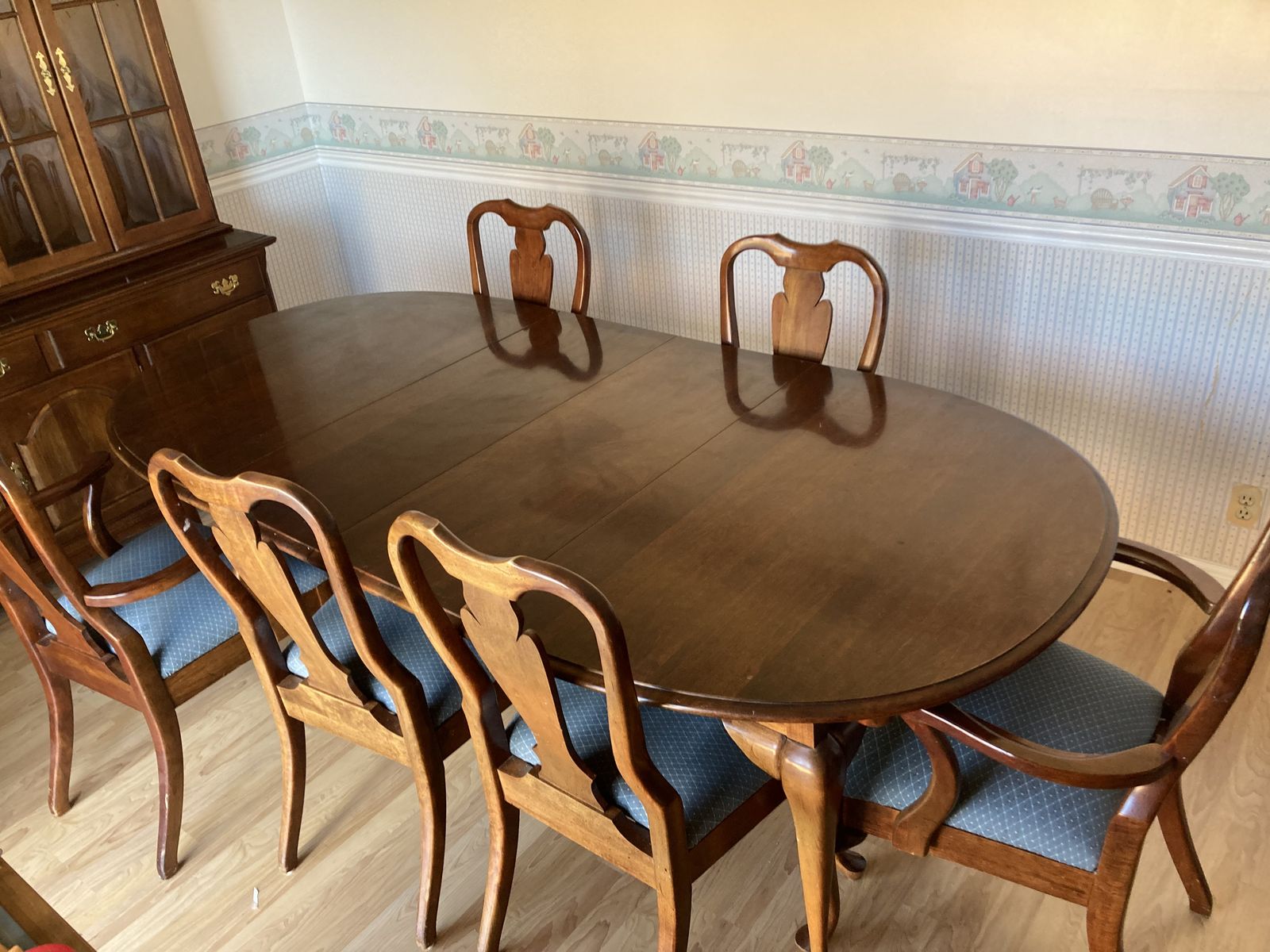 This is my parents' dining room table and chairs. It is solid wood (cherry, I think?).