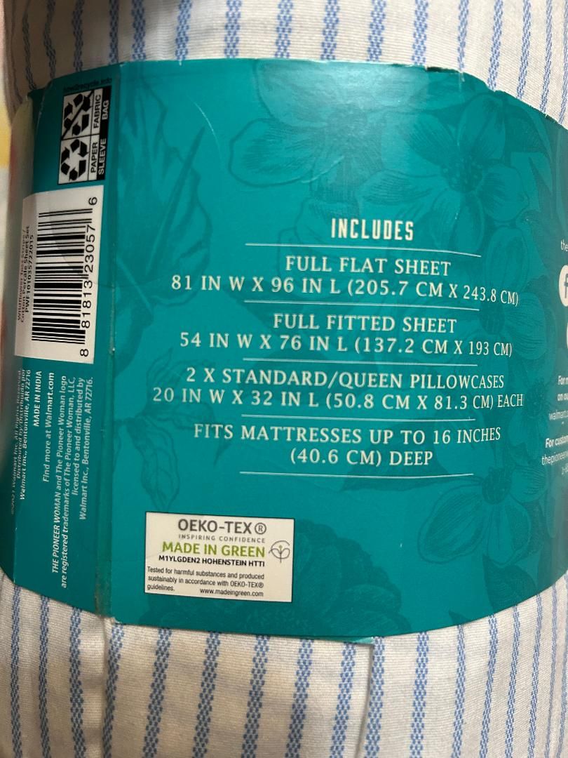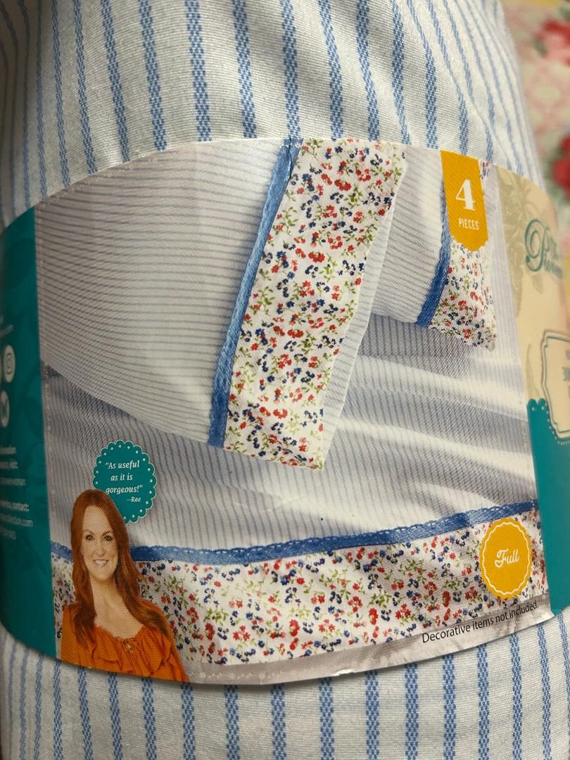 PayPalBeautiful, genuine Pioneer Woman full size sheets. New, still in packaging. Blue stripes on white background with floral edging.
