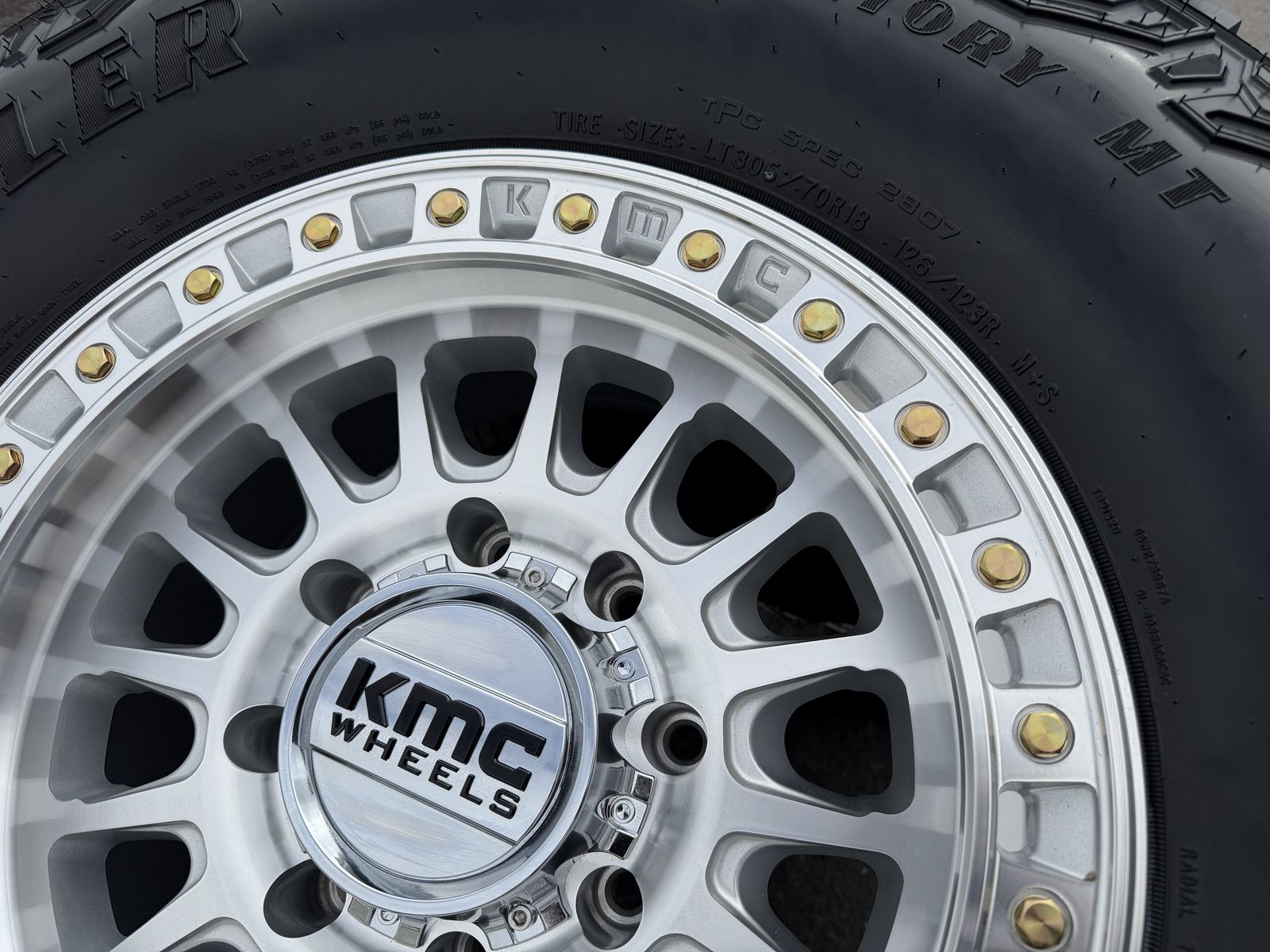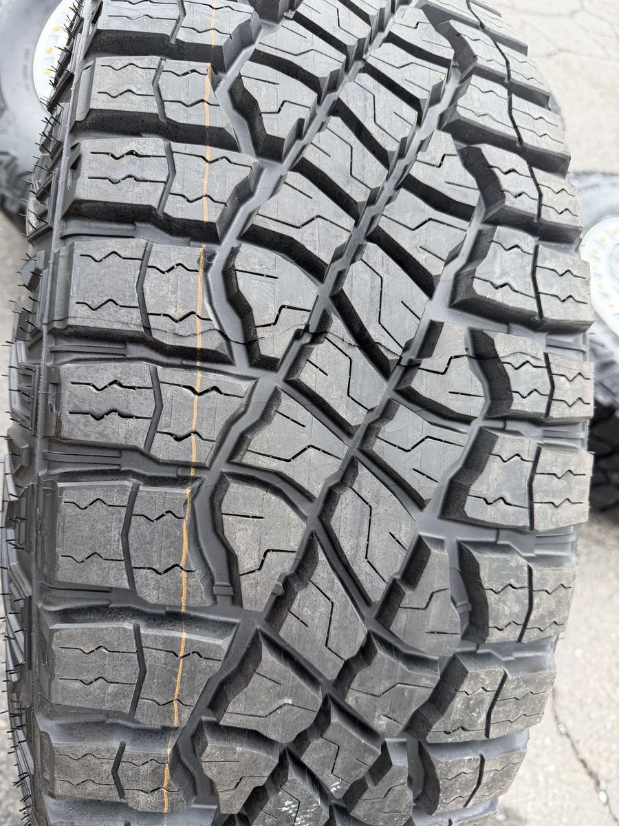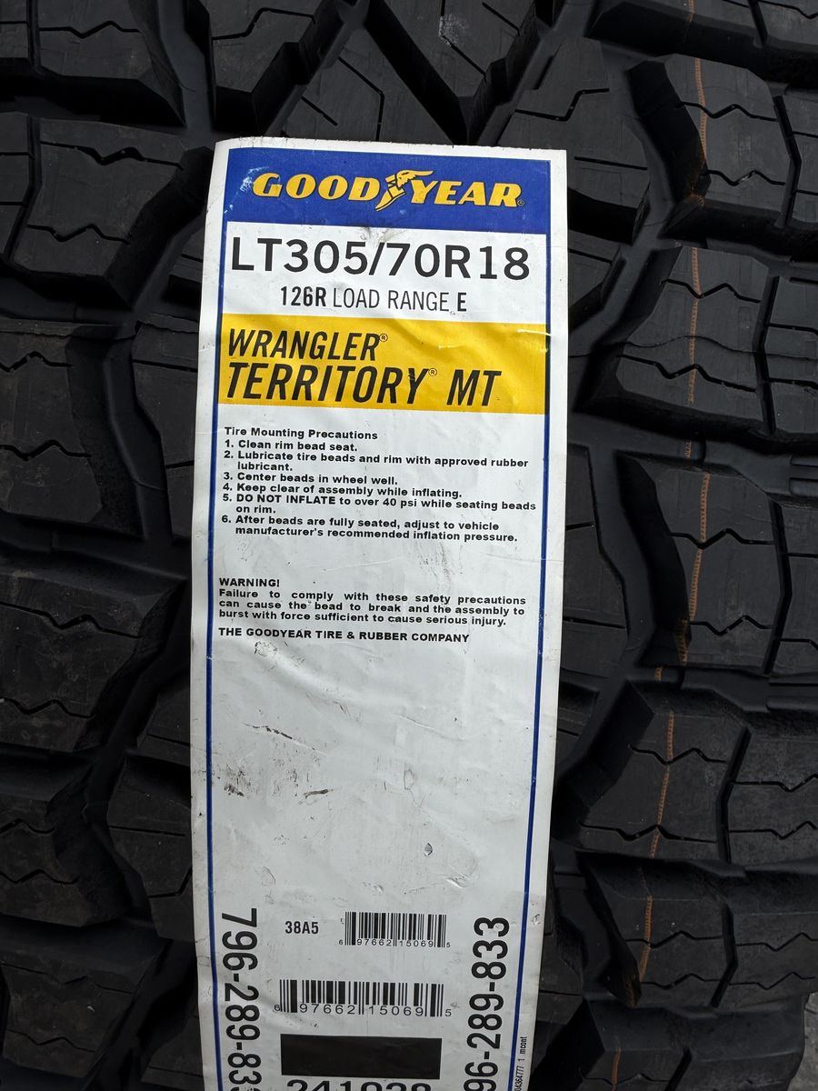 Tires are Goodyear Wrangler Territory M/T 305/70R18 which is roughly 35x12x18 10 ply Load Range E 126 load rating 80 psi rated