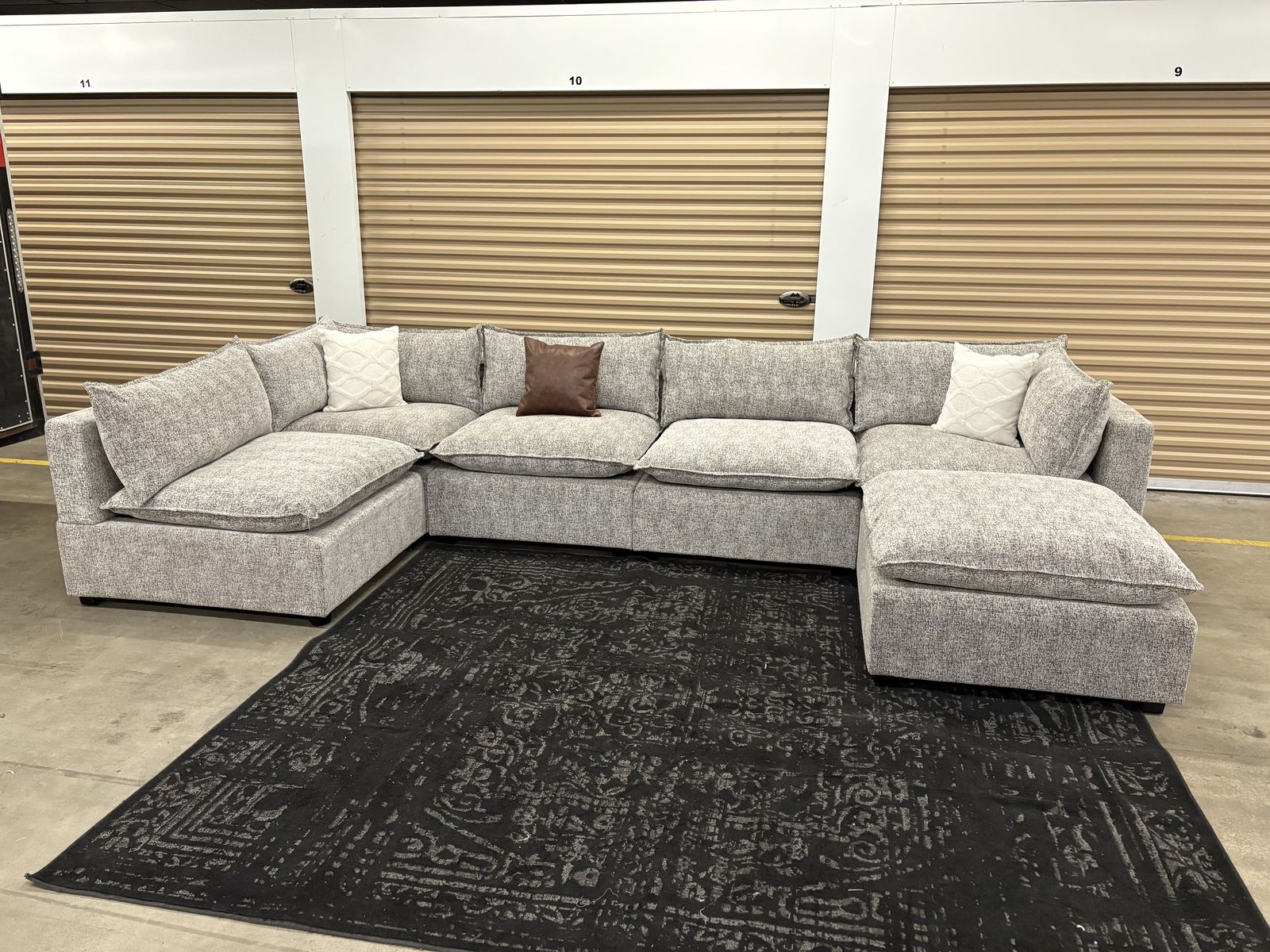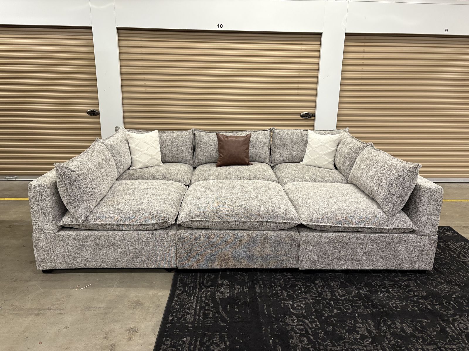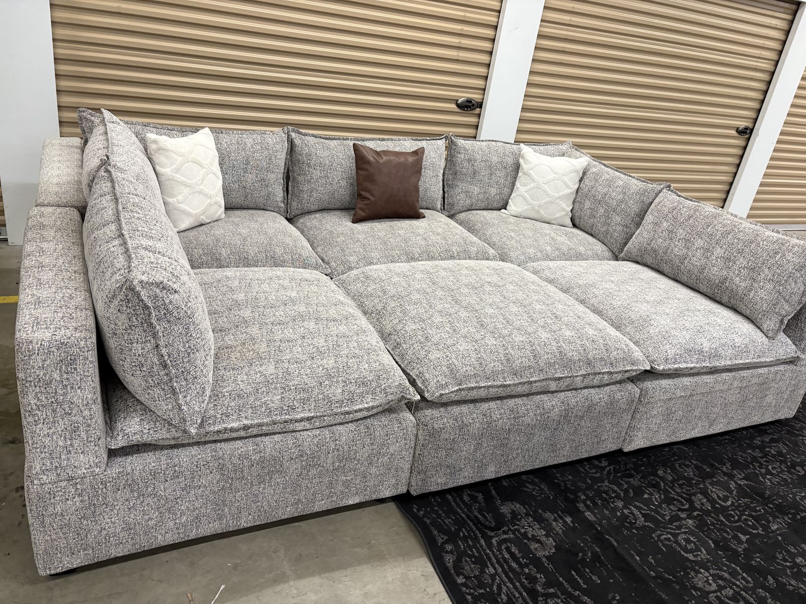 Beautiful oversized pit sectional in great condition! No rips, stains, or damage. Features extra-deep seating with very comfortable down-filled cushions. All seat and back cushion covers were removed and machine washed, so it’s clean and ready for a new home. Perfect for lounging, movie nights, or large living spaces. Modular design allows different layout options.