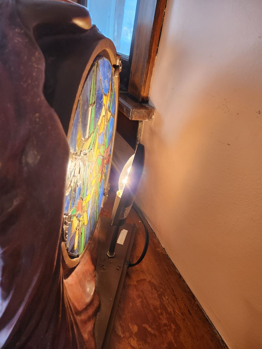 Interesting faux antique stained glass lamp with beautiful ceramic lady holding the frame. She's not brass, she's ceramic made to look like brass. The stained glass has one area that has cracks and the ceramic frame has a one crack in it....still a really nice art piece lamp.