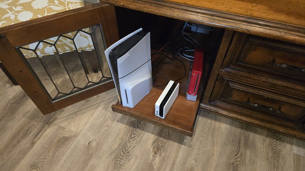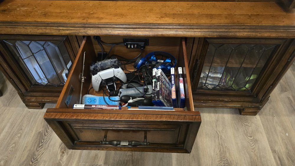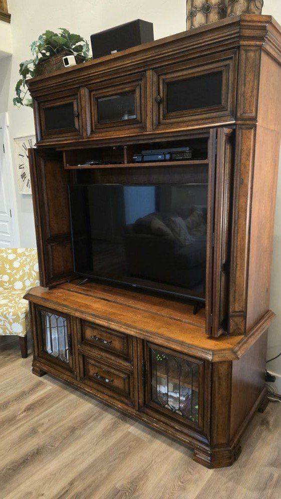 Classic dark wood entertainment center. Has plenty of space for your TV and media equipment. Upper cabinets with speaker doors that can be swapped out for matching wood or glass if wanted. Upper cabinets have lights that turn on with a touch sensor. Lower section has drawers with power and media hookup. Doors close over the TV area when not watching.