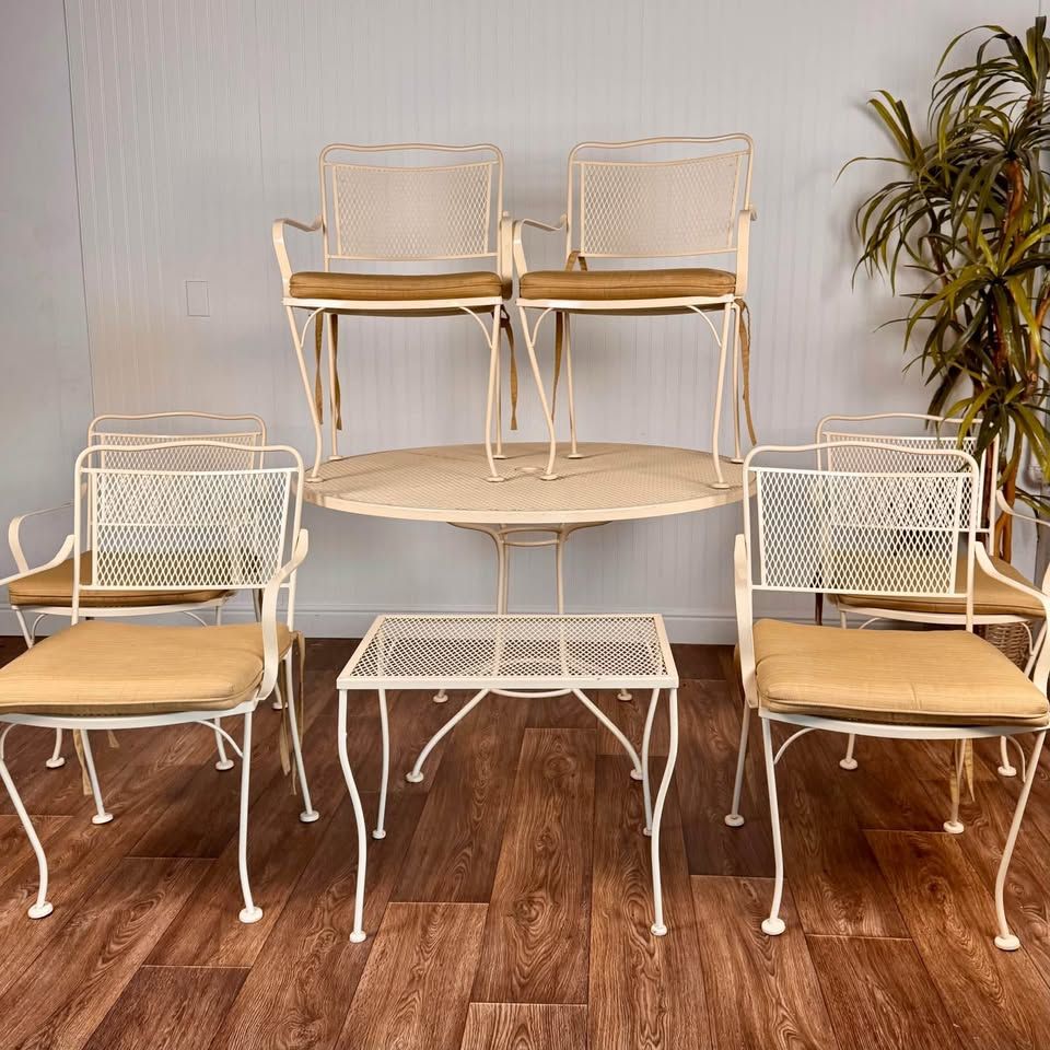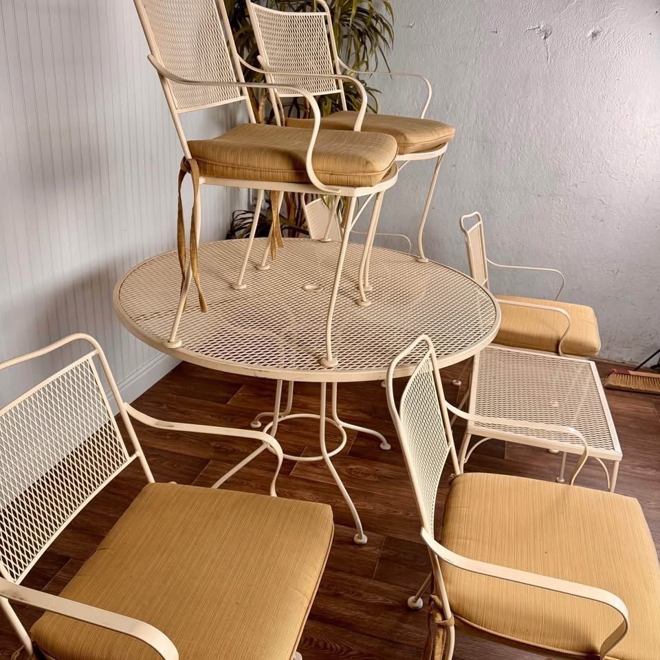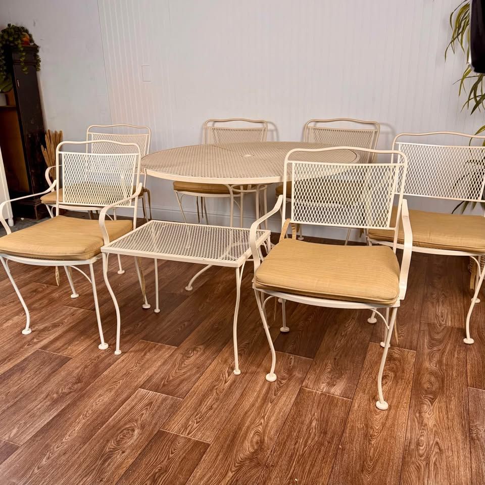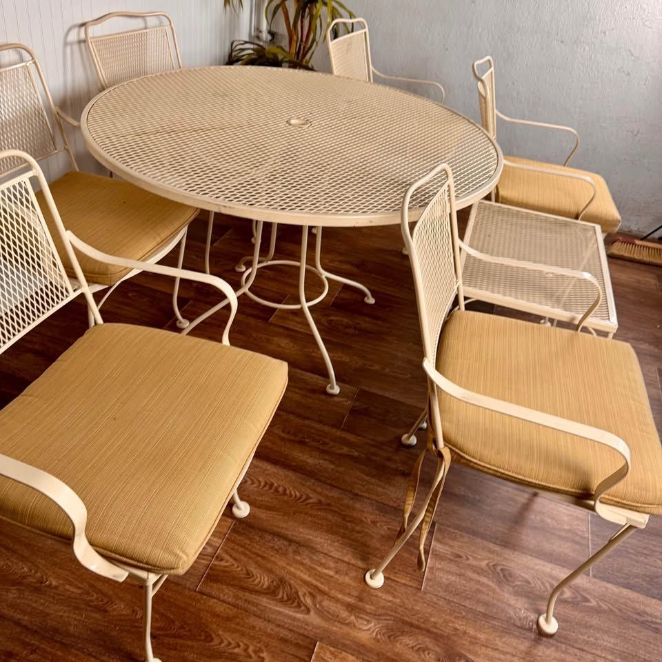 VenmoThis vintage wrought iron patio includes six armchairs with cushions, a round mesh-top dining table, and a matching side table, all finished in a soft cream tone that complements any garden, patio, or sunroom. Some minor signs of wear but overall great condition.