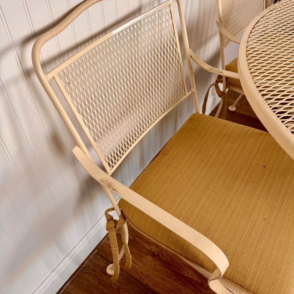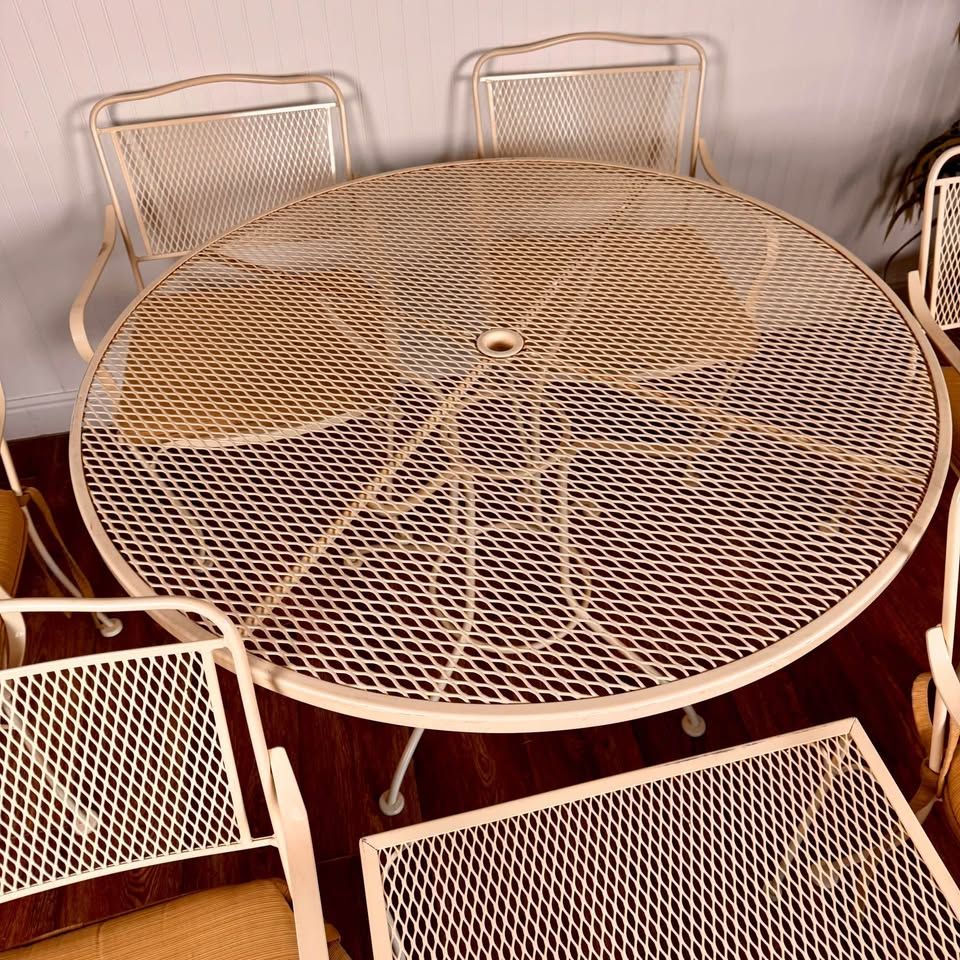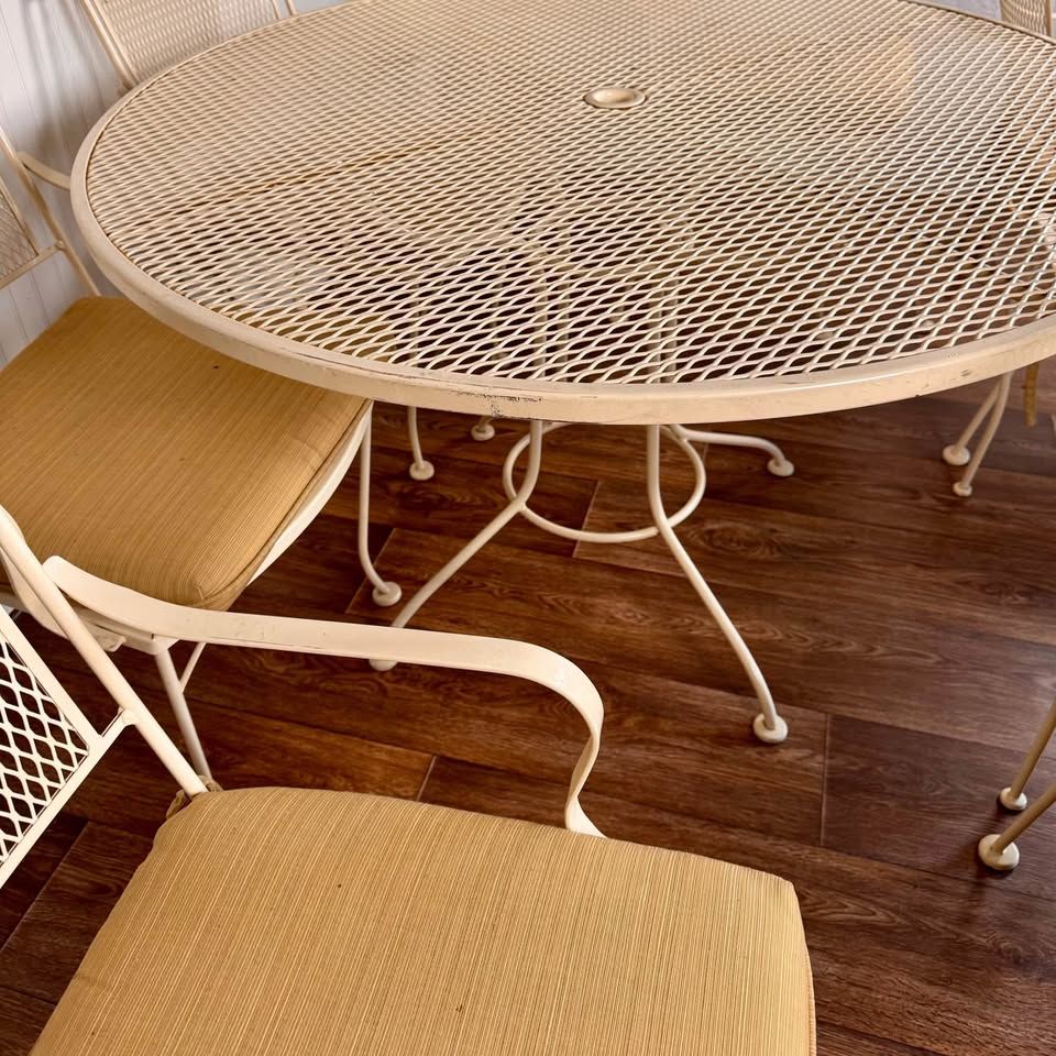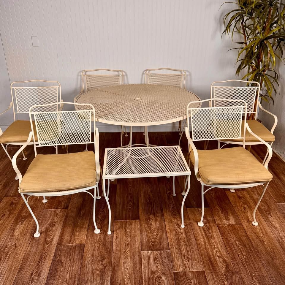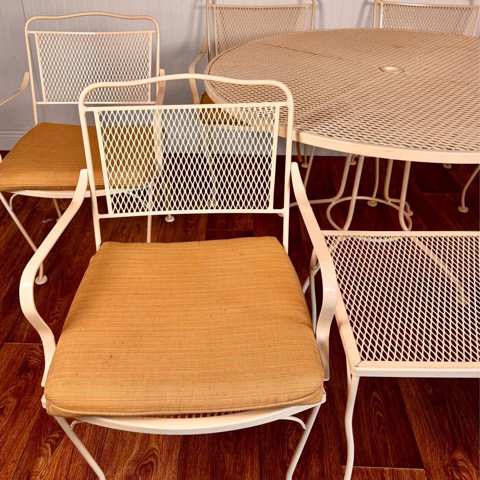 VenmoThis vintage wrought iron patio includes six armchairs with cushions, a round mesh-top dining table, and a matching side table, all finished in a soft cream tone that complements any garden, patio, or sunroom. Some minor signs of wear but overall great condition.