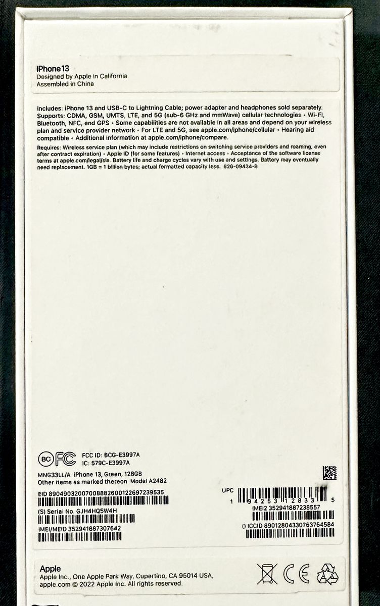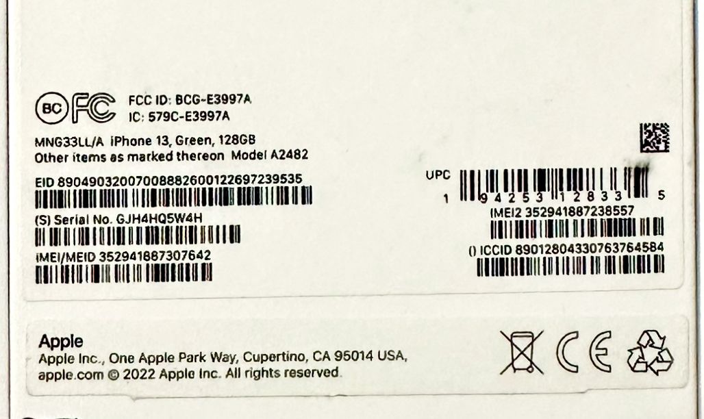 ApplePayiPhone 13-128g! New In Box! Green, 100% Battery, Previously Purchased thru ATT - Unlocked!