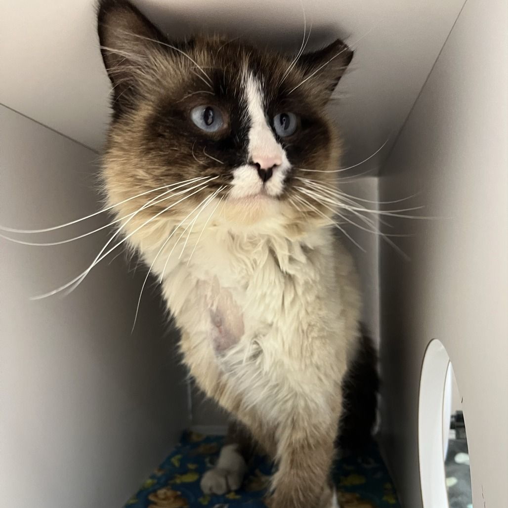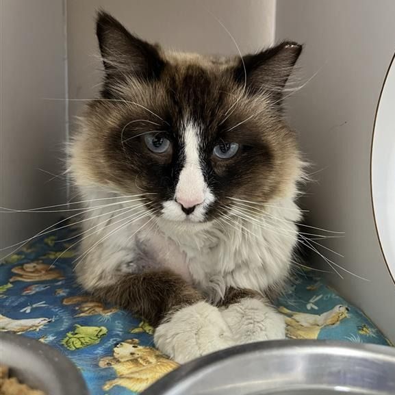 Tupac is a striking 2 year old male snowshoe with his chocolate and white coloring and captivating blue eyes that make him unforgettable. His ears, legs and face look like they have been dipped in a dark rich chocolate giving him a distinctive, almost regal appearance -- and a wise, old soul expression to match. Even though he is new to his surroundings, Tupac carries himself with easygoing confidence. He is taking everything in with a calm curiosity. With his stunning good looks and balanced, friendly temperament, Tupac is the whole package. He is poised, gentle, and already showing how wonderfully he will fit into a loving home. He can't wait to meet you!