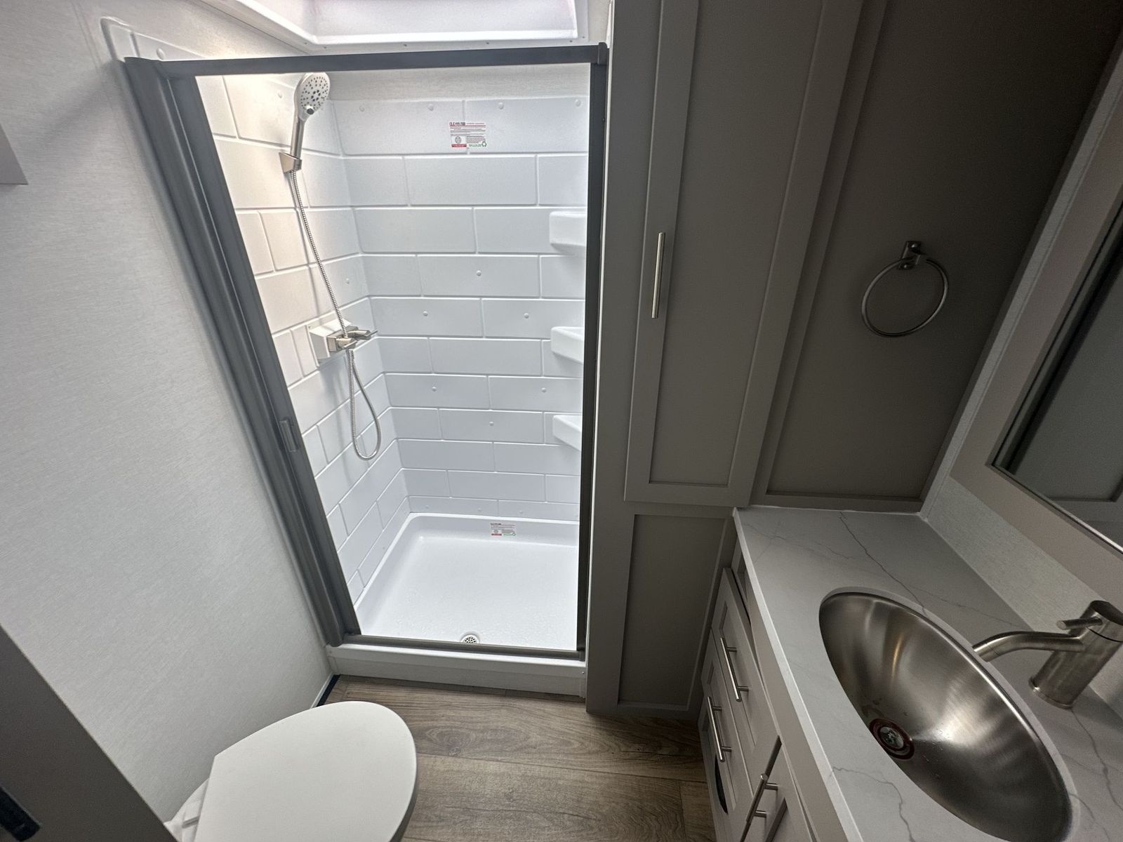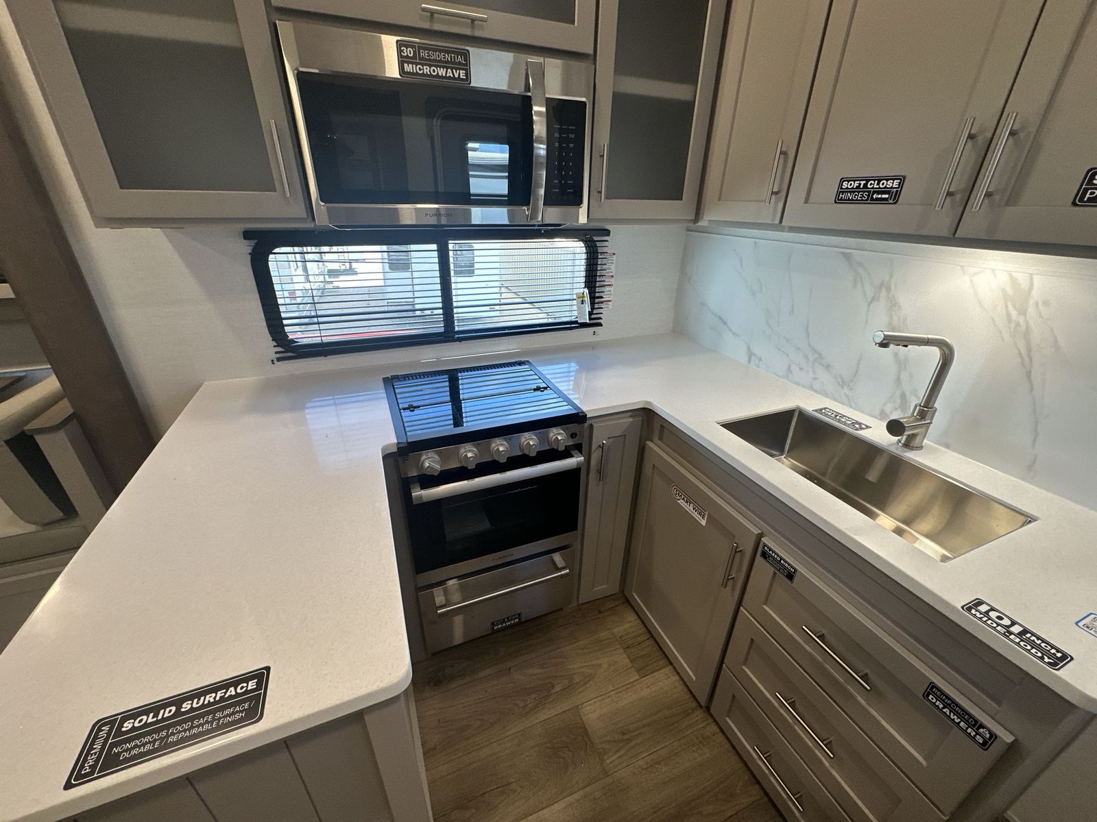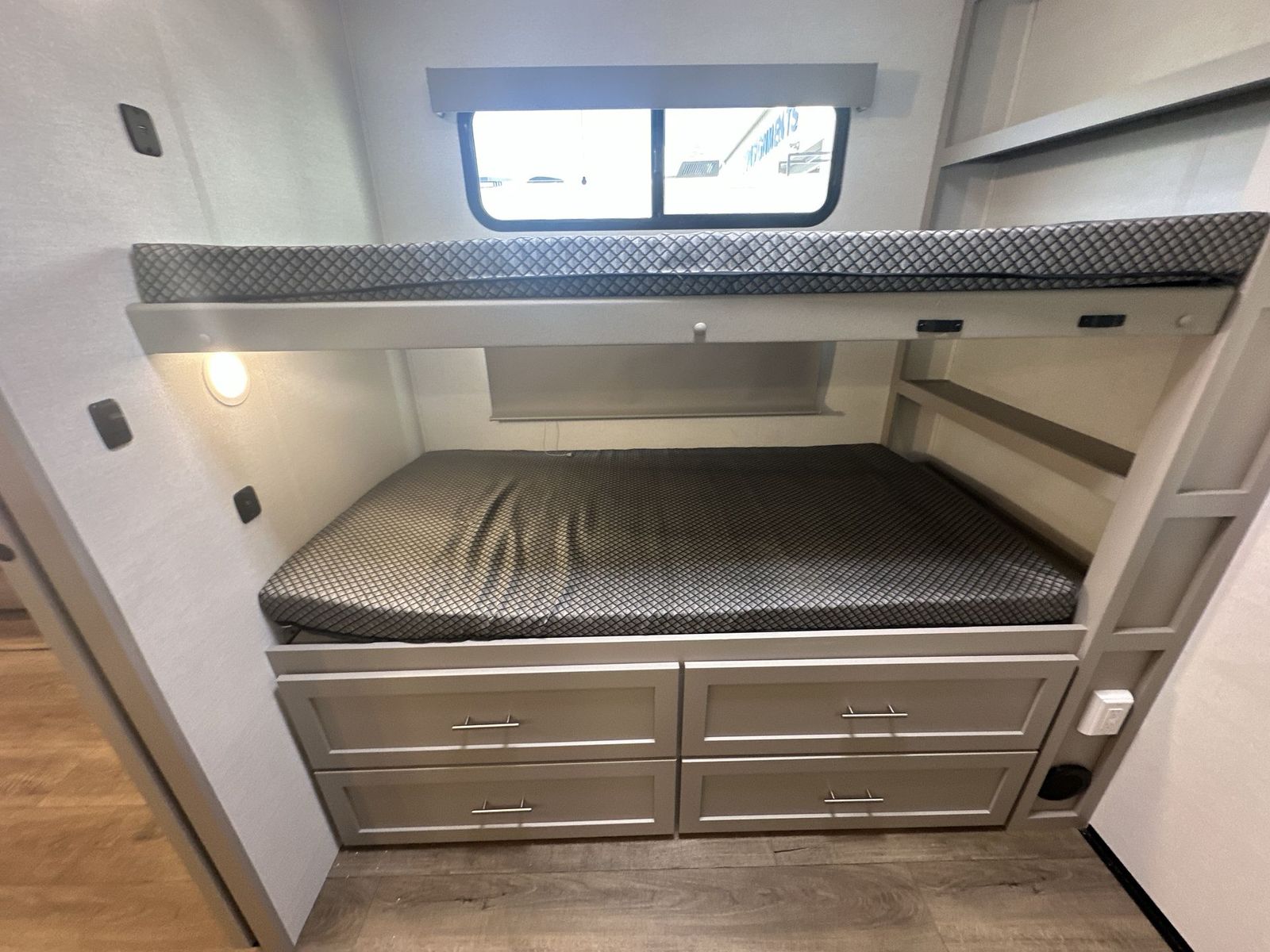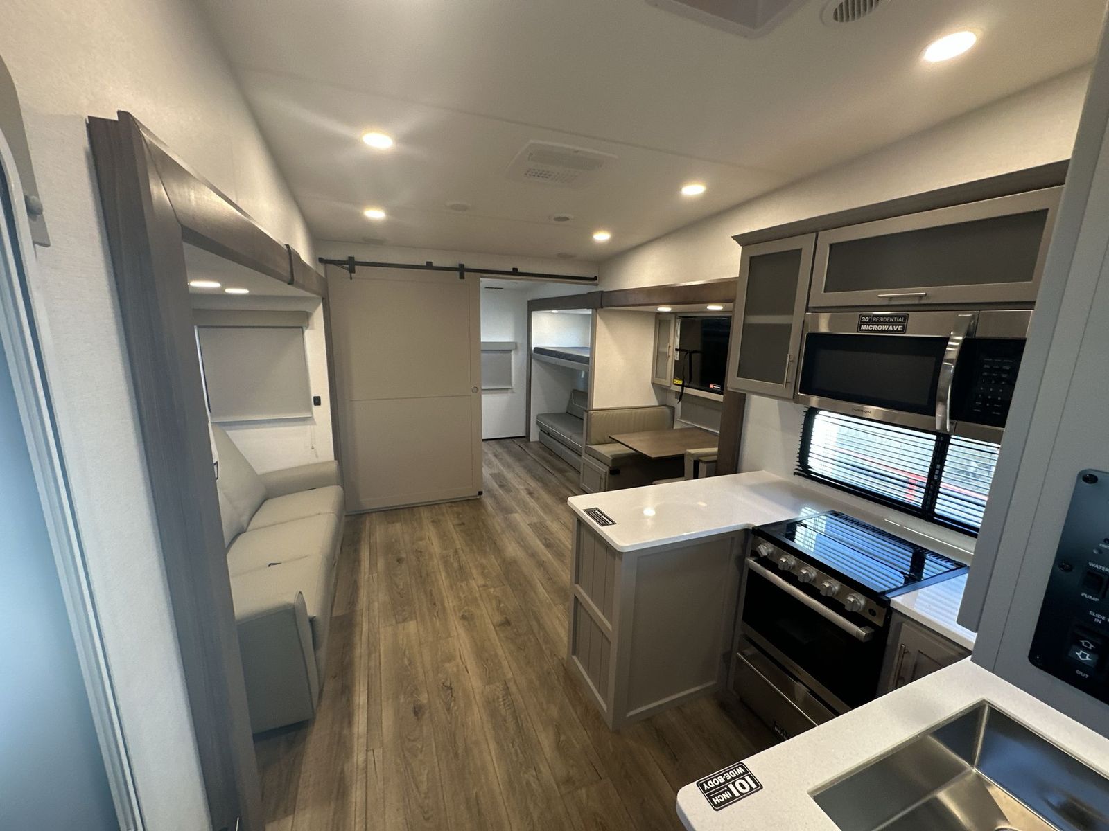 Alliance RV Avenue All-Access fifth wheel 30BH highlights: Rear Bunkhouse U-Shaped Kitchen Queen Bed Two Awnings If you've been searching for a fifth wheel with more sleeping space, this is the one! You will find a queen bed in the front private bedroom, along with a wardrobe with washer and dryer prep and overhead storage for your things. Your guests can take the rear bunkhouse that includes 40" x 72" bunks across from a slide out with a flip-up bunk and cube sofa below. Everyone can meet in the middle living area and kitchen to relax on the sofa that is in direct view of the 50" Class HDTV. There is also a booth dinette table here to dine together. If the weather is nice, you may just find yourselves outdoors since there are two awnings and an exterior griddle! A benchmark chassis creates a space saver upper deck with each one of these Avenue All-Access fifth wheels by Alliance RV! The 101 in. wide-body construction gives you more room to walk around and the flush slide out floors throughout prevent any tripping. There arecomposite sidewalls inside and out, and a seamless fully walkable PVC roof for extreme durability and zero maintenance. You are sure to love no carpet throughout making each Avenue All-Access easy to clean and allergen free, not to mention pet friendly. You can maximize your space throughout with innovative storage solutions like the hidden storage behind the TV, inside the end tables, ottoman, and dinette chairs. These units also include the OTG Solar Package with a 200 watt solar panel, 15 amp MPPT charger, multiple outlets, and more to keep you powered up!