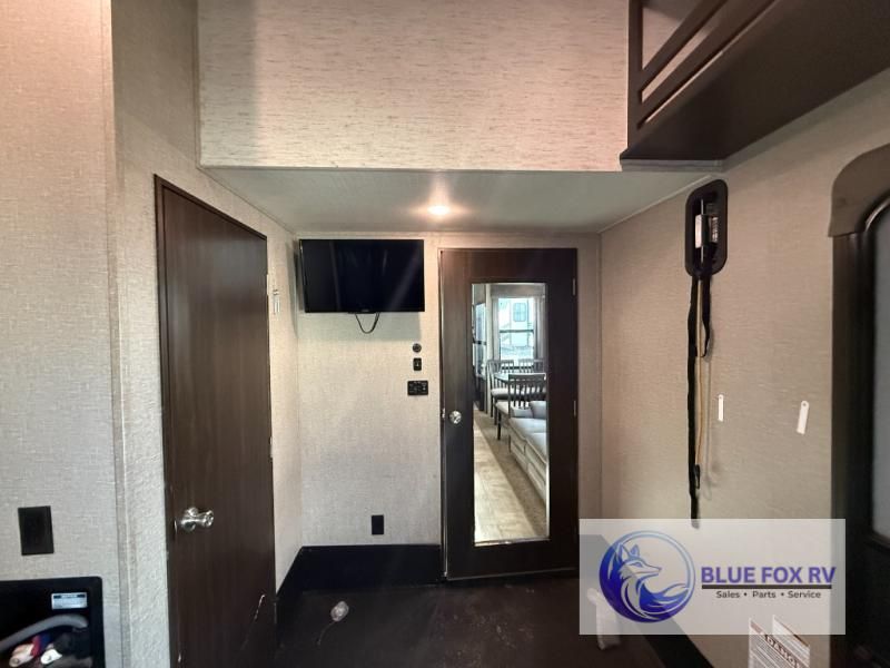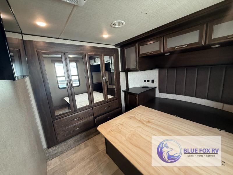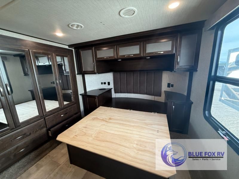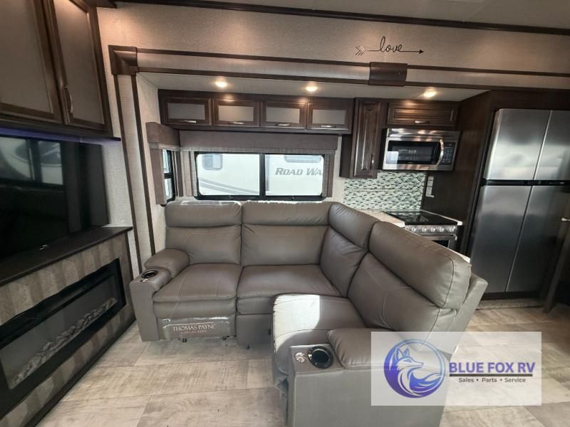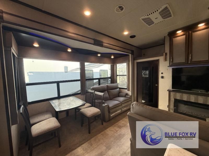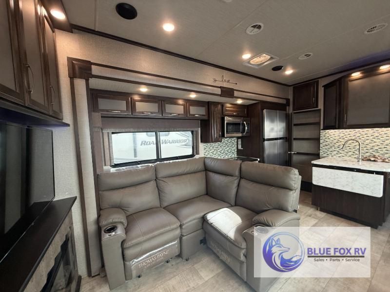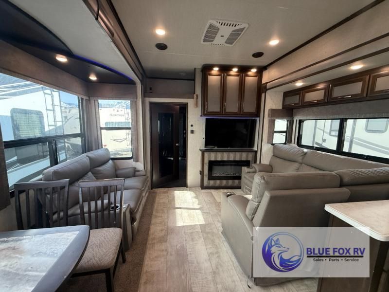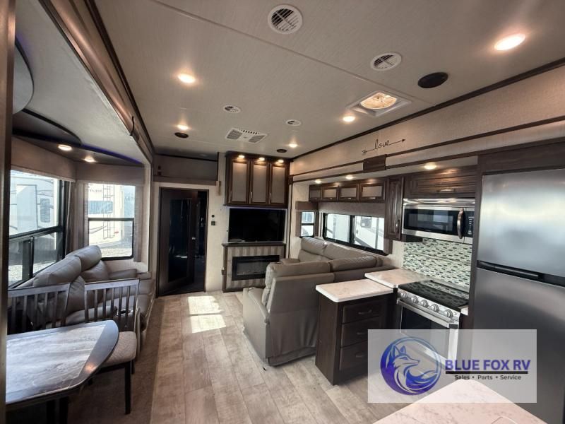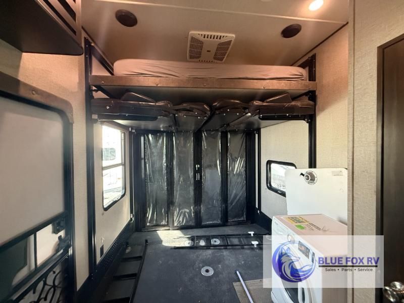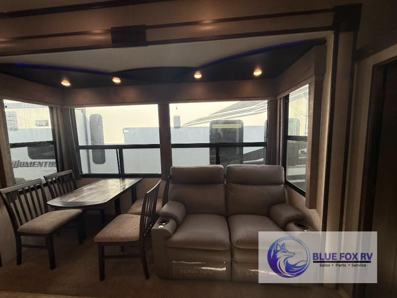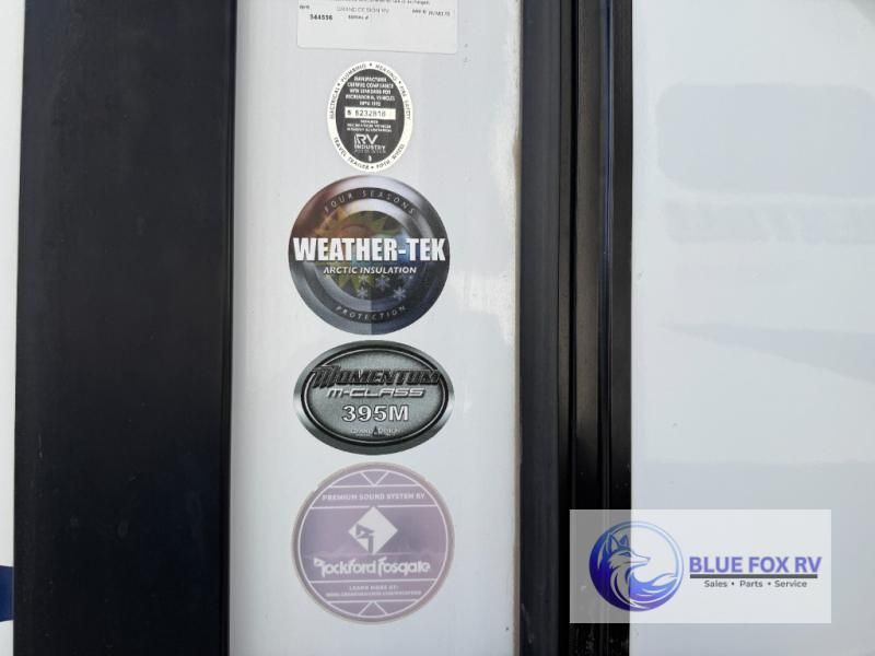 If relaxation and off-road fun have been calling your name, this Momentum M-Class 395M toy hauler fifth wheel will provide the luxury you love along with toy storage. From the garage featuring 12'6" of space for an ATV and dirt bikes and a half bath to a kitchen and living area with theatre seating, an L-shaped sofa, and a fireplace with a 49" LED TV above, you can relax indoors when you aren't having fun outdoors.