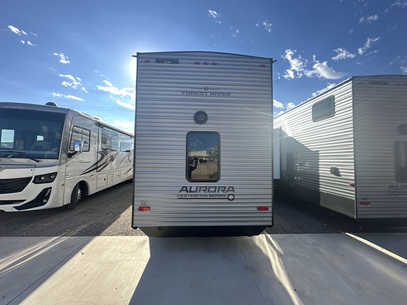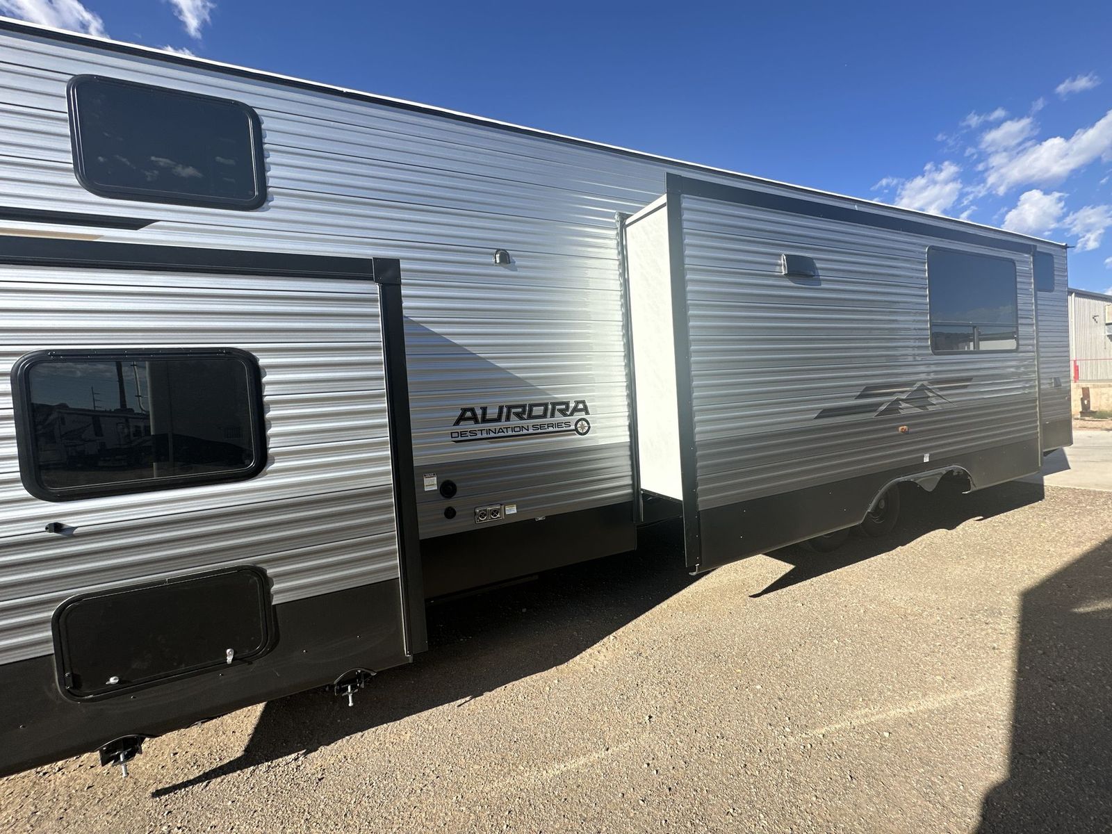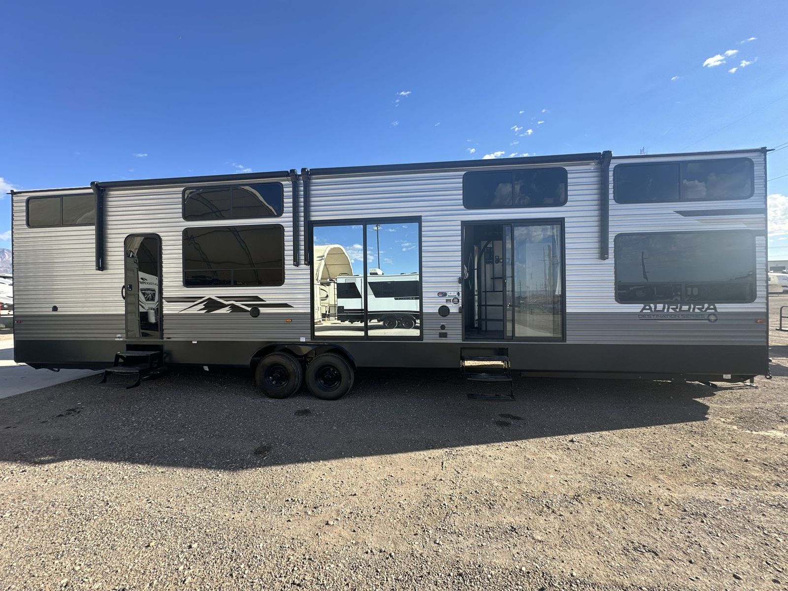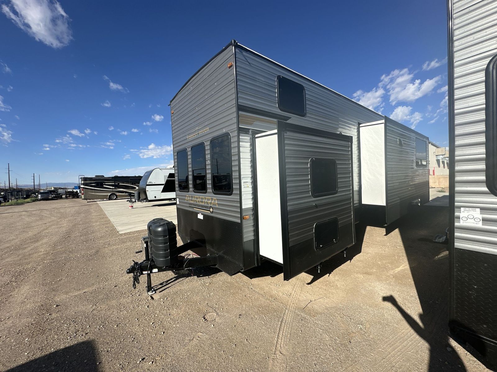 Forest River Aurora destination trailer 42CONDO highlights: Double Lofts Kitchen Island Spacious Full Rear Bath Dual Entry Doors Ceiling Fan You won't believe the amount of comfort found throughout this destination trailer! The front private bedroom will provide you with your own space each night, and here you'll enjoy the RV queen bed slide out, wardrobe closets and a dresser, plus a bedroom fireplace for more comfort. The main living area is made spacious thanks to the large slide out, and the kitchen island with five bar stools will be the perfect place to dine together each day. There is also a hide-a-bed sectional sofa everyone is sure to enjoy relaxing on, and the power lift TV means you can make it a movie night! A spacious full rear bath includes a 48" x 30" shower with a seat and glass shower door and plenty of storage space to keep clean towels and bath necessities stocked. The feature you will really love on this trailer has to be the double loft areas, complete with five bunk mats in total and storage space for your guests' things; how convenient! Comfortability, usability, and quality is what you will find in each one of these Forest River Aurora travel trailers, toy haulers or destination trailers! They are designed with a superior build and packed full with industry leading, functional, and distinctive standard features. SolidStep entrance steps and a Safe-T rail door assist on main entry door to help you safely enter and exit the unit. The diamond plate rock guard will protect your unit from road debris and the nitrogen filled radial tires, which keep their pressure longer, offer better fuel economy. You will also find upgraded JBL Elite exterior speakers outside, an electric awning with multicolor lights and remote, plus flush mount baggage doors for easy packing. The interiors are beautifully designed with a deep undermount farm style sink, stainless steel appliances, and linoleum flooring in the slide outs which will be easy to clean. Come find your favorite model today!