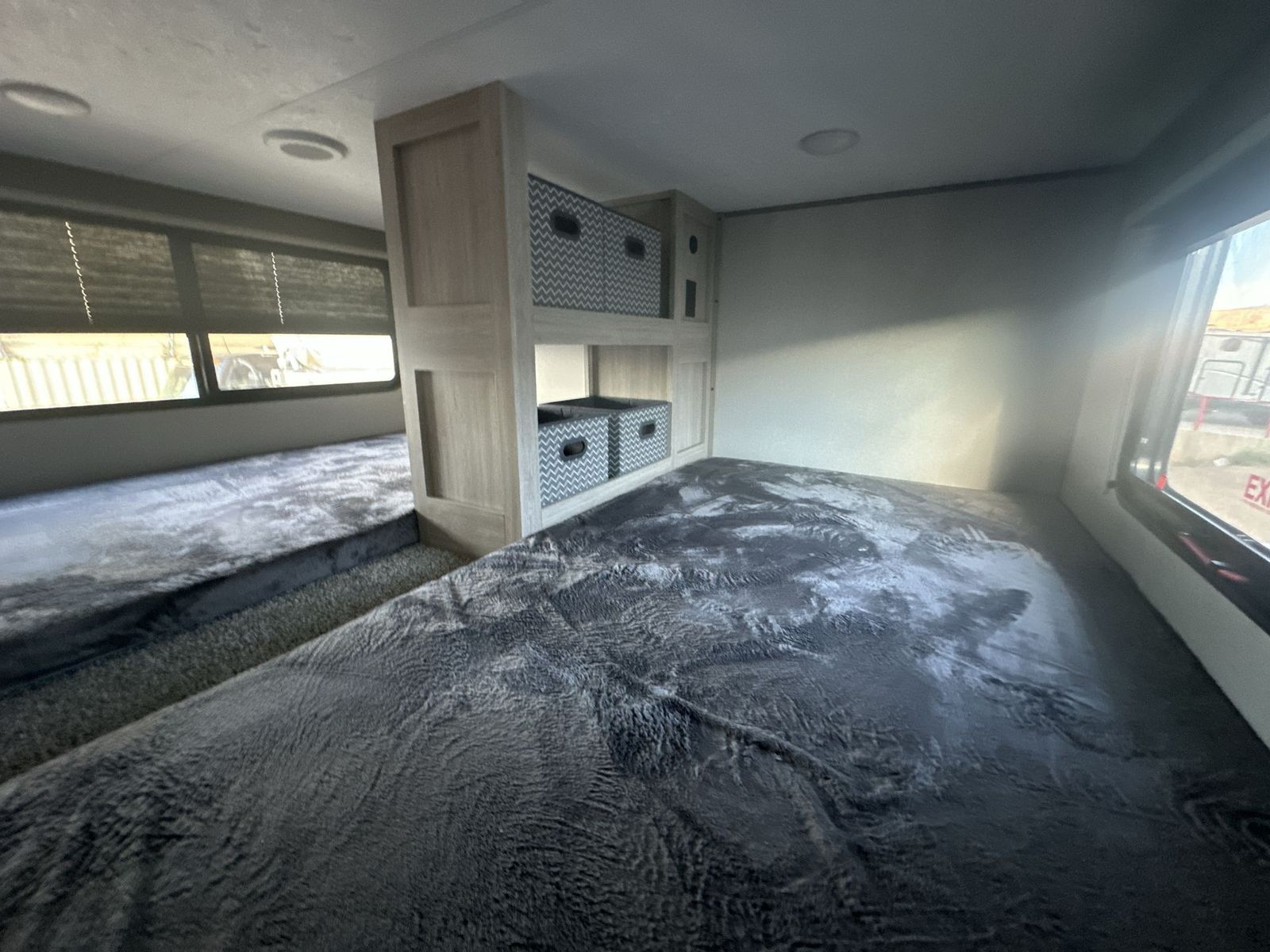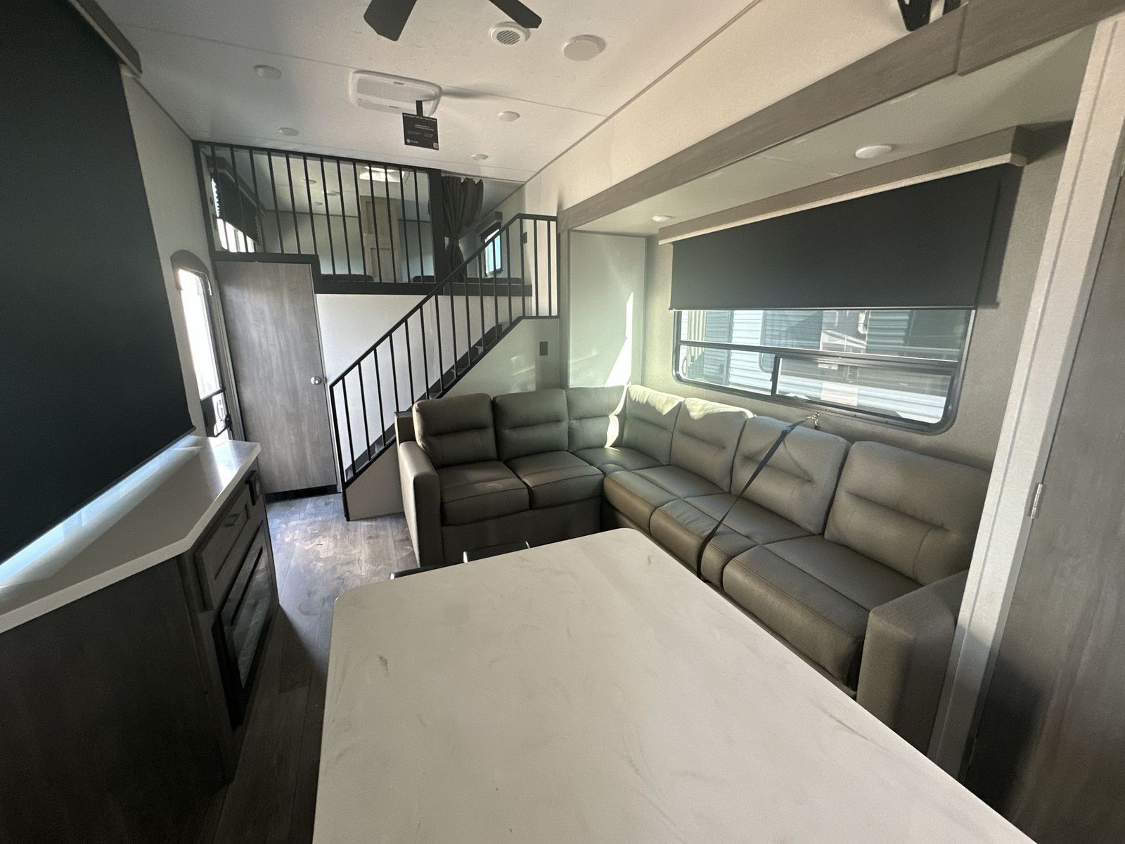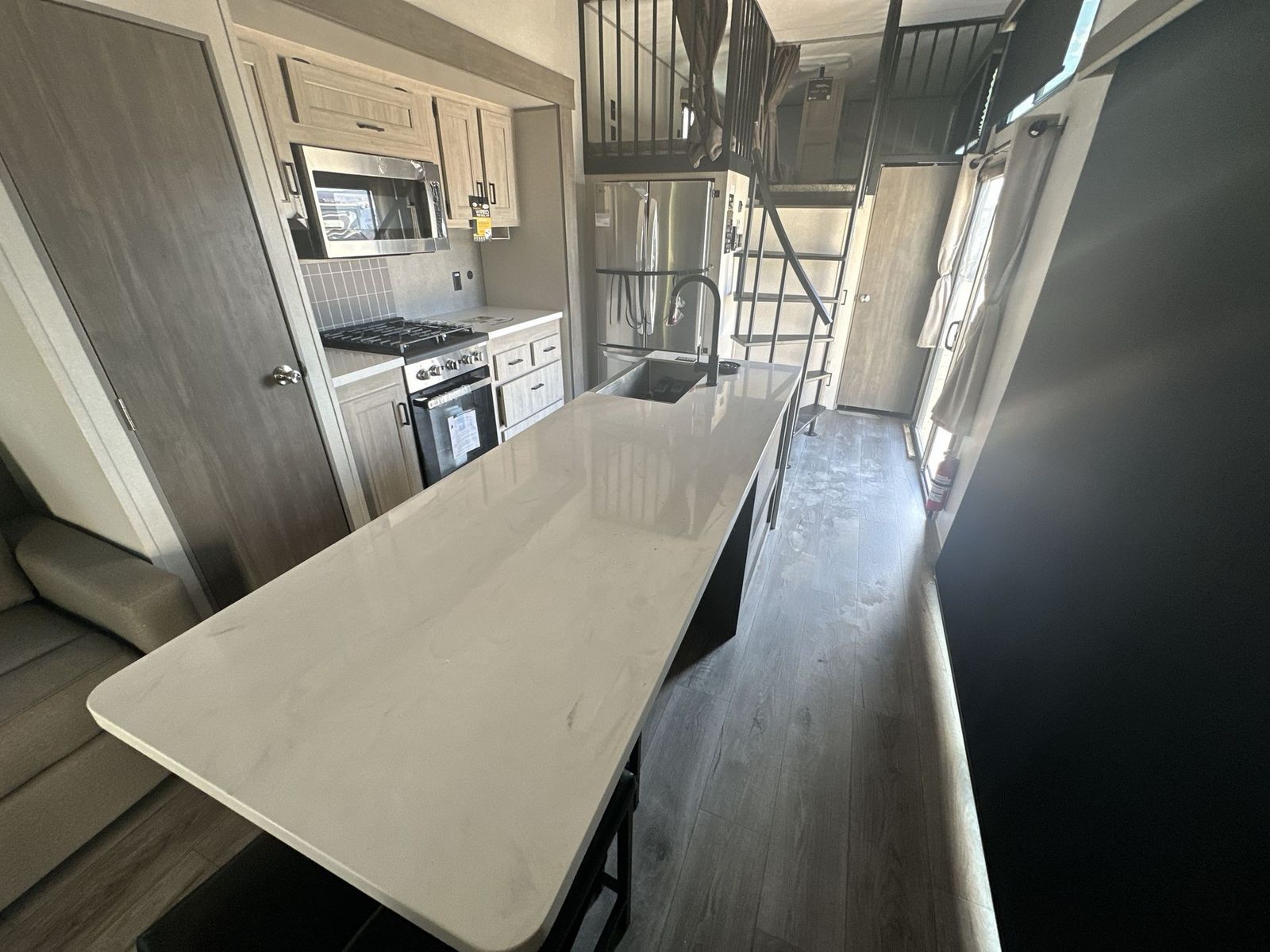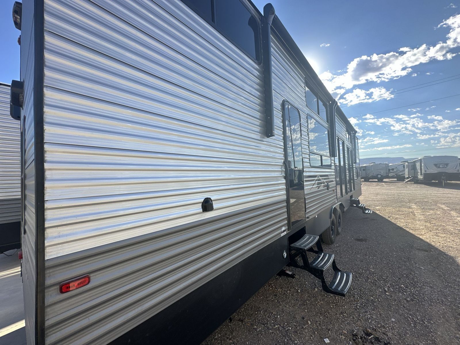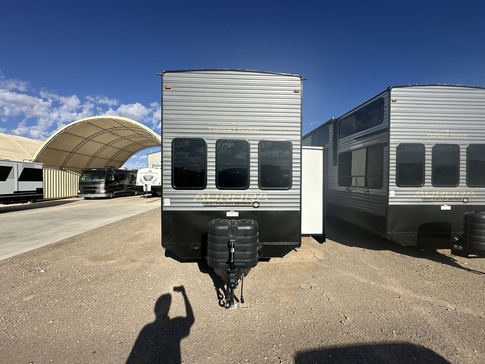 Forest River Aurora destination trailer 42CONDO highlights: Double Lofts Kitchen Island Spacious Full Rear Bath Dual Entry Doors Ceiling Fan You won't believe the amount of comfort found throughout this destination trailer! The front private bedroom will provide you with your own space each night, and here you'll enjoy the RV queen bed slide out, wardrobe closets and a dresser, plus a bedroom fireplace for more comfort. The main living area is made spacious thanks to the large slide out, and the kitchen island with five bar stools will be the perfect place to dine together each day. There is also a hide-a-bed sectional sofa everyone is sure to enjoy relaxing on, and the power lift TV means you can make it a movie night! A spacious full rear bath includes a 48" x 30" shower with a seat and glass shower door and plenty of storage space to keep clean towels and bath necessities stocked. The feature you will really love on this trailer has to be the double loft areas, complete with five bunk mats in total and storage space for your guests' things; how convenient! Comfortability, usability, and quality is what you will find in each one of these Forest River Aurora travel trailers, toy haulers or destination trailers! They are designed with a superior build and packed full with industry leading, functional, and distinctive standard features. SolidStep entrance steps and a Safe-T rail door assist on main entry door to help you safely enter and exit the unit. The diamond plate rock guard will protect your unit from road debris and the nitrogen filled radial tires, which keep their pressure longer, offer better fuel economy. You will also find upgraded JBL Elite exterior speakers outside, an electric awning with multicolor lights and remote, plus flush mount baggage doors for easy packing. The interiors are beautifully designed with a deep undermount farm style sink, stainless steel appliances, and linoleum flooring in the slide outs which will be easy to clean. Come find your favorite model today!