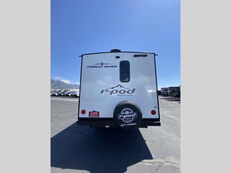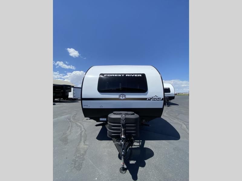 With any R-Pod travel trailer by Forest River, you will enjoy affordable luxury at the lowest tow weight in its class! There is a sealed underbelly with forced heat, a curved dual-pane acrylic front window with a bug screen and night shade, plus a large roof mounted solar panel for off-grid capabilities. The 15K A/C unit will keep you comfortable during the summer camping months, and the tankless water heater will provide endless hot showers after hiking, biking, swimming and more! Each model also includes a black glass friction hinge entrance door, roof ladder prep, exterior motion lighting, plus a hot and cold exterior spray port to wash off sand from the beach. Inside, you'll enjoy seamless Surf-X kitchen countertops, blackout roller shades, and a central vacuum system for hassle-free cleaning!