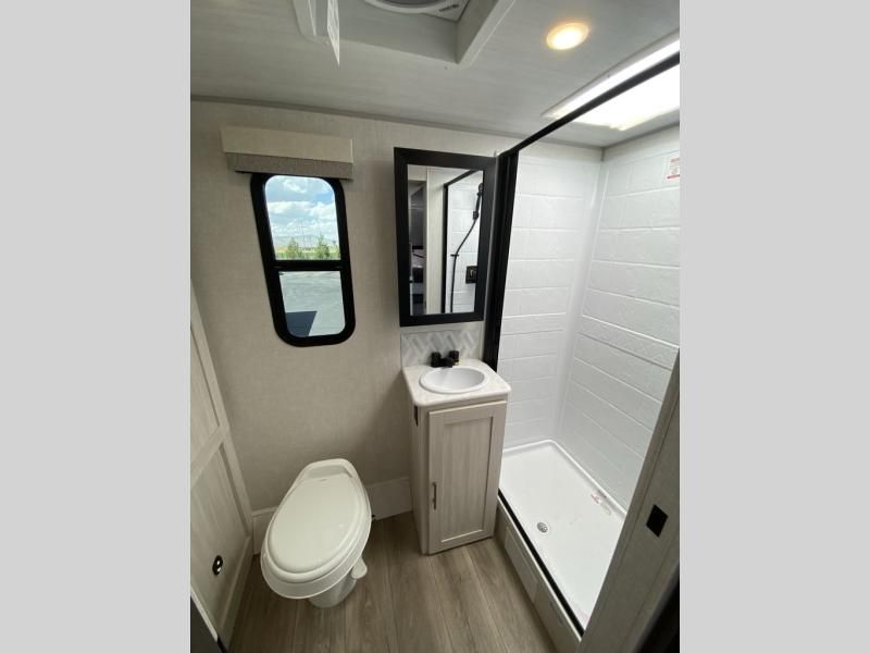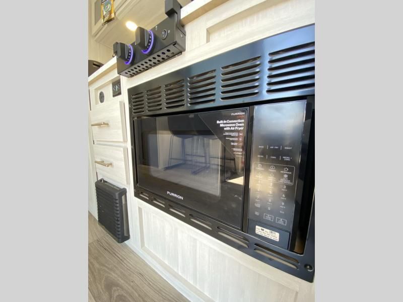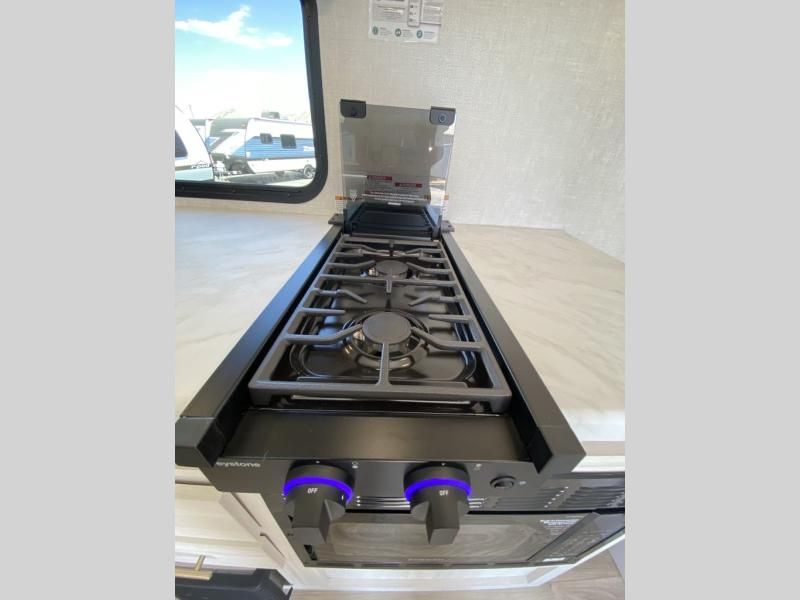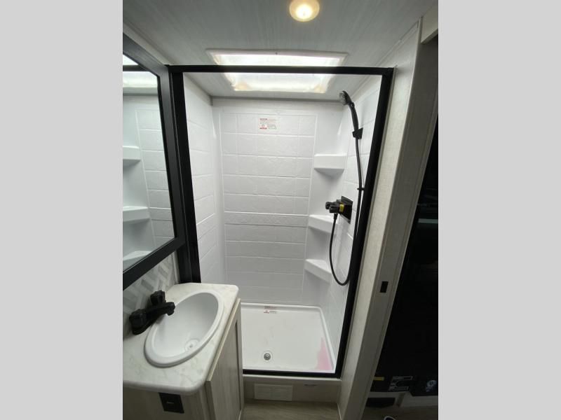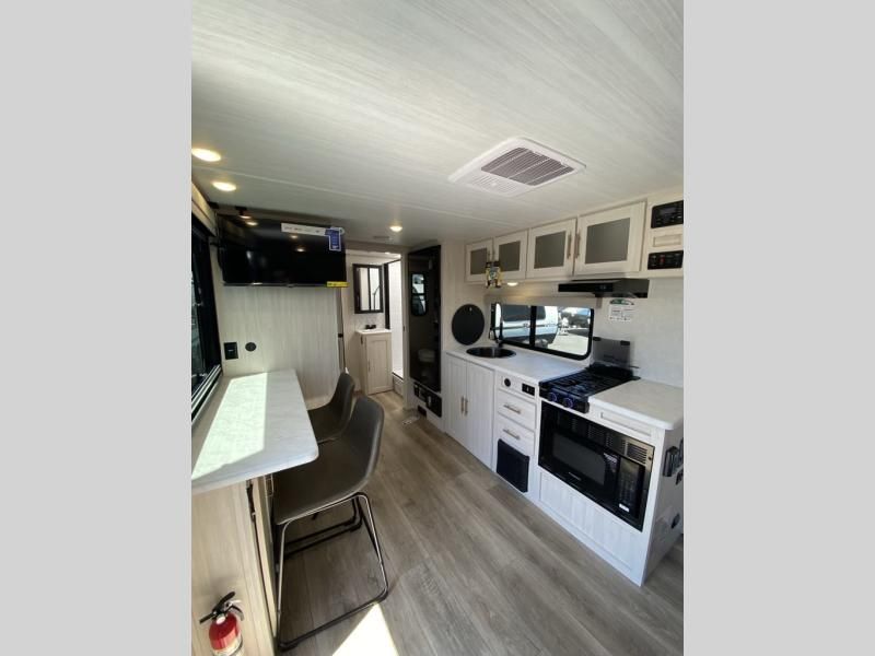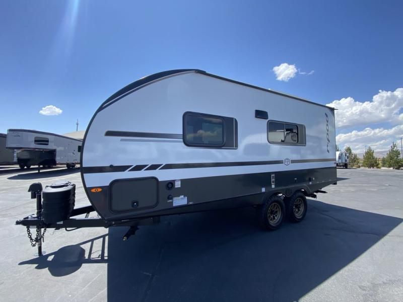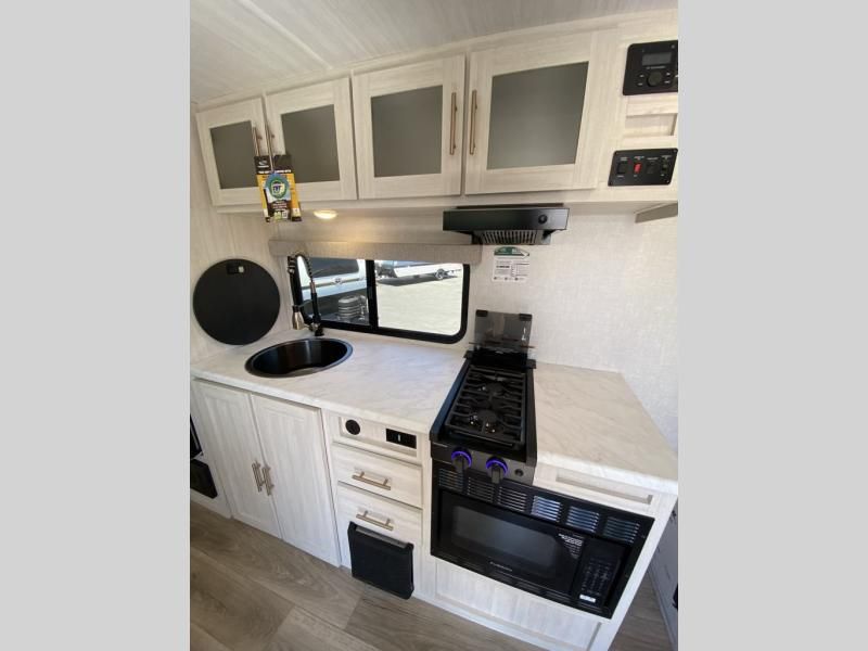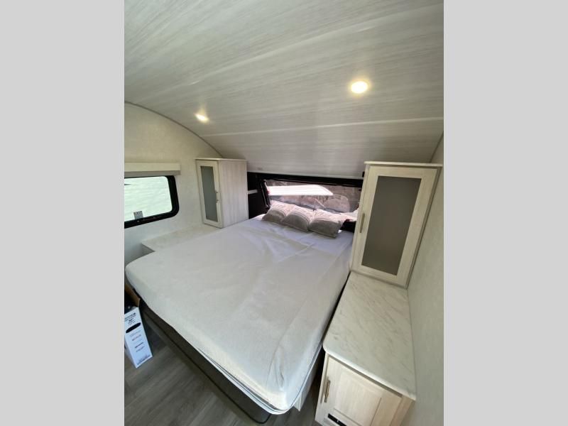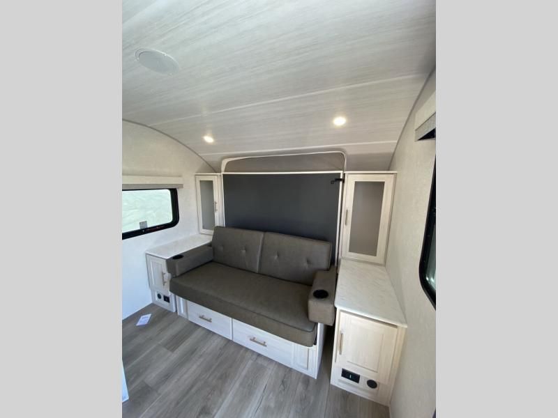 This versatile travel trailer is perfect for two adventure-seeking campers! You will love having a queen-size Murphy bed up front since you can fold it away during the day and relax on the sofa. There are also dual wardrobes to keep your clothes out of the way plus dual end end tables to set your coffee or book on. A full kitchen includes a convection microwave, 12V black glass refrigerator, and a counter with two chairs where you can dine each day. You will also love the flip-up window above the table, along with a 12V TV to keep you entertained, plus a pantry to keep food stocked. Head to the full rear bath that includes a large linen closet, a shower, and a night light for added convenience. The exterior is just as accommodating with its large roof mounted solar panel, rear accessory hitch, slam latch cargo doors, and more!