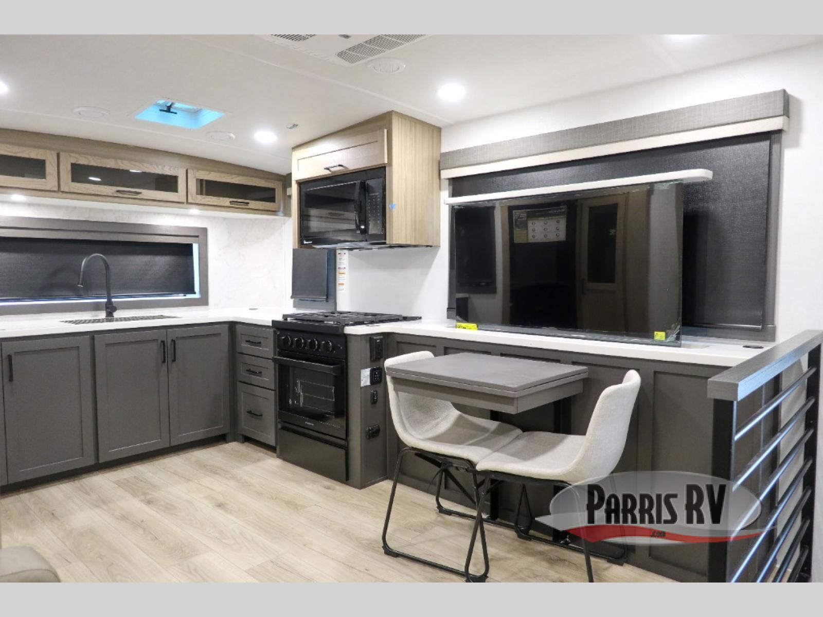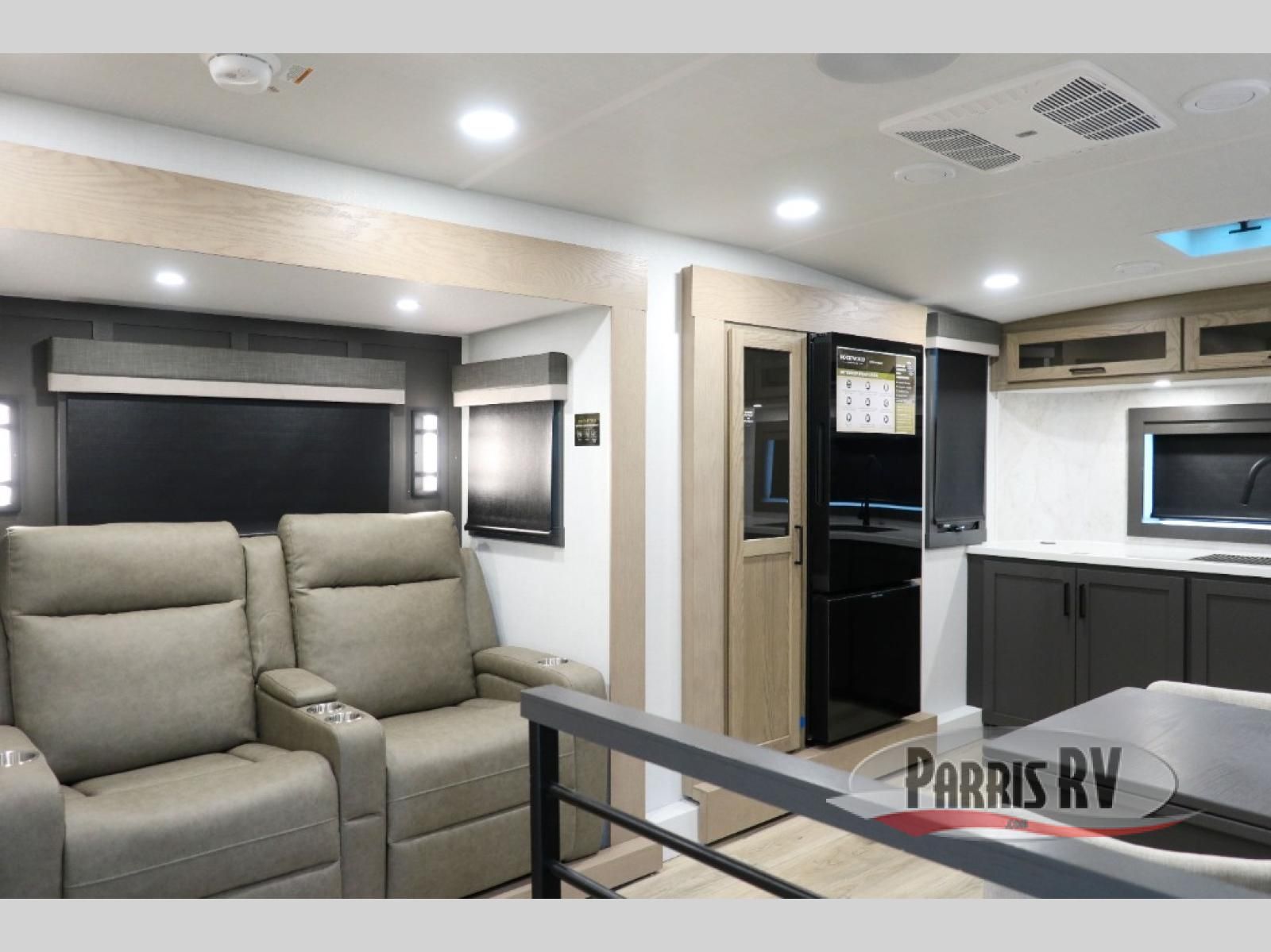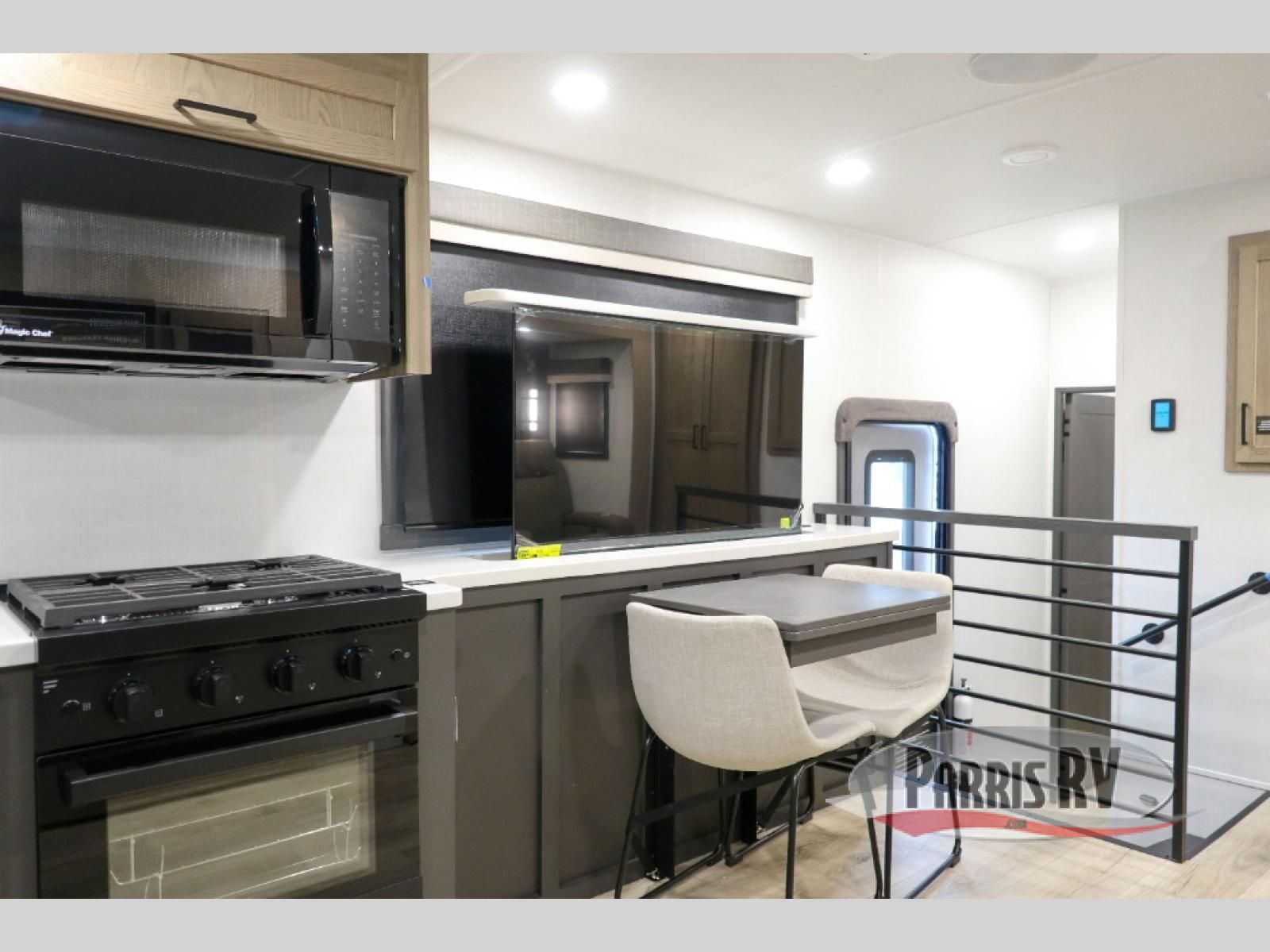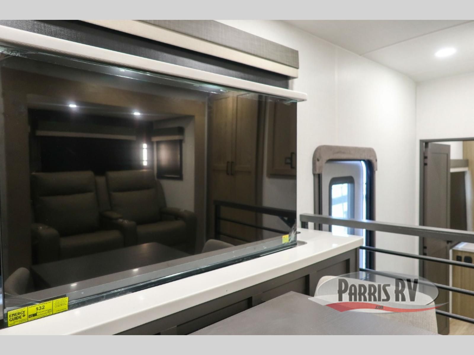 Premium amenities and a serene atmosphere make this fifth wheel your home away from home. The rear bedroom is a peaceful retreat, featuring a queen bed, spacious wardrobe, and a washer and dryer prep for added convenience. The full bathroom is a spa-like oasis, complete with a linen closet to keep your towels and toiletries organized. The theater seat is the perfect spot to relax and unwind, while the table & chairs with a leaf provide a comfortable space for meals and conversation. The televator TV is a sleek and modern touch, perfect for enjoying your favorite shows or movies. The pantry serves as a convenient storage space for your food and cooking essentials, while the fridge, microwave, and overhead cabinets provide ample space for meal preparation. The front countertop is the perfect spot to whip up a quick snack or breakfast.
