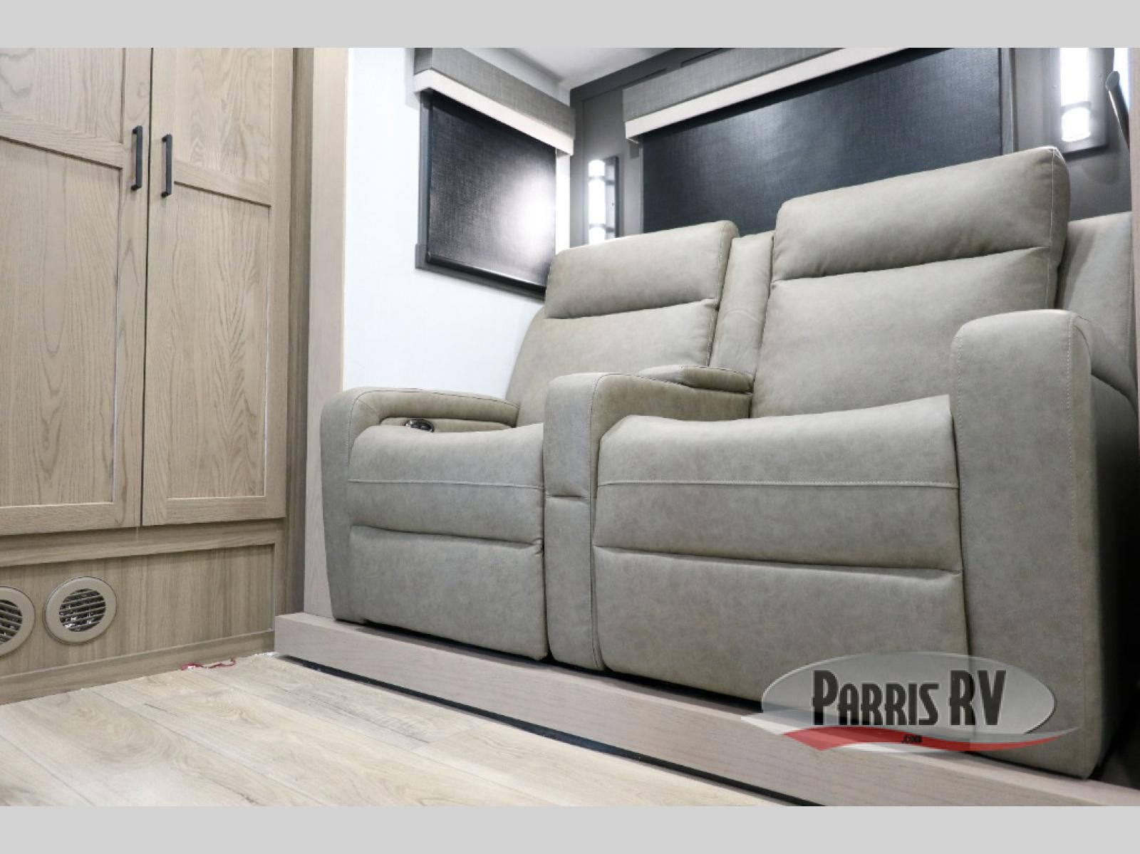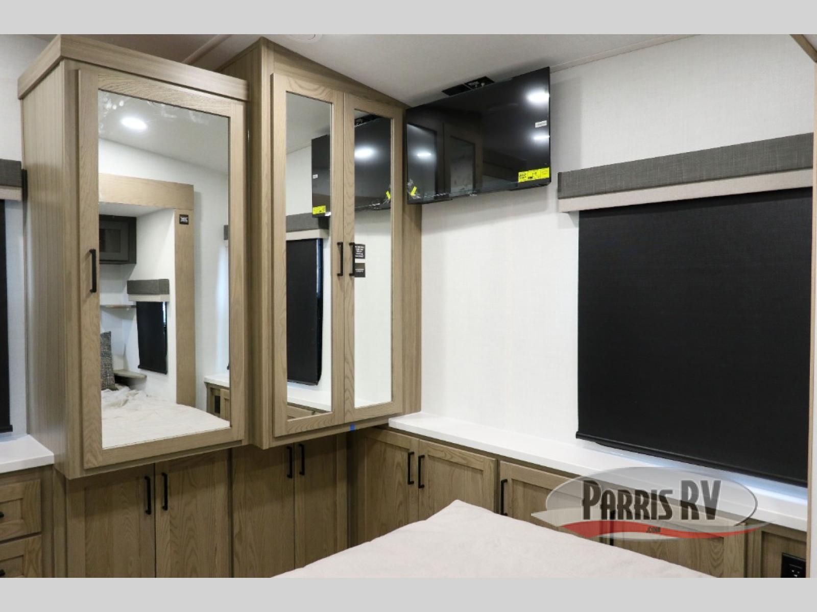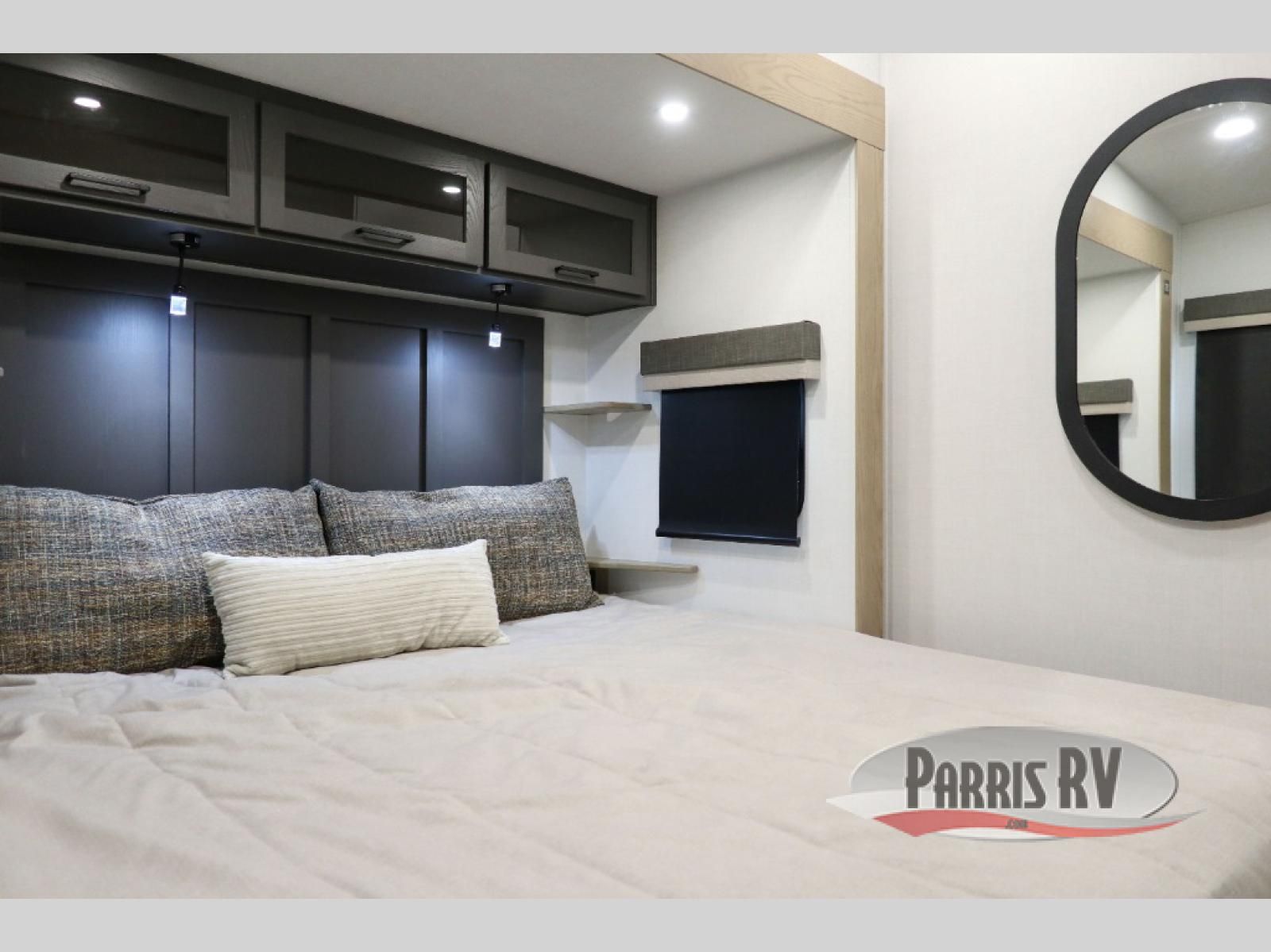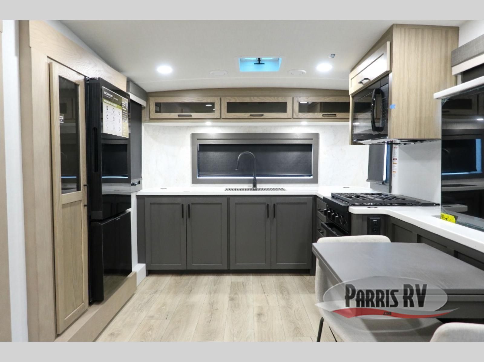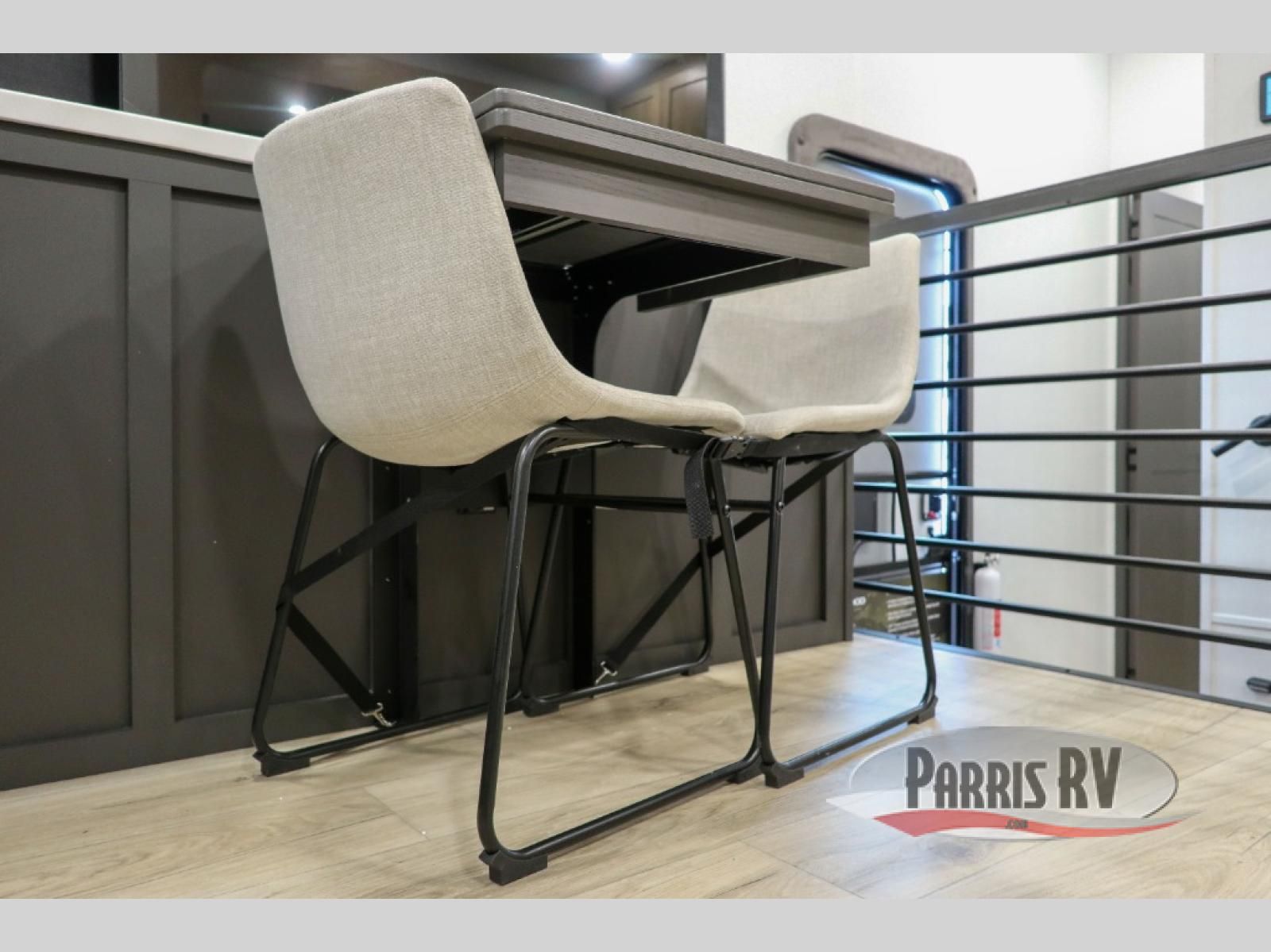 Premium amenities and a serene atmosphere make this fifth wheel your home away from home. The rear bedroom is a peaceful retreat, featuring a queen bed, spacious wardrobe, and a washer and dryer prep for added convenience. The full bathroom is a spa-like oasis, complete with a linen closet to keep your towels and toiletries organized. The theater seat is the perfect spot to relax and unwind, while the table & chairs with a leaf provide a comfortable space for meals and conversation. The televator TV is a sleek and modern touch, perfect for enjoying your favorite shows or movies. The pantry serves as a convenient storage space for your food and cooking essentials, while the fridge, microwave, and overhead cabinets provide ample space for meal preparation. The front countertop is the perfect spot to whip up a quick snack or breakfast.