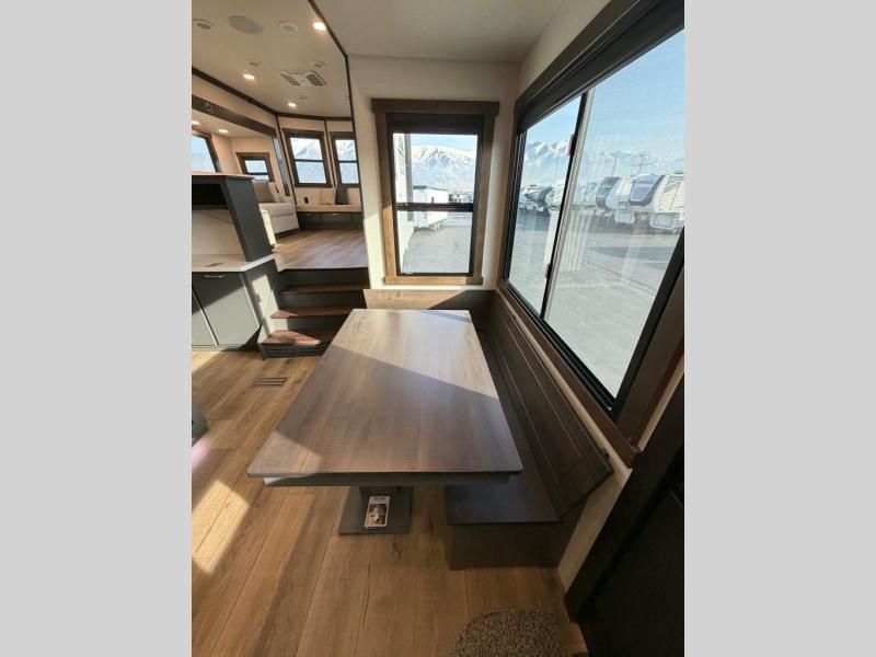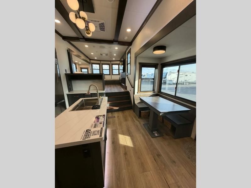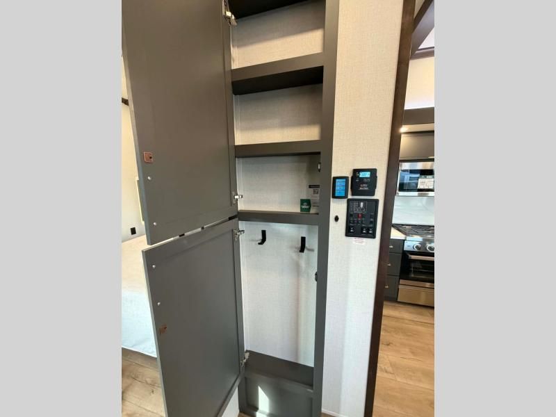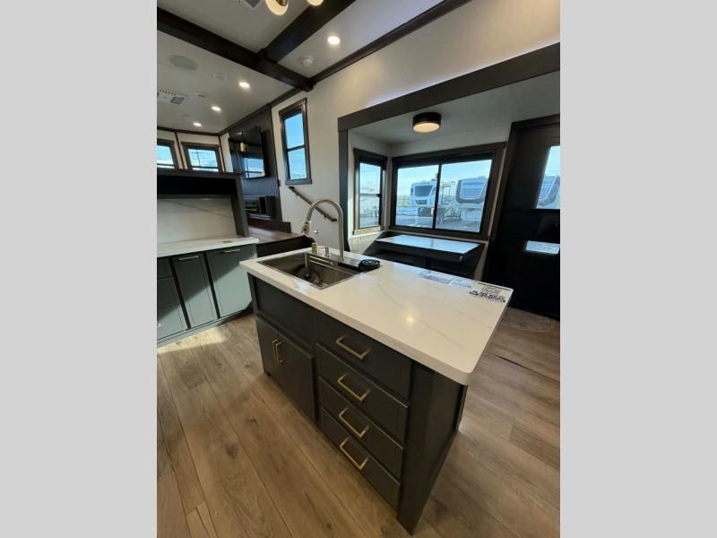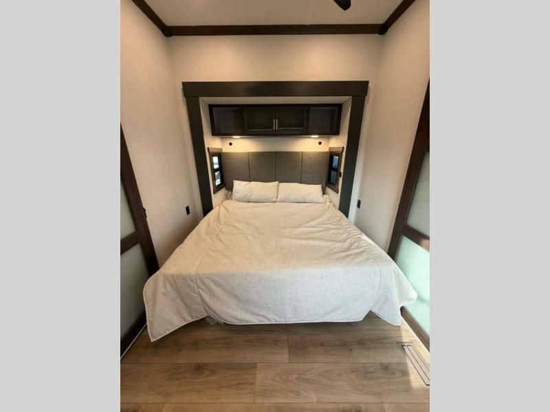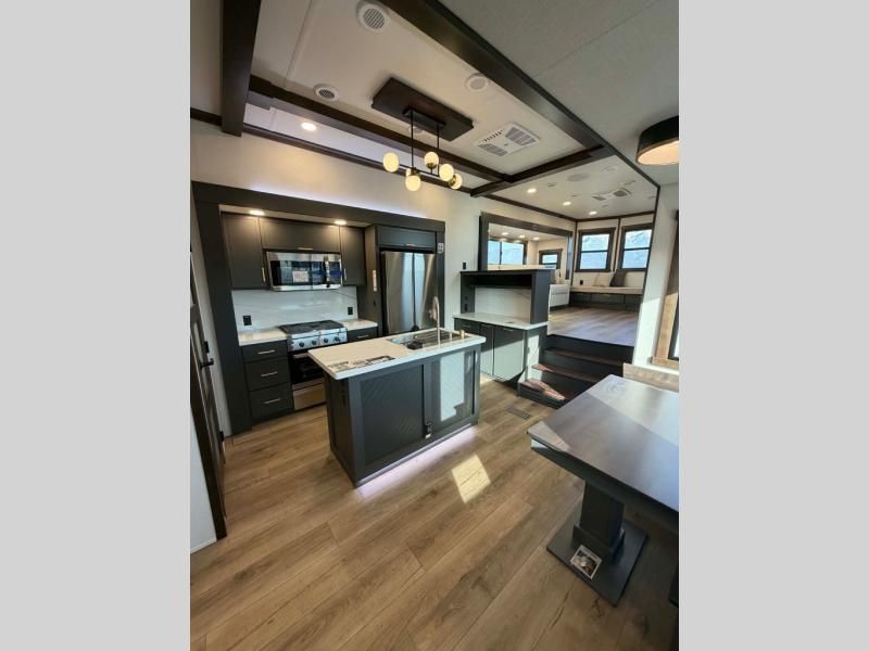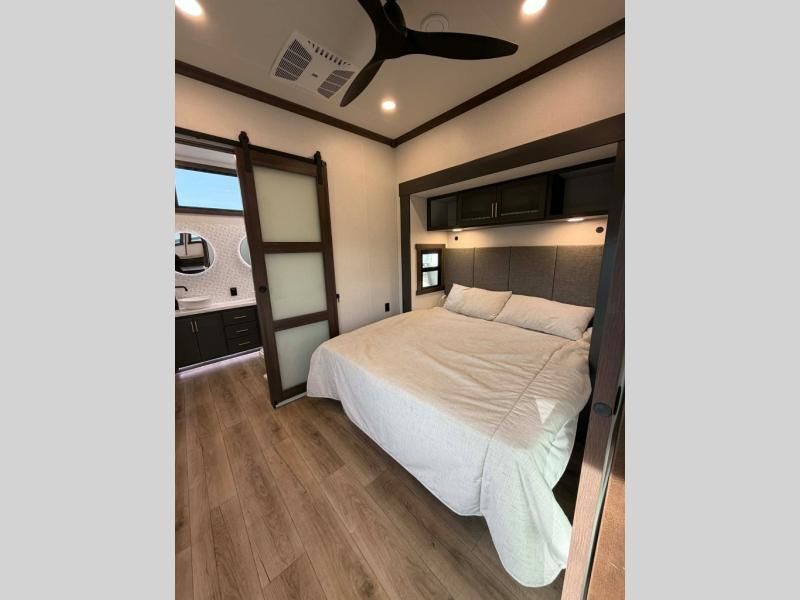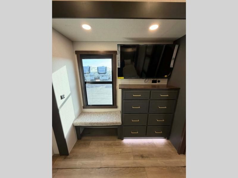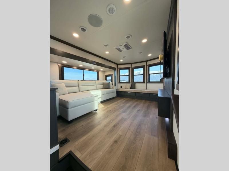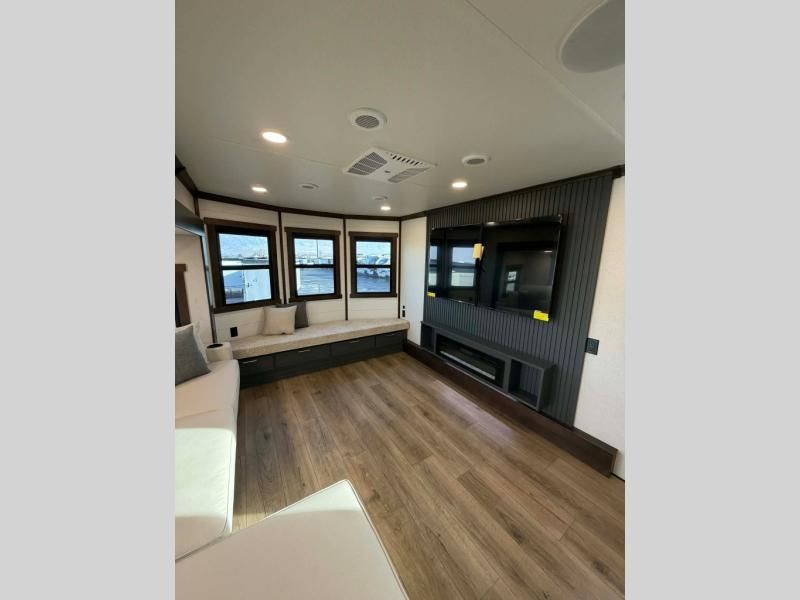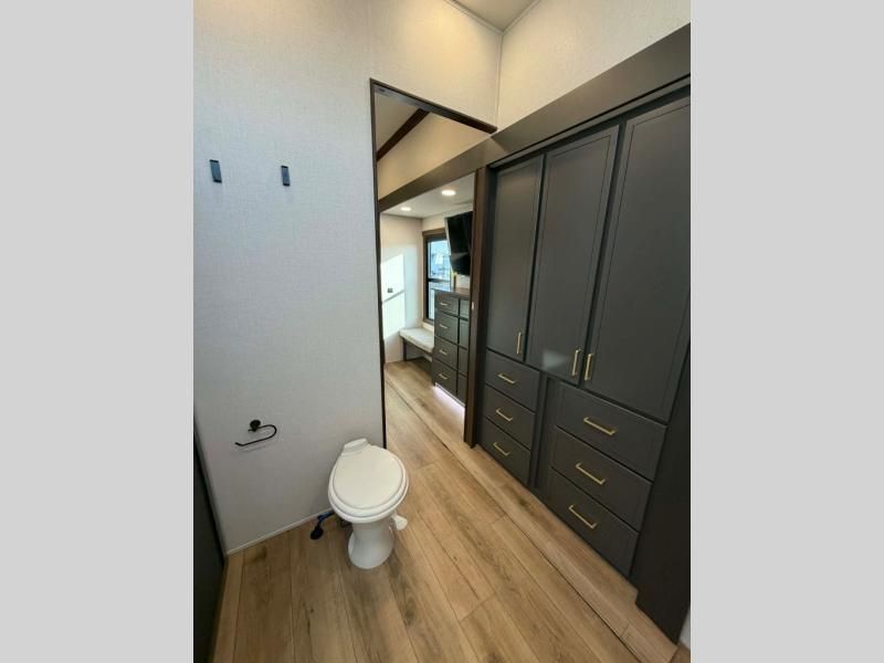 Unwind and refresh in this serene space of the rear bathroom, featuring dual sinks and a spacious linen closet for added convenience and storage. Drift off to sleep surrounded by peaceful surroundings in the private bedroom, complete with a plush king bed, an elegant dresser, and a stunning TV mounted above. The kitchen is a culinary haven, equipped with ample overhead cabinets, a convenient microwave, and a spacious fridge. The ample pantry and second pantry offer ample storage for your favorite ingredients and snacks. Plus, you can enjoy meals with loved ones at the table with swivel chairs! Also, the coat closet and half bath add a touch of practicality, making this fifth wheel perfect for everyday living or extended adventures. The front living room is a vibrant gathering space, featuring a comfortable sectional sofa and a cozy fireplace so you can snuggle up and enjoy quality time with family and friends while watching your favorite shows on the TV!