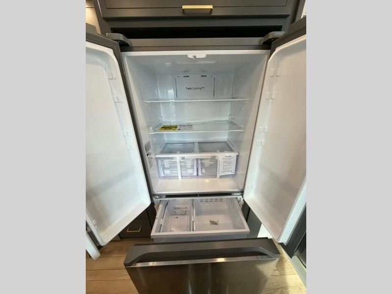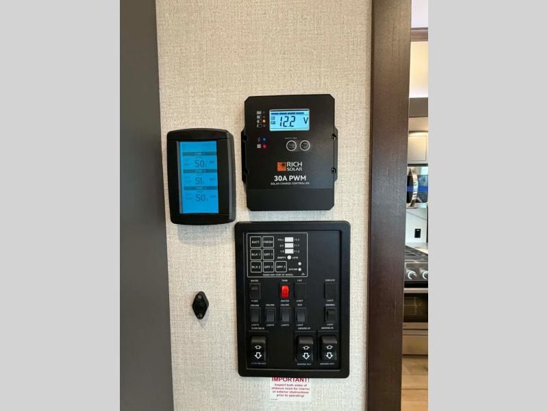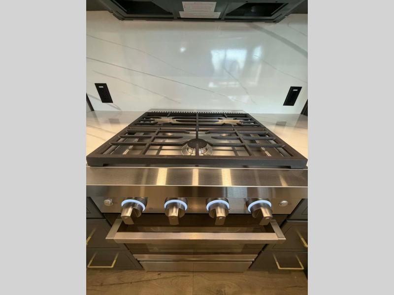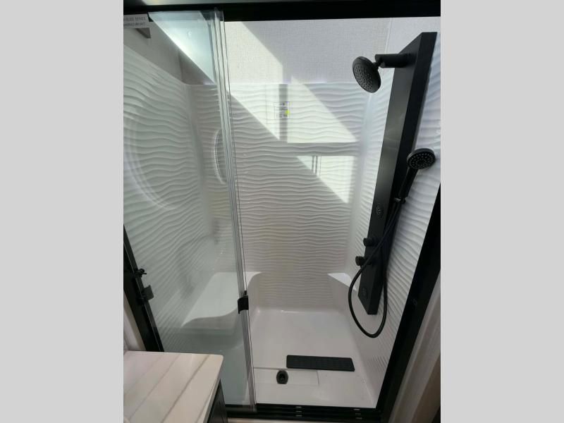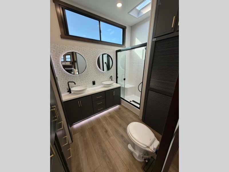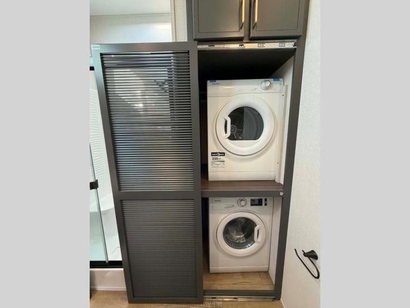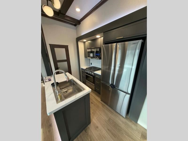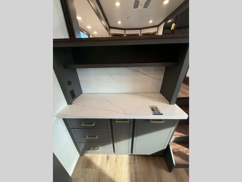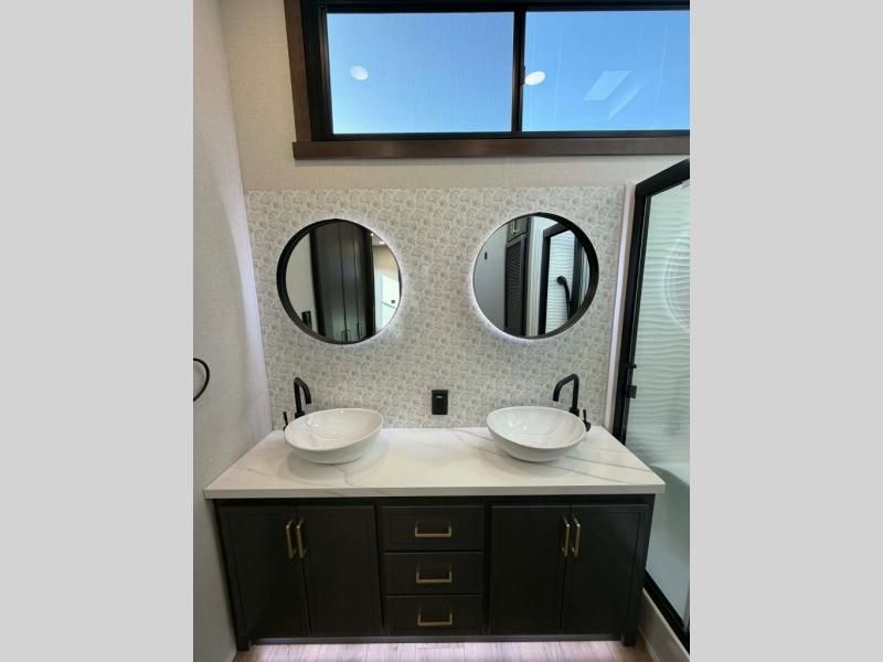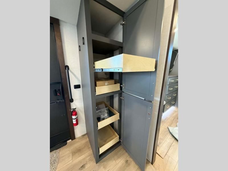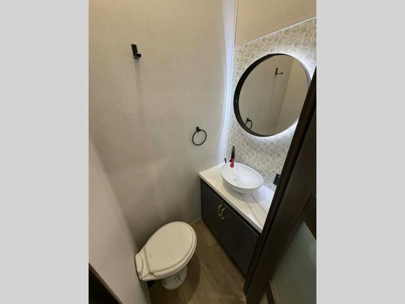 Unwind and refresh in this serene space of the rear bathroom, featuring dual sinks and a spacious linen closet for added convenience and storage. Drift off to sleep surrounded by peaceful surroundings in the private bedroom, complete with a plush king bed, an elegant dresser, and a stunning TV mounted above. The kitchen is a culinary haven, equipped with ample overhead cabinets, a convenient microwave, and a spacious fridge. The ample pantry and second pantry offer ample storage for your favorite ingredients and snacks. Plus, you can enjoy meals with loved ones at the table with swivel chairs! Also, the coat closet and half bath add a touch of practicality, making this fifth wheel perfect for everyday living or extended adventures. The front living room is a vibrant gathering space, featuring a comfortable sectional sofa and a cozy fireplace so you can snuggle up and enjoy quality time with family and friends while watching your favorite shows on the TV!