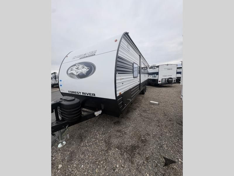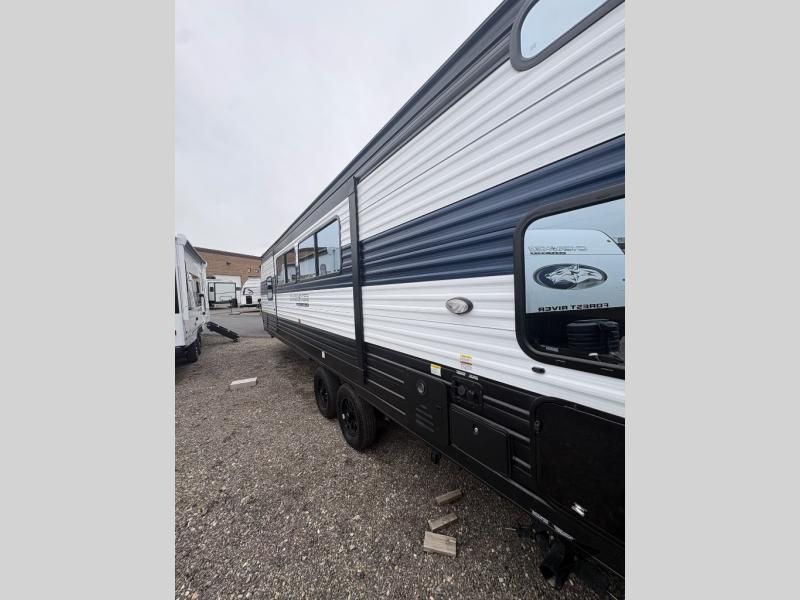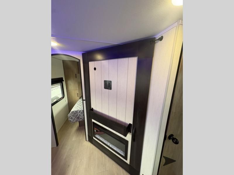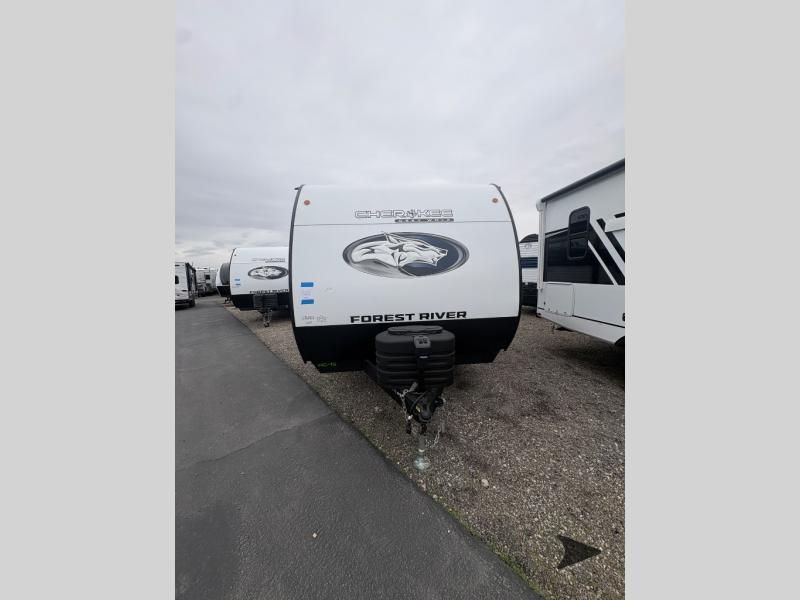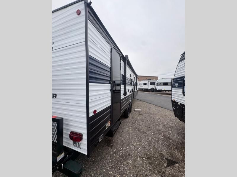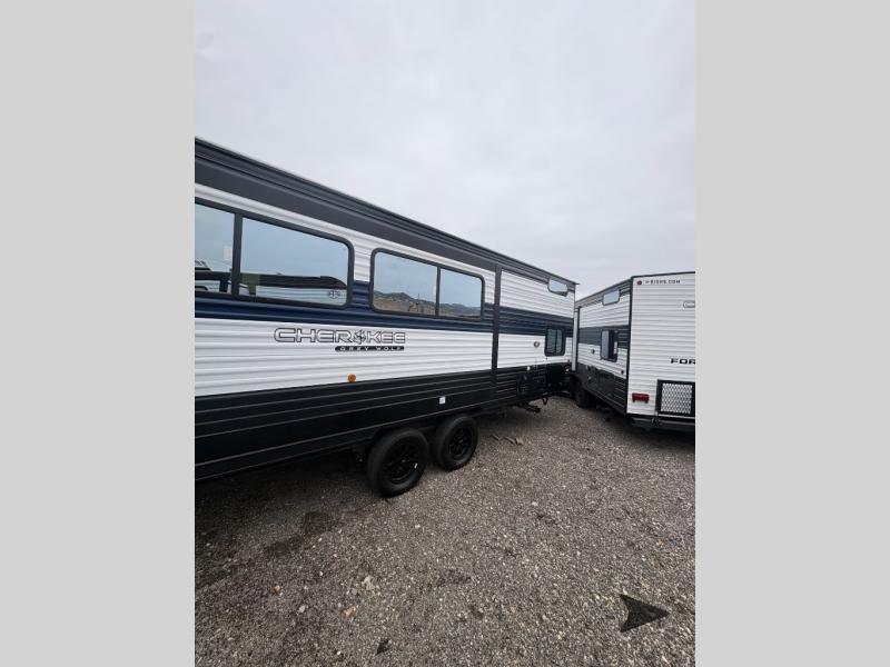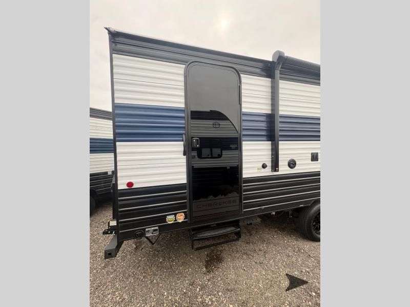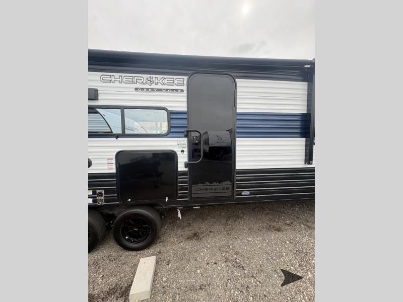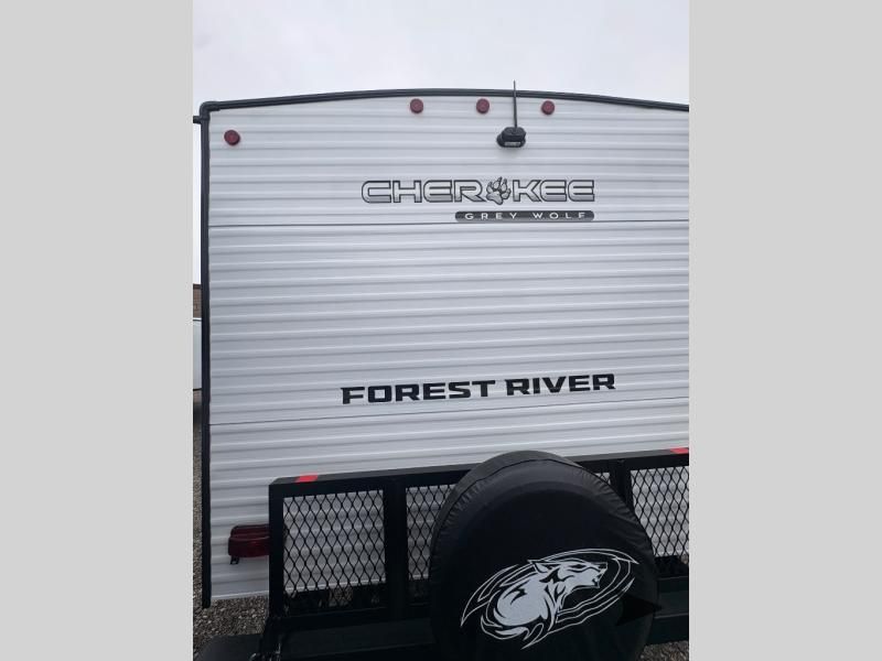 Forest River Cherokee Grey Wolf travel trailer 26KF highlights: Double-Size Bunks Dual Entry Doors RV King Bed Outdoor Kitchen Outside Storage If you've been searching for a travel trailer with a larger sleeping capacity to camp with friends, this is the one! There are double-size bunks in the rear corner, and the full bath with its own exterior entry door is in the other rear corner for easy nighttime use. Up front, an RV king bed in the private bedroom is sure to bring a great night's rest, and you'll find a bedside wardrobe to keep your clothes picked up off of the floor. In the morning, everyone can meet in the main living room that includes a large slide out, U-shaped dinette, sofa, and a fireplace with a hidden pantry behind it for smart storage solutions. An outside kitchen will allow you to get some fresh air as you make dinner, but there's also a full interior kitchen if the weather isn't cooperating. Additional outdoor features include a rear storage rack, an outside TV mount, and a 15' awning for some shade! The Cherokee Grey Wolf by Forest River feature distinctive features, at-home comforts, and durable construction materials so you can enjoy your RV for years to come, plus they are outstandingly affordable! You can choose between travel trailers, toy haulers, and even fish houses, depending on the camping style you prefer. You'll find many convenient amenities both inside and outside, along with comfortable seating and sleeping spaces, and plenty of storage for your personal belongings and camp gear!
