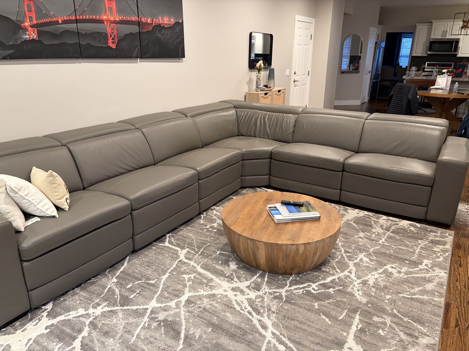VenmoBeautiful grey leather Ashley furniture sectional. 2 sections have power recliners, headrests come up on each seat. Power charger ports at each end of the sectional. Most of the seats have been hardly sat in and look brand new. Paid over $7000 new. 150” x 120” x 40.