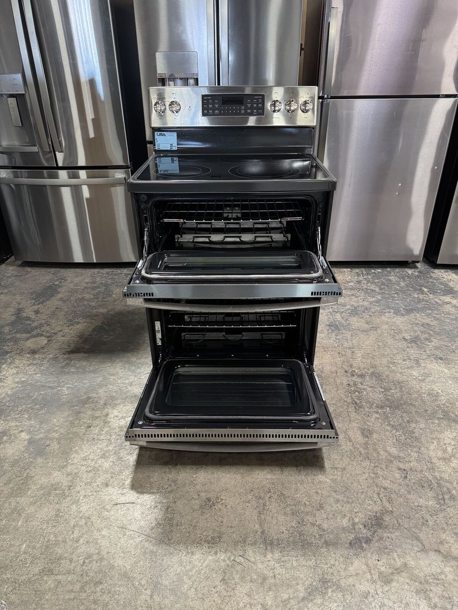30 Inch Electric Double Oven Range with 5 Radiant Elements, 6.6 Cu. Ft. Total Capacity, Ceramic Glass Smoothtop, Steam Clean, Power Boil Element, Warming Zone, Convection Oven, 8-Pass Bake Element, Fast Preheat, and Sabbath Mode: Stainless Steel