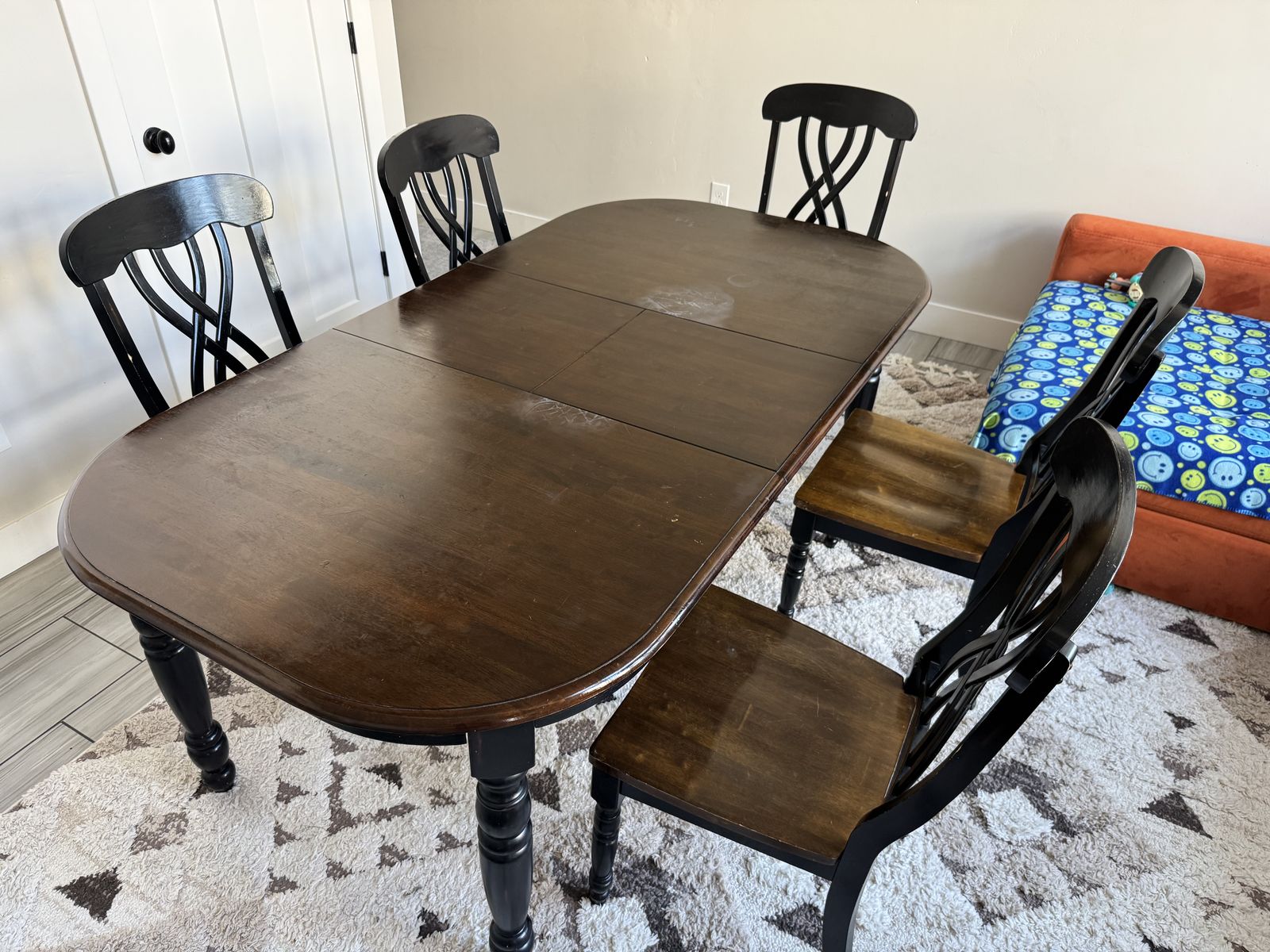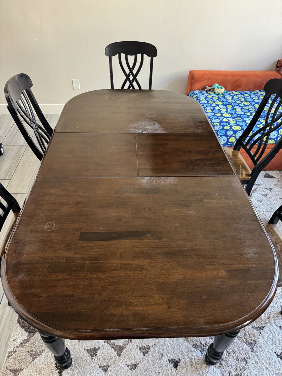 Gently used, clean, solid wood dining table. Extended length 77” Without extension 60”. Height 30-31” Depth 42”. Some watermarks on top of the table, otherwise in a good shape.