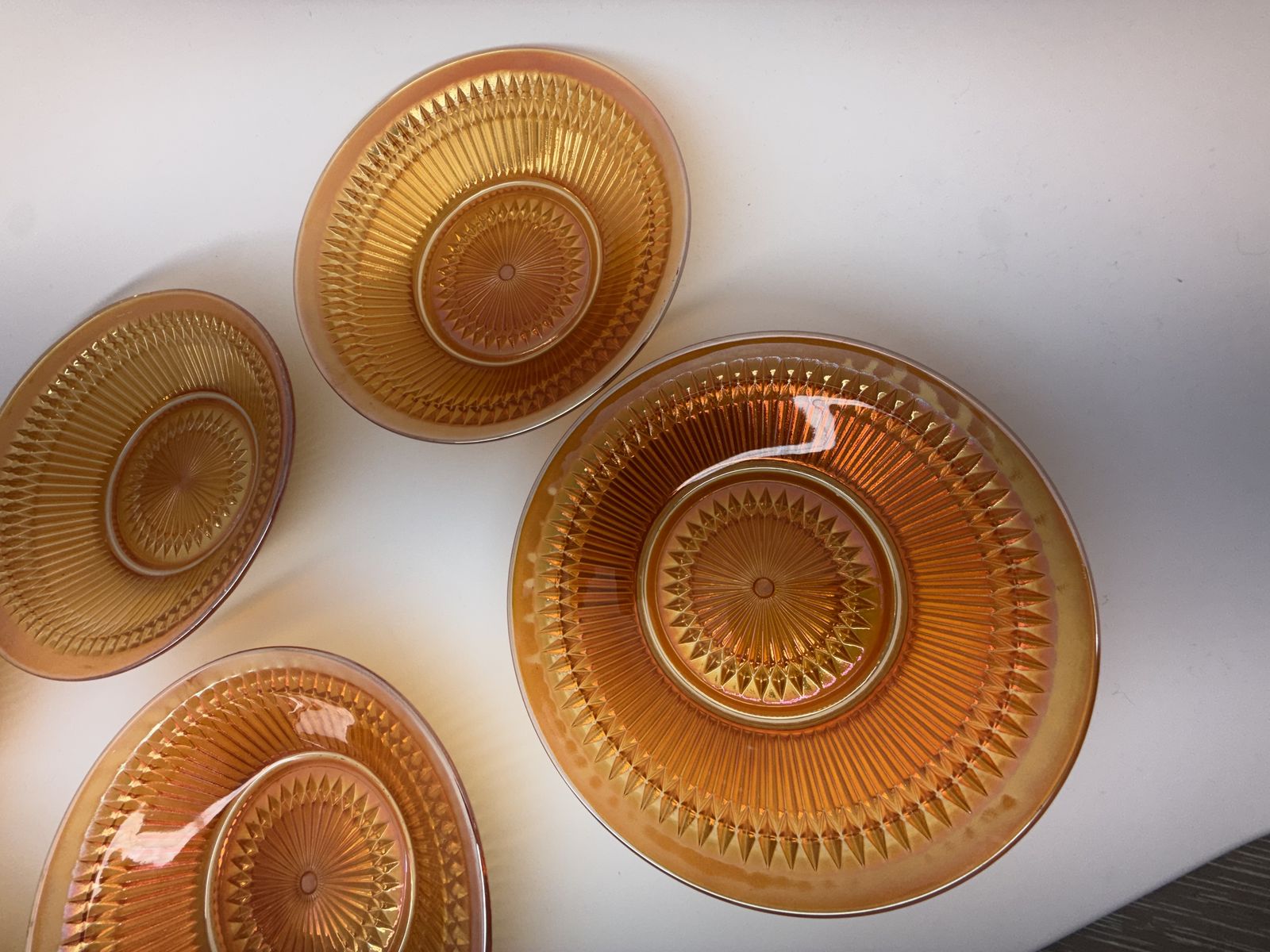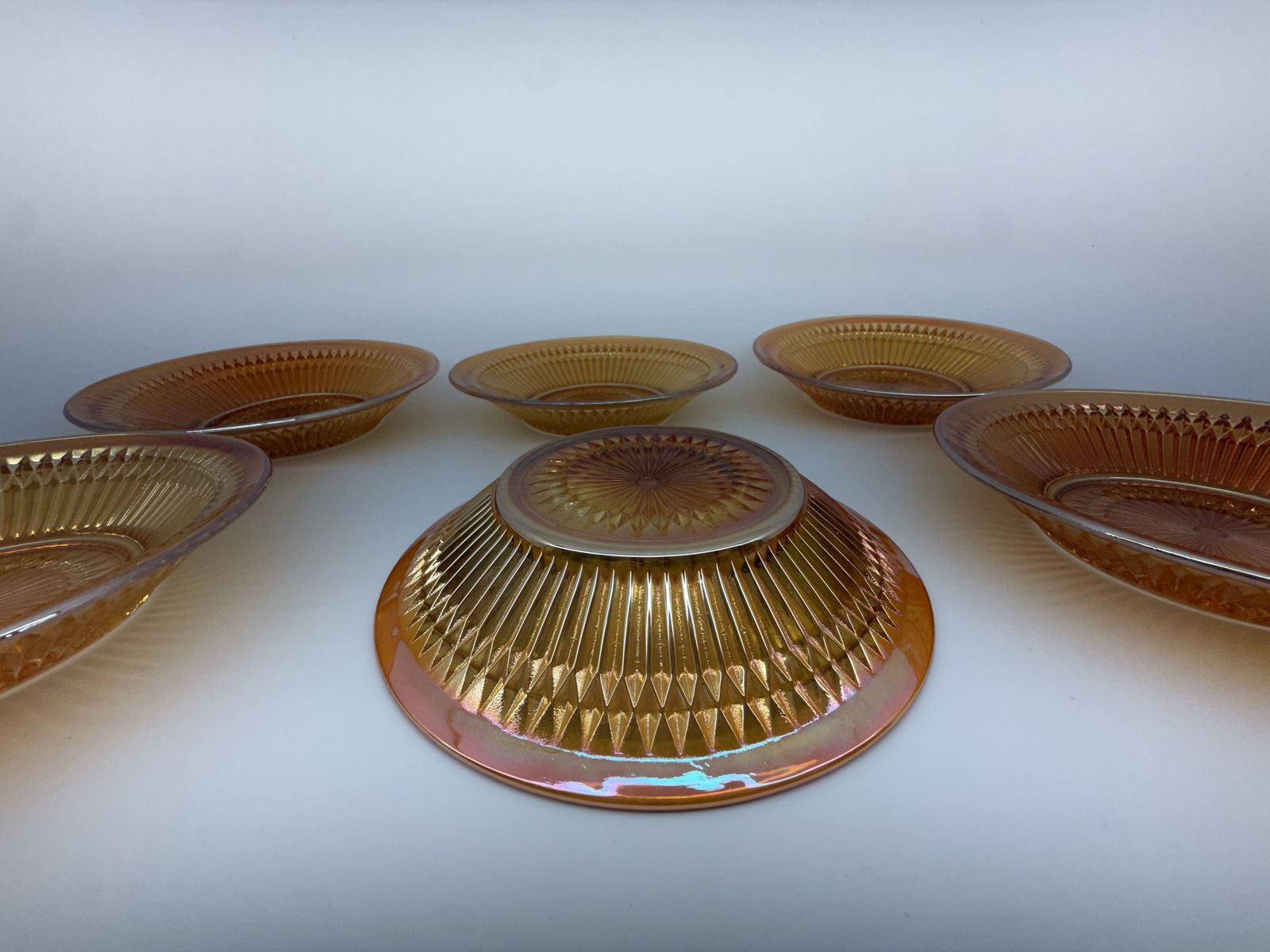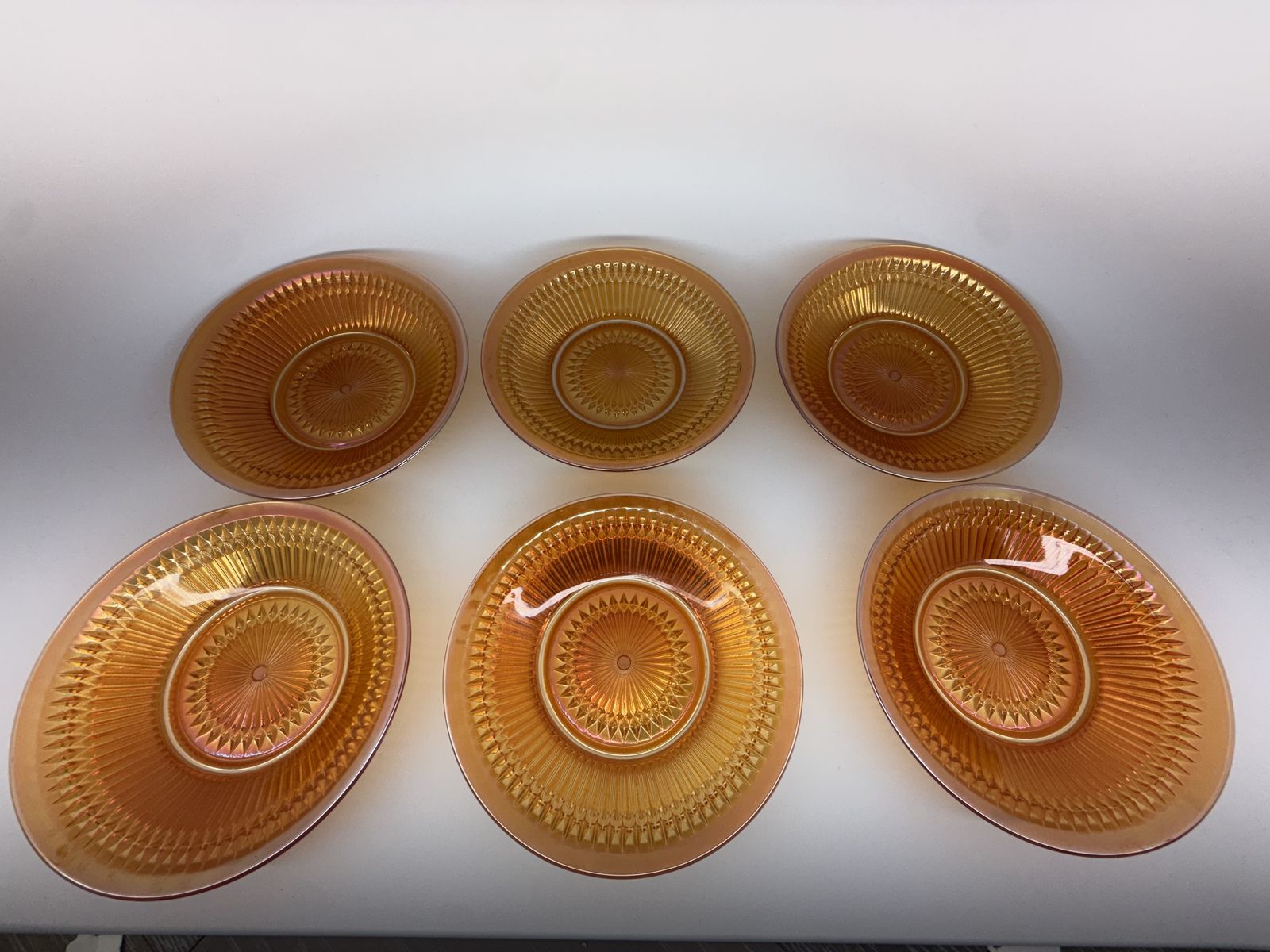 ApplePaySet of six vintage Jeannette Glass “Anniversary” pattern bowls in marigold carnival glass. Features the iconic radiating geometric design with brilliant iridescent finish.