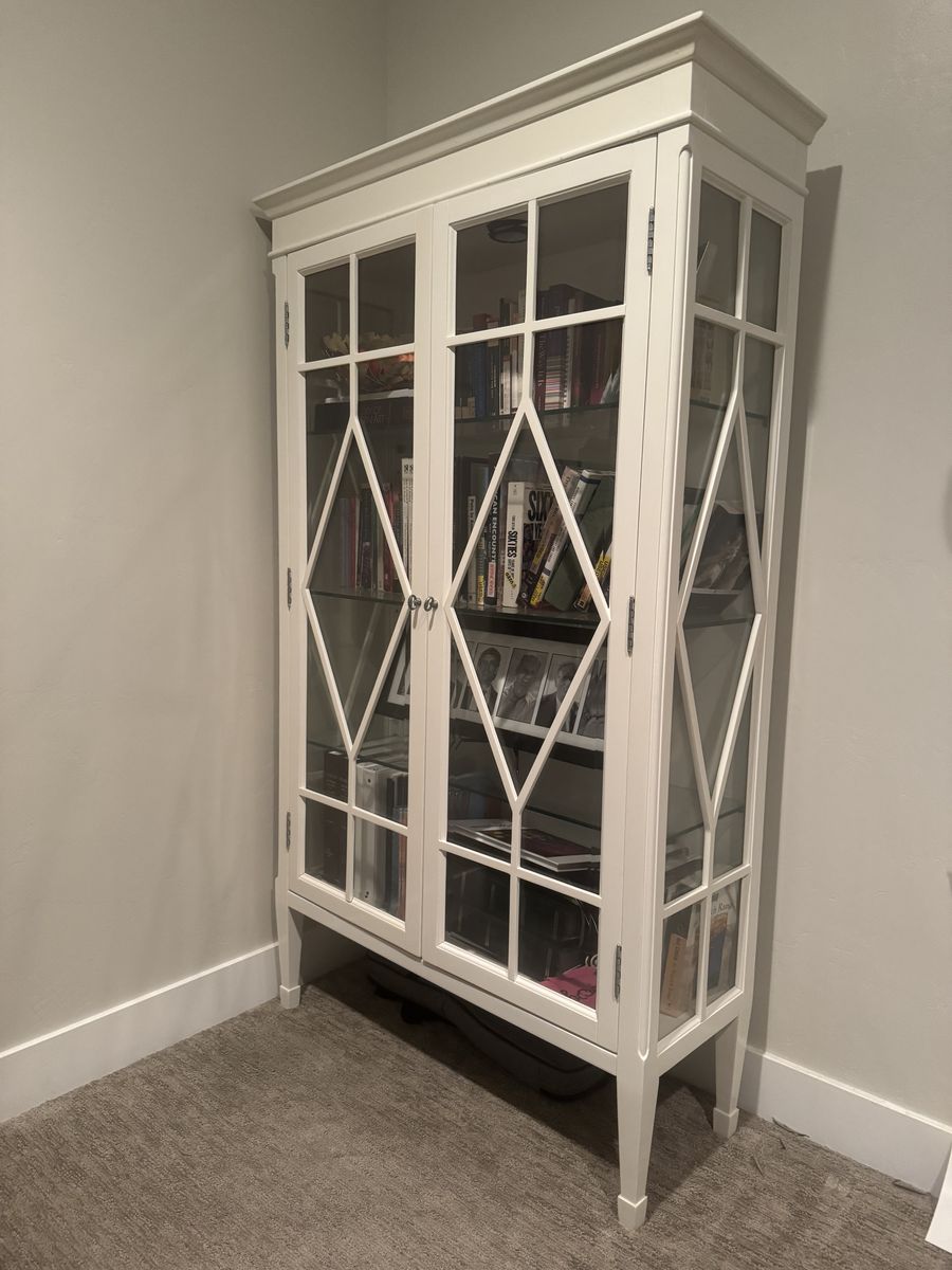 Venmo40 in wide, 15 in deep, 67.5 in tall. Set of 2 for $900 or $500 each. Solid and very nice quality with glass door and shelves. Each cabinet is lit and plugs in. The doors have magnet closures-one door's magnets doesn't always seal shut without extra attention. Beautiful, big piece of furniture. A classic style that would blend seamlessly into any decor.