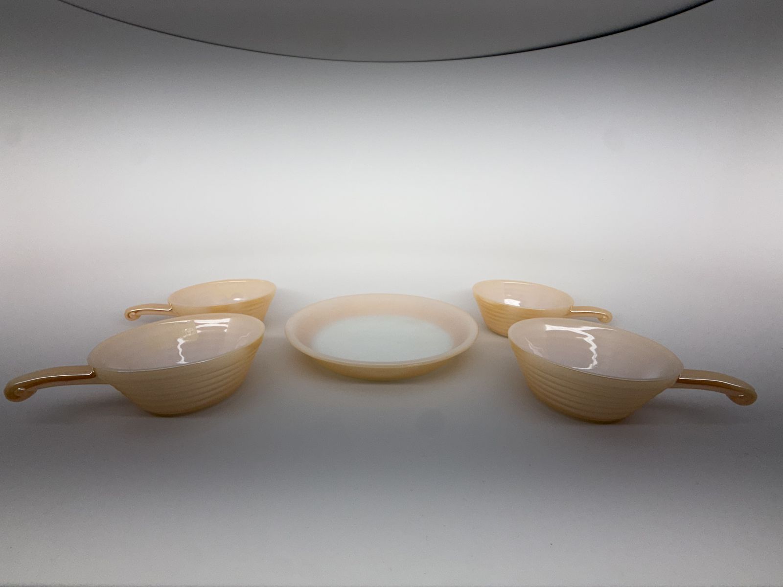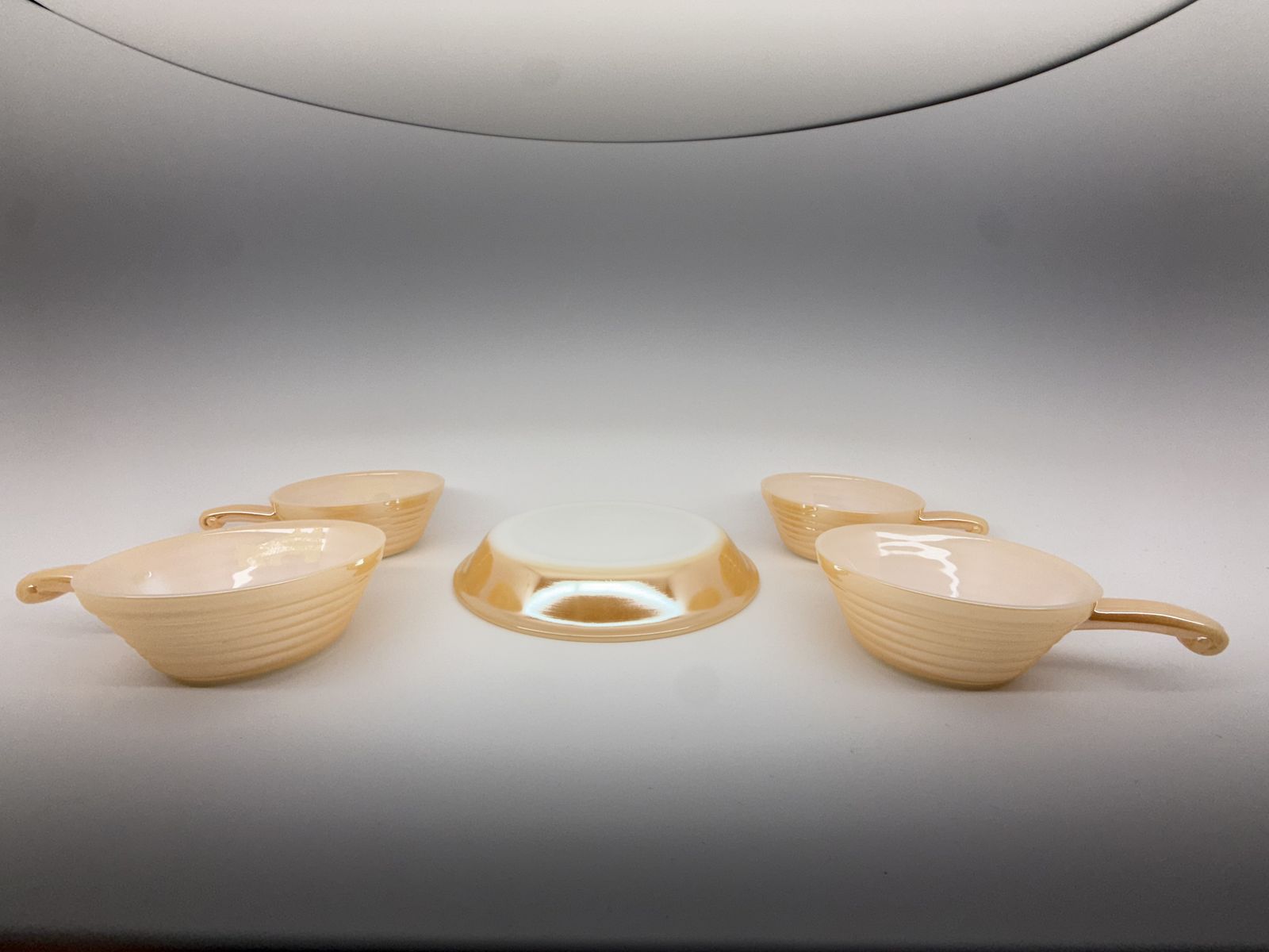 Includes four handled cream soup bowls and one matching pie / serving dish. Features the classic ribbed design with soft peach lustre gradient finish.