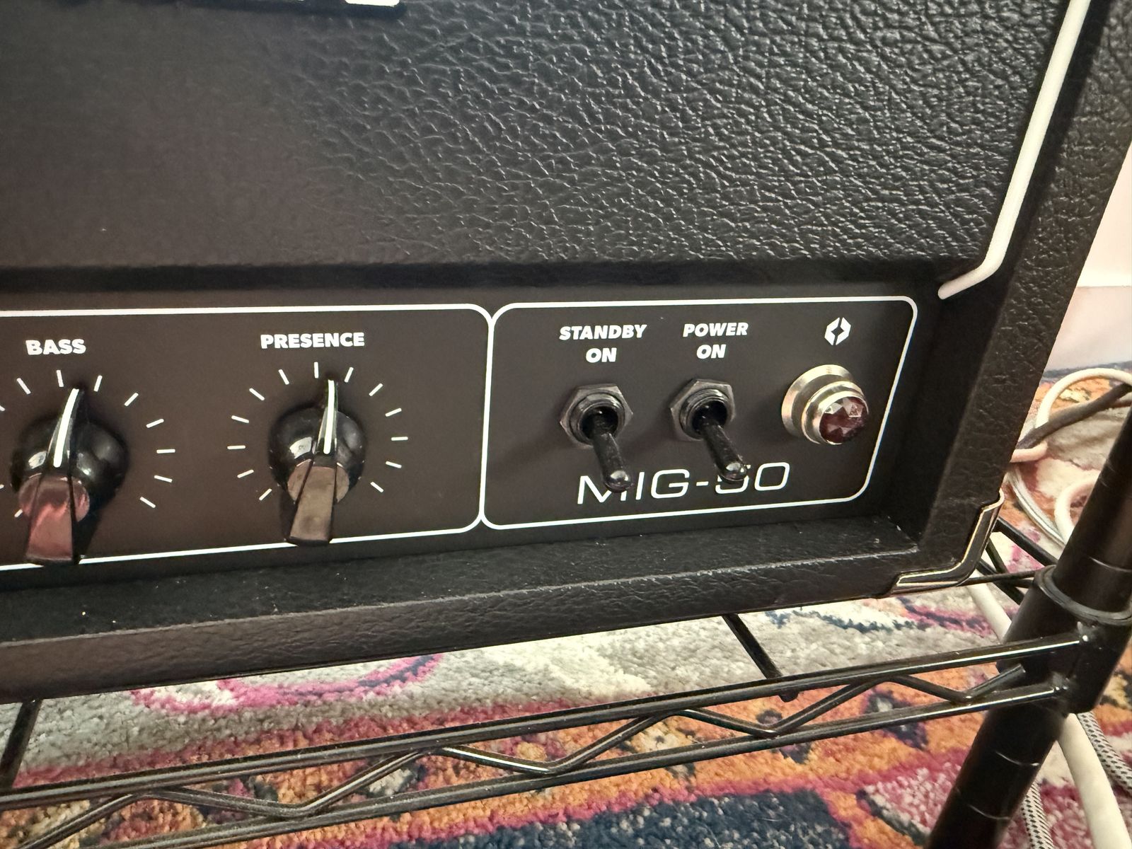 In brand new mint condition, never left my home studio. The EHX MIG-50 50W all-tube amp head. Based on the classic Sovtek MIG circuit and known for its big punchy tone, strong mids, and tons of clean headroom. Awesome pedal platform and sounds huge through a 2x12 or 4x12.