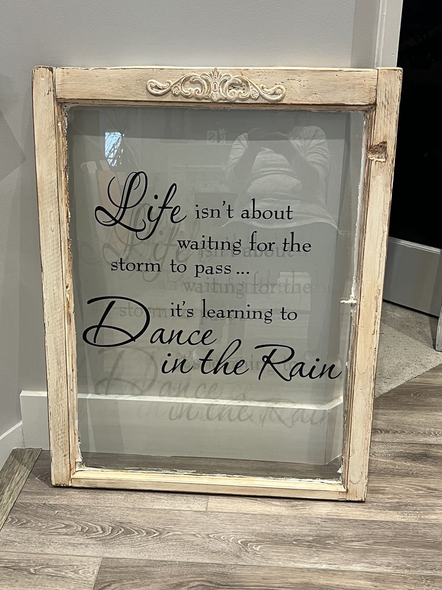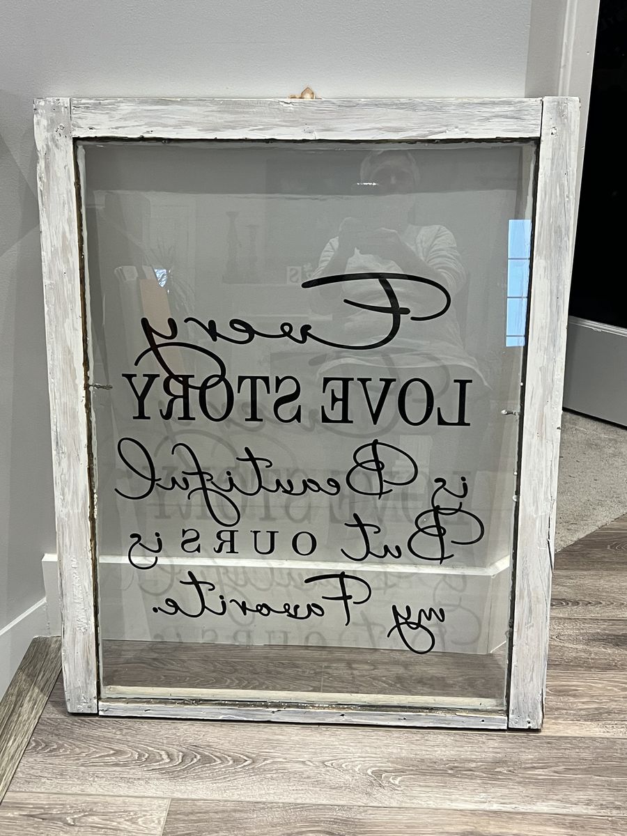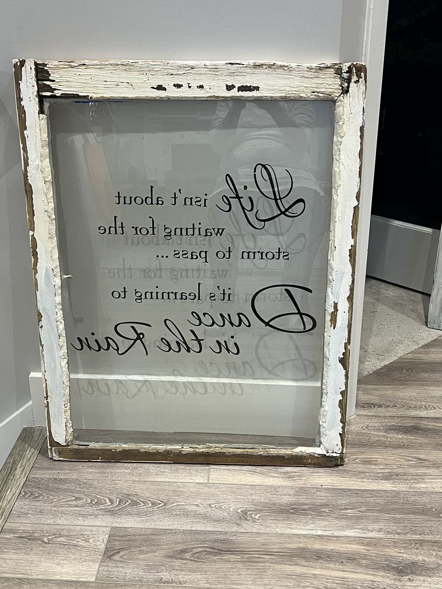 Old windows with vinyl lettering quotes.