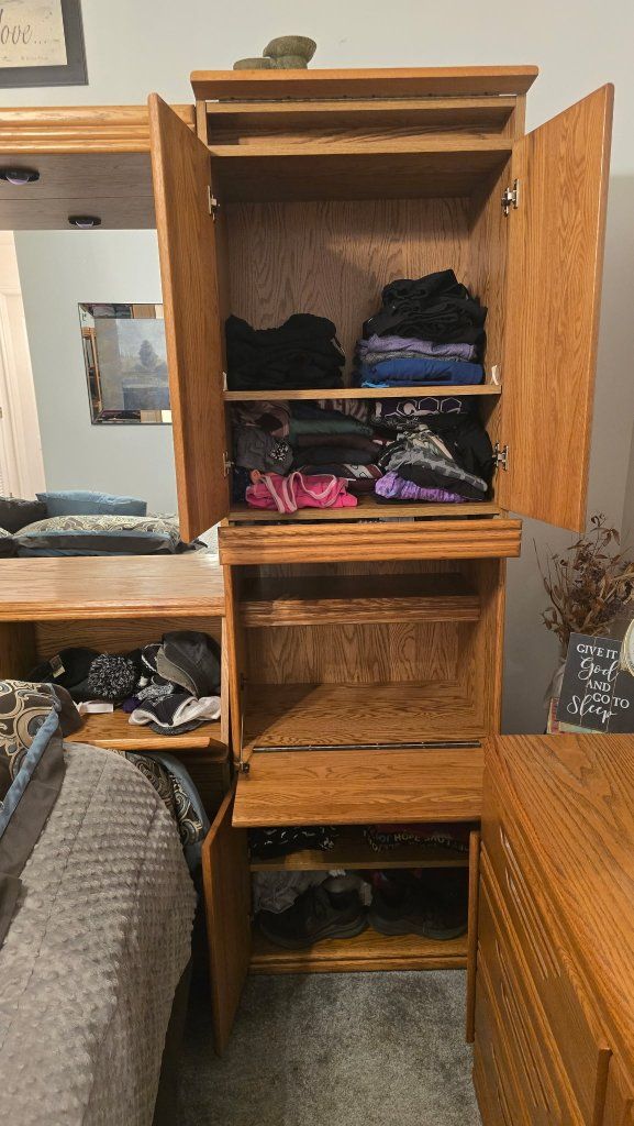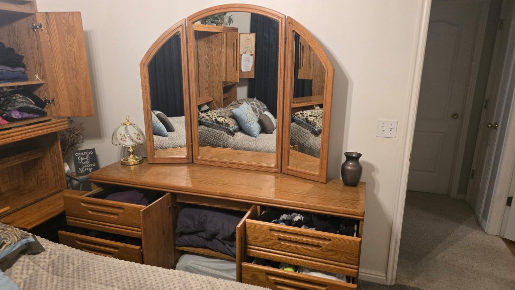 Lots of storage and a classic style that will last for years. All drawers open smoothly and everything is clean and well cared for. Even secret storage compartments! Many lights and mirrors. Plugs. Heavy Duty. Queen.